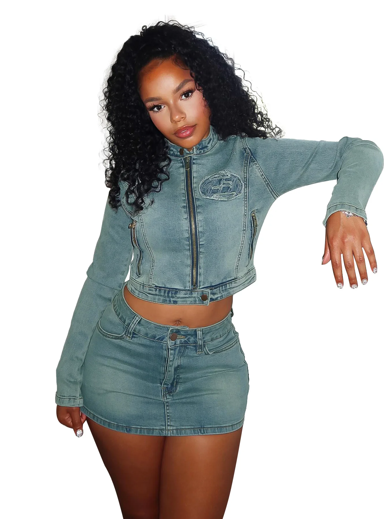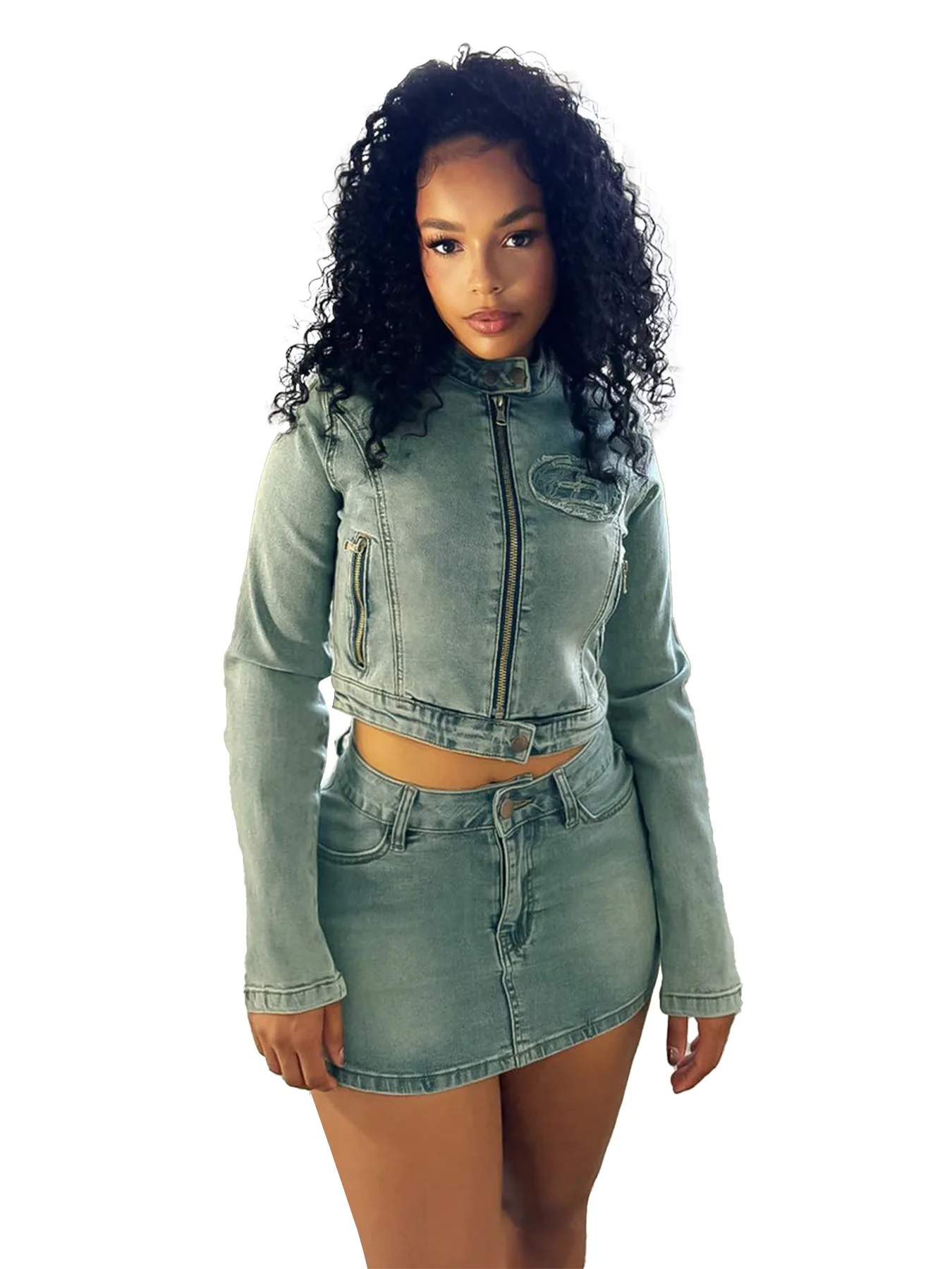 QueenLine 10pcs Zipper Jackets + Mini Skirts Bulk Items Wholesale Lots Elastic Embroidery Two Piece Denim Skirt Sets