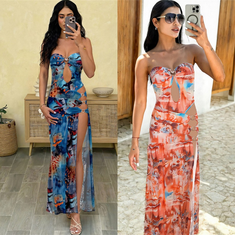 QueenLine 10pcs Wholesale Lots Sexy Strapless Printing Split Hollow Out Y2K Maxi Dress