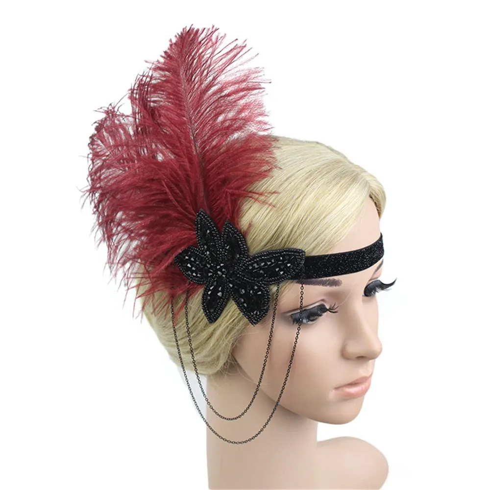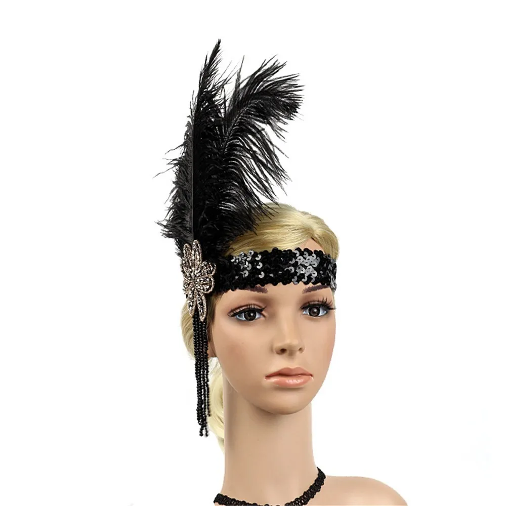 QueenLine 1920s Headpiece Feather Flapper Headband Great Gatsby Headdress Vintage
