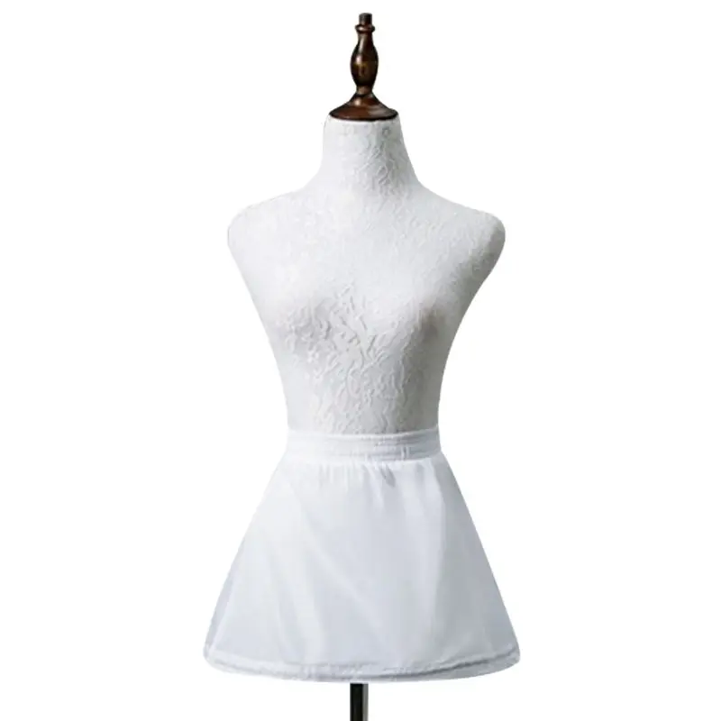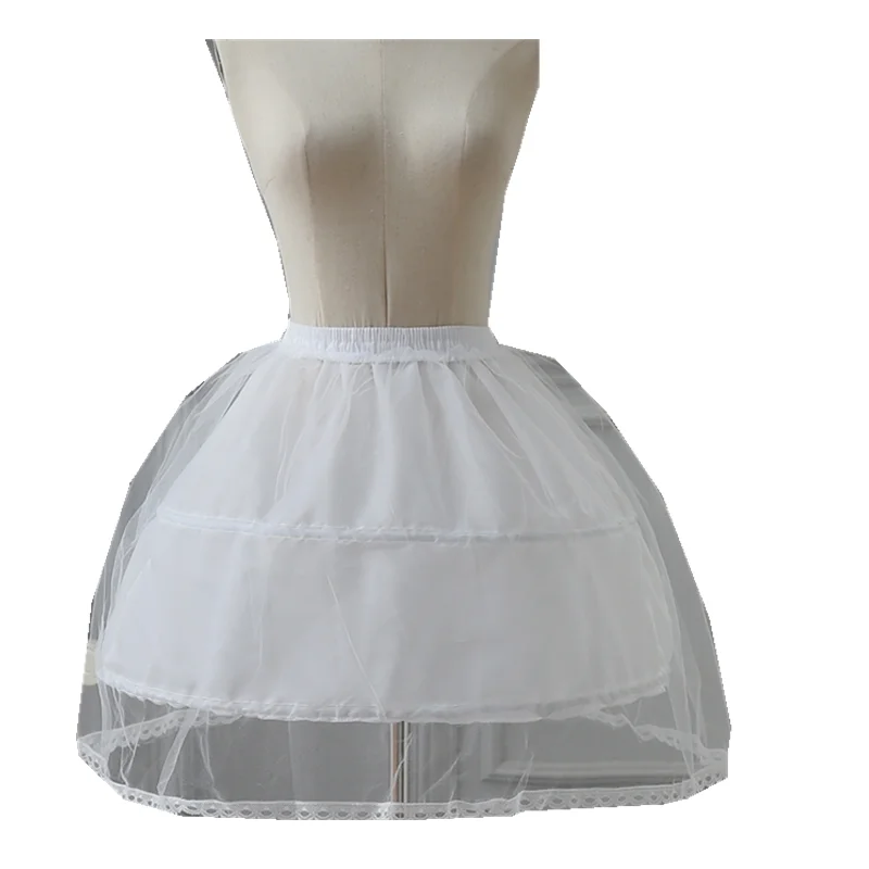 A-Line, 3 hoops, one layer, lace trim, white color, elastic drawstring waistband.
