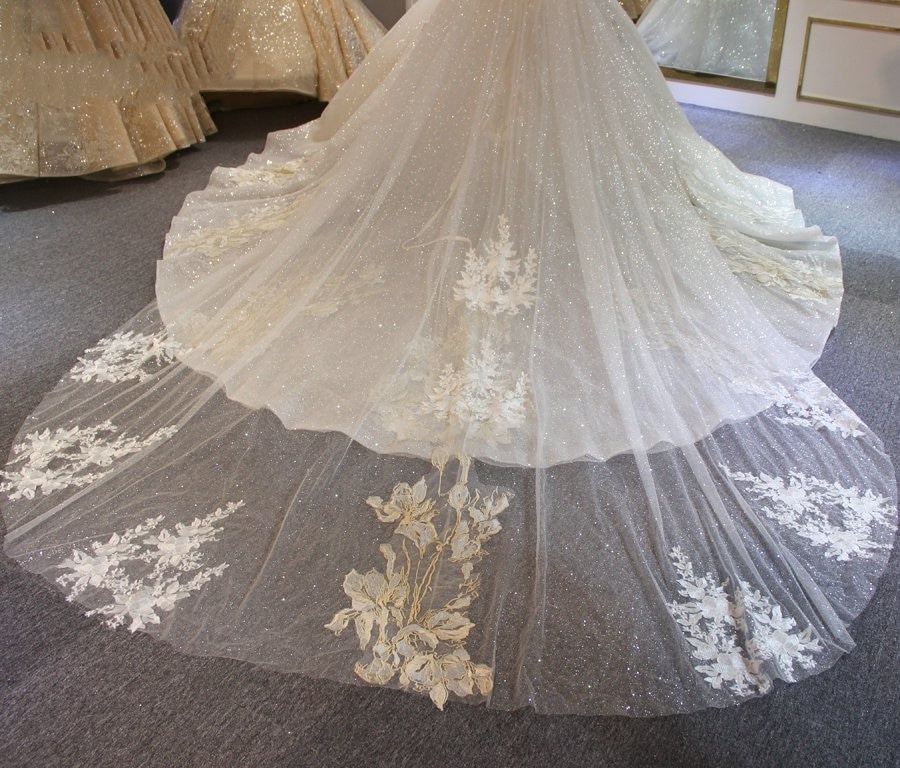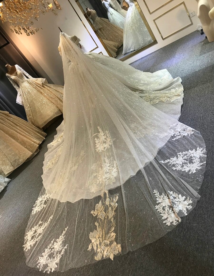the veil is 300cm width, then 400cm long, the fabrics is only 150cm width, so this is two same length fabrics sew together, so the middle have a small line.