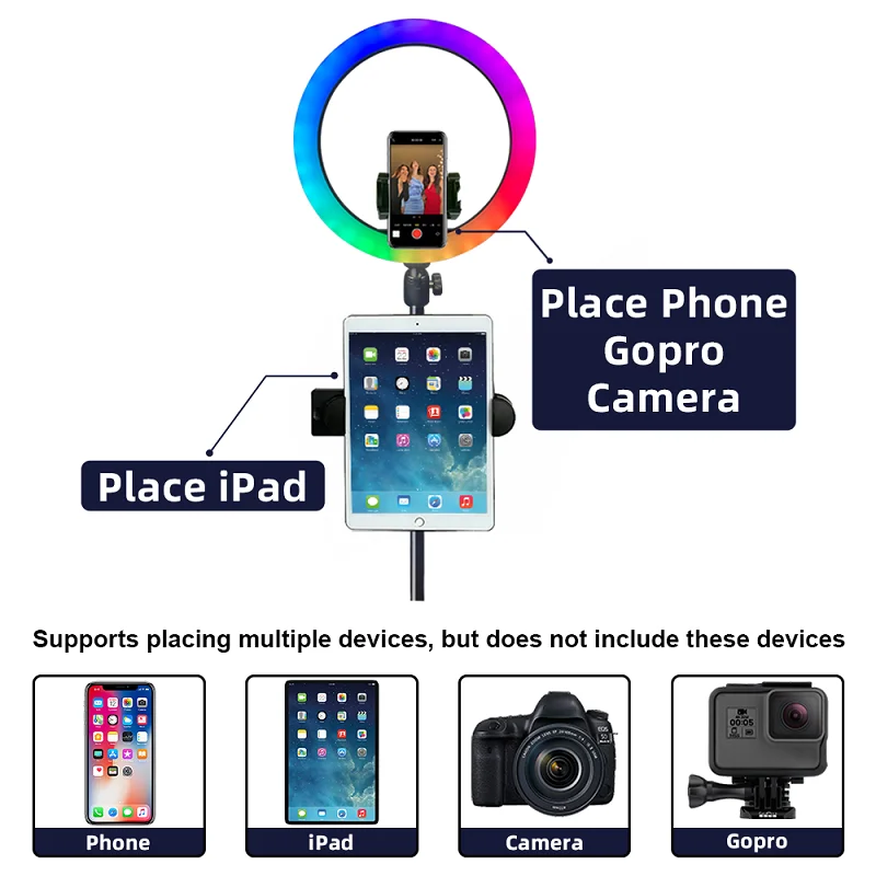 The portable charger for the ring light, the battery for the remote control, the devices of phone, camera, Gopro and tablets are all not included in the product.