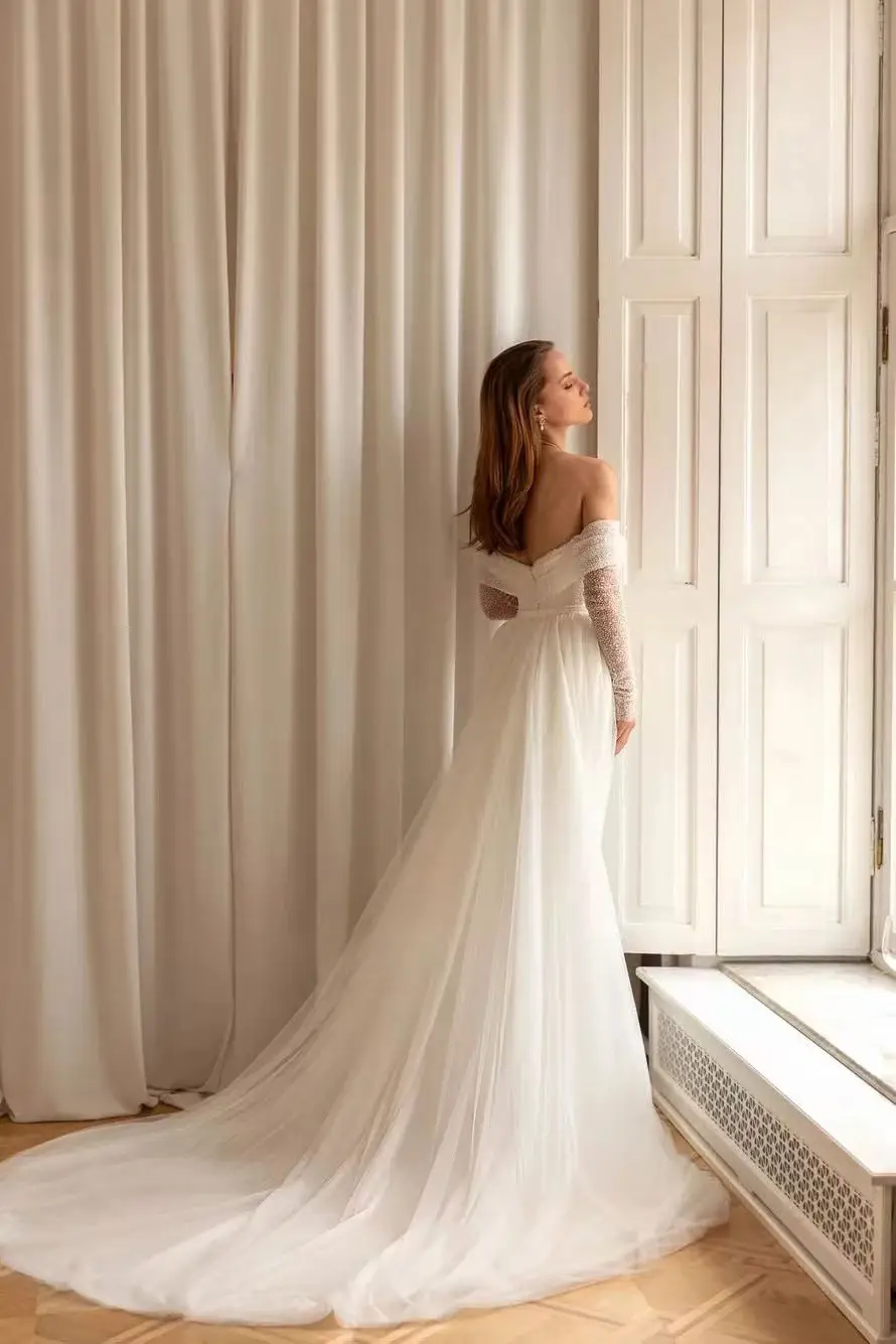 QueenLine Bling Sequined Off The Shoulder Full Sleeves Mermaid Detachable Train Wedding Dress
