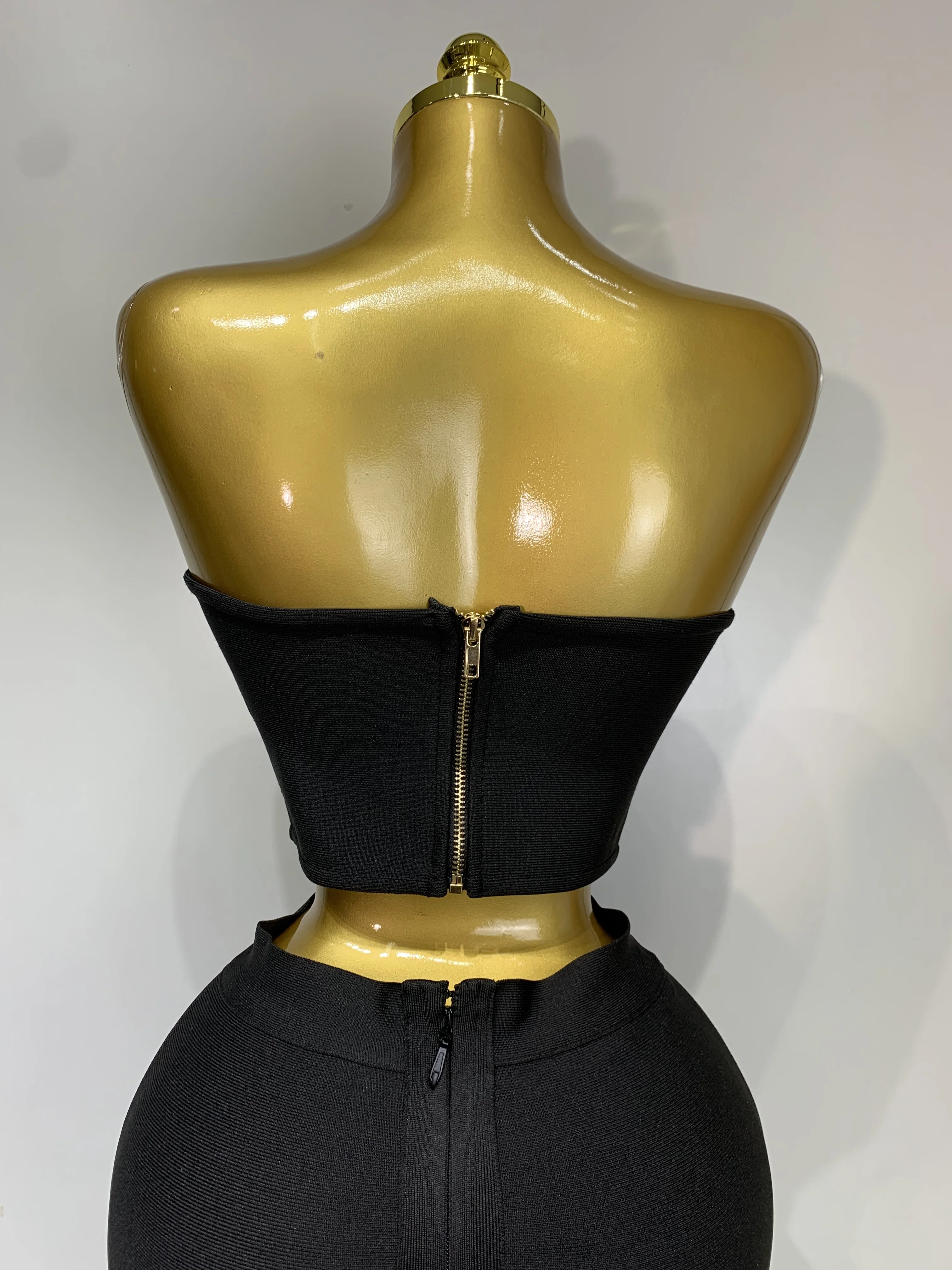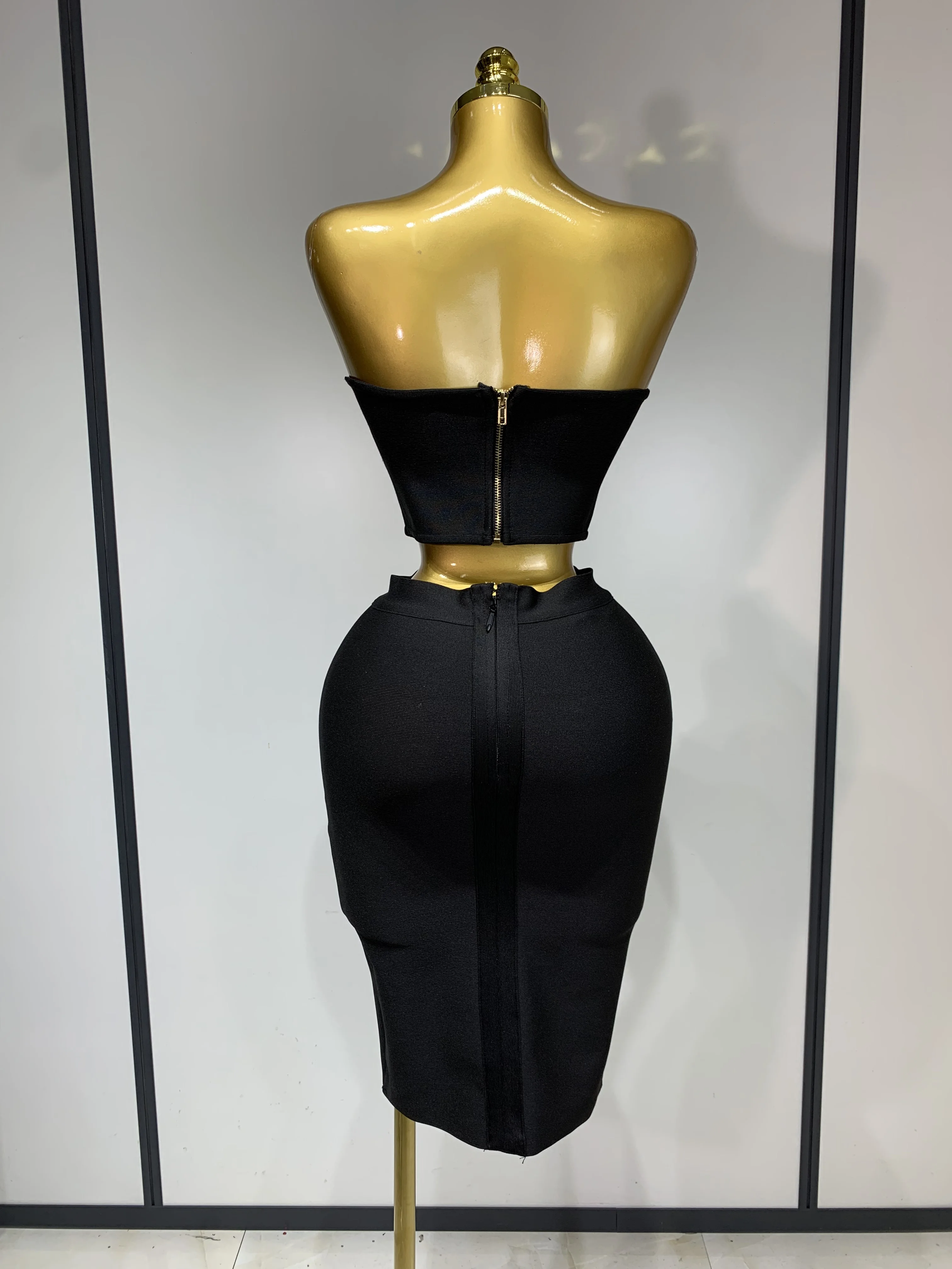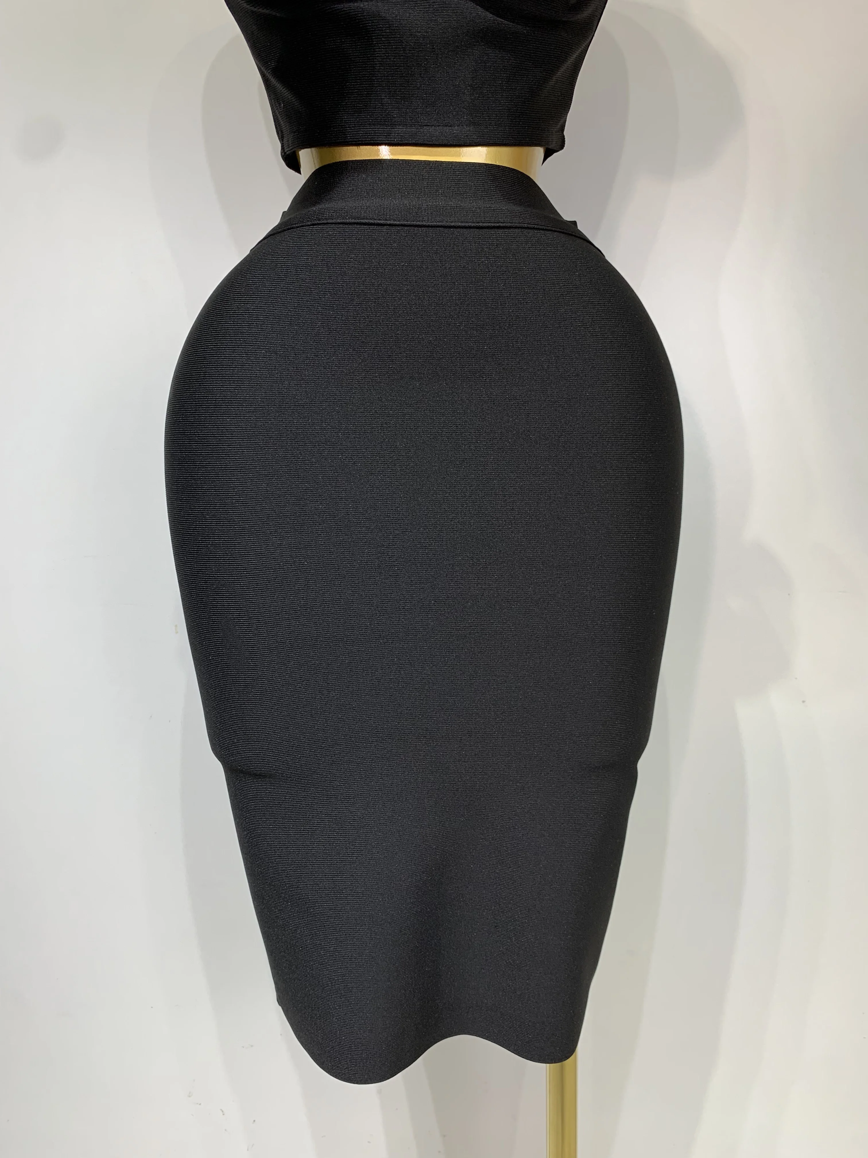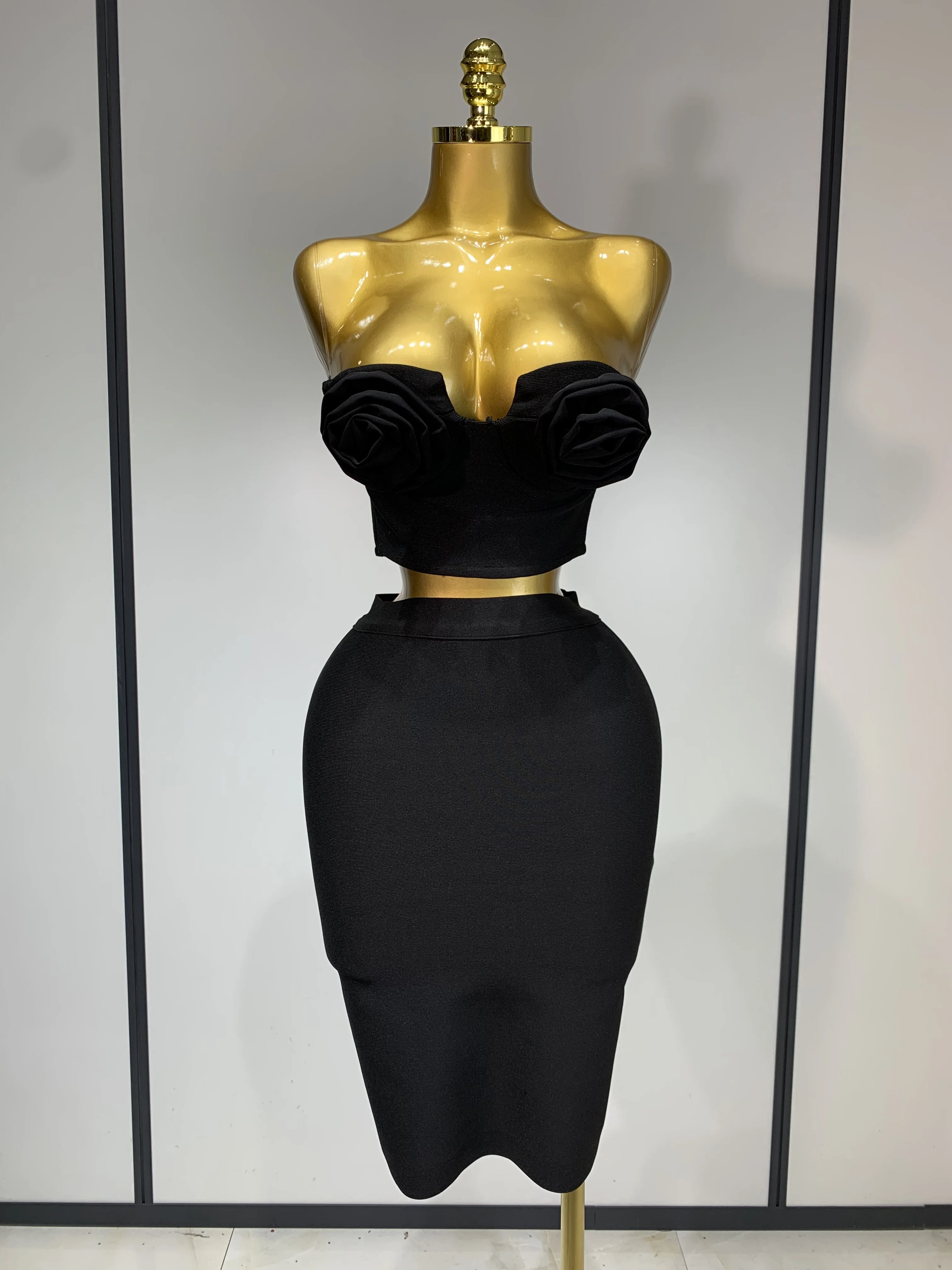 QueenLine Celebrity 3D Flower Black Bodycon Bandage Designer High Waist Two Piece Evening Skirt Set