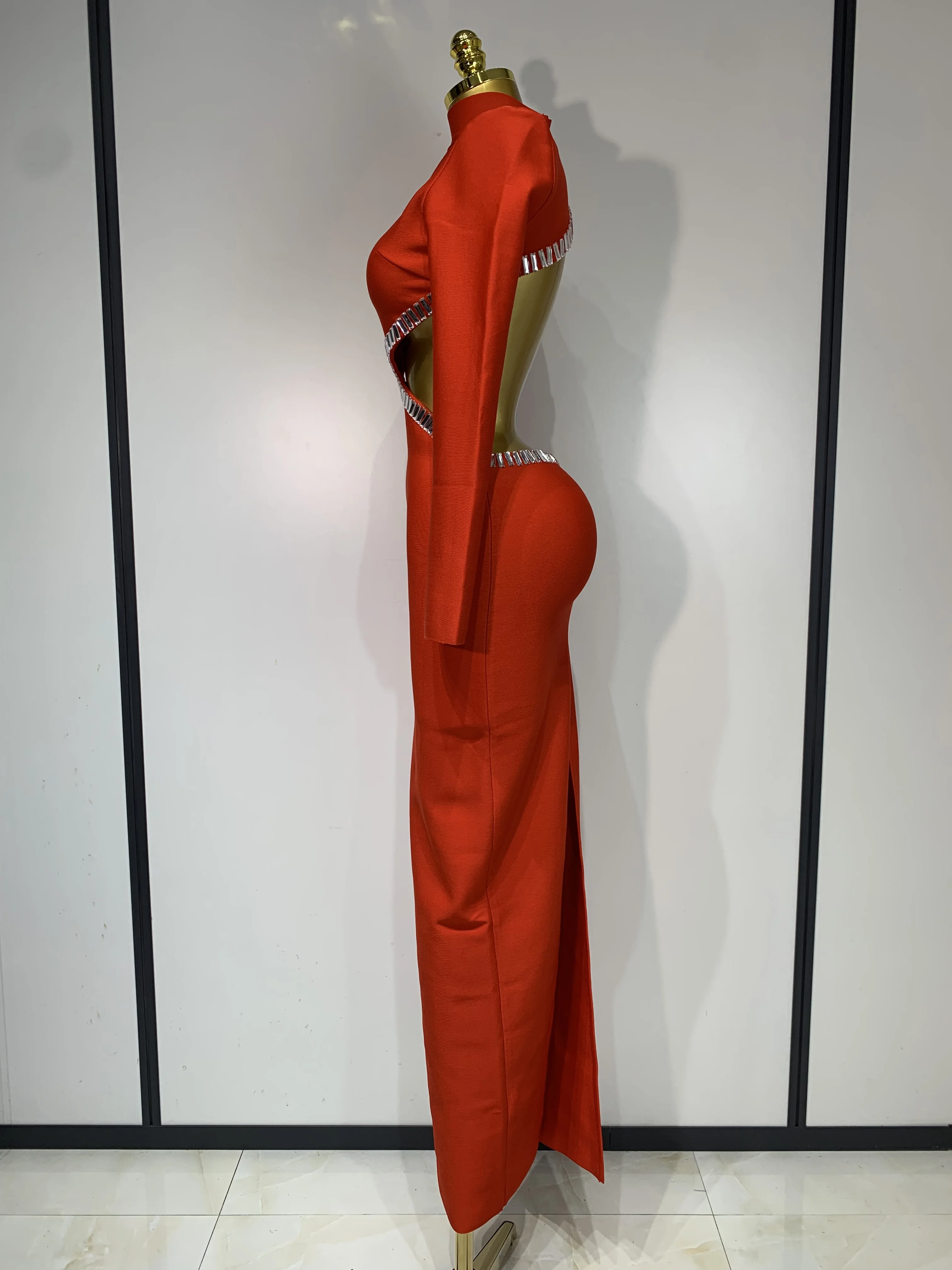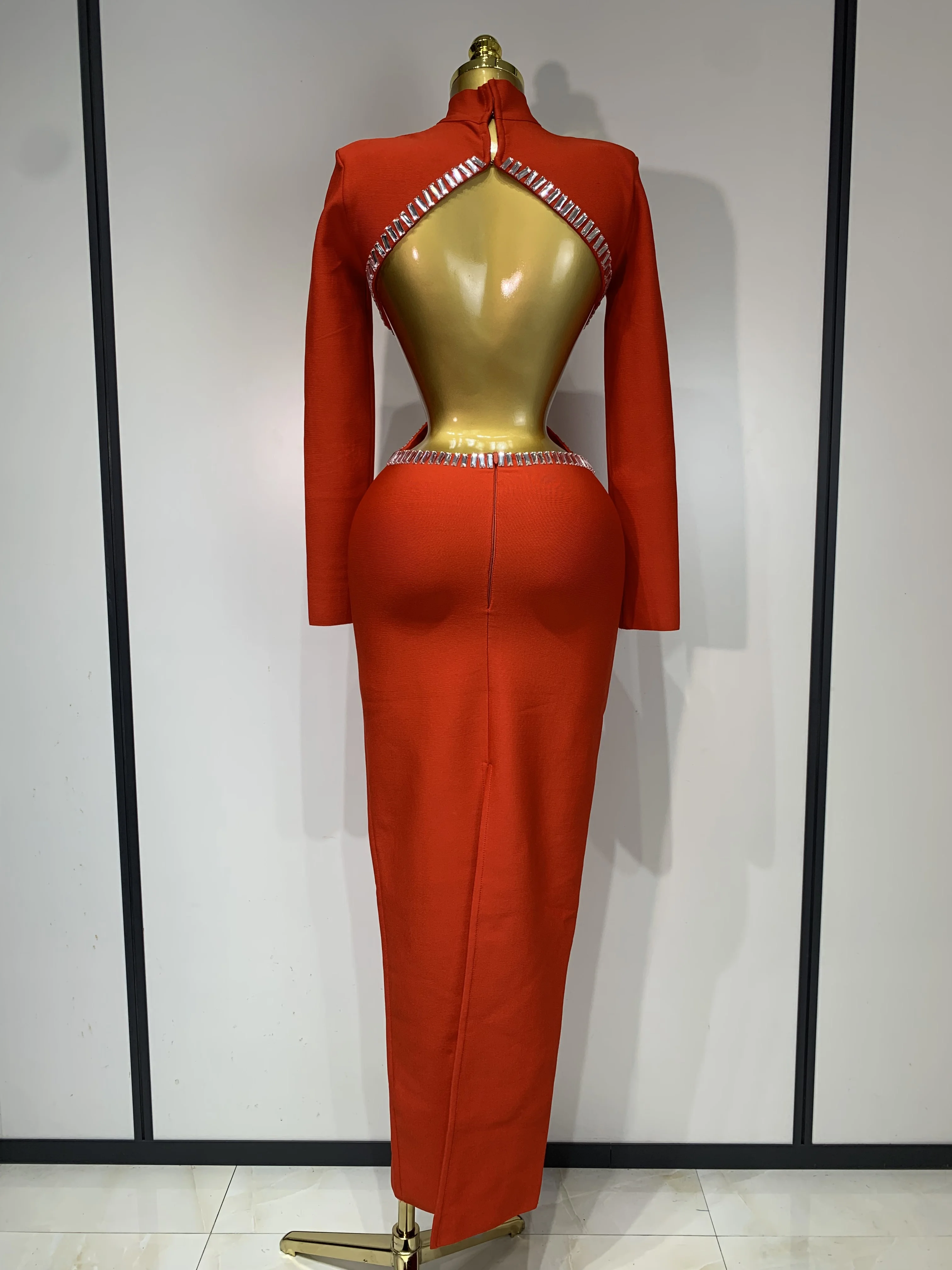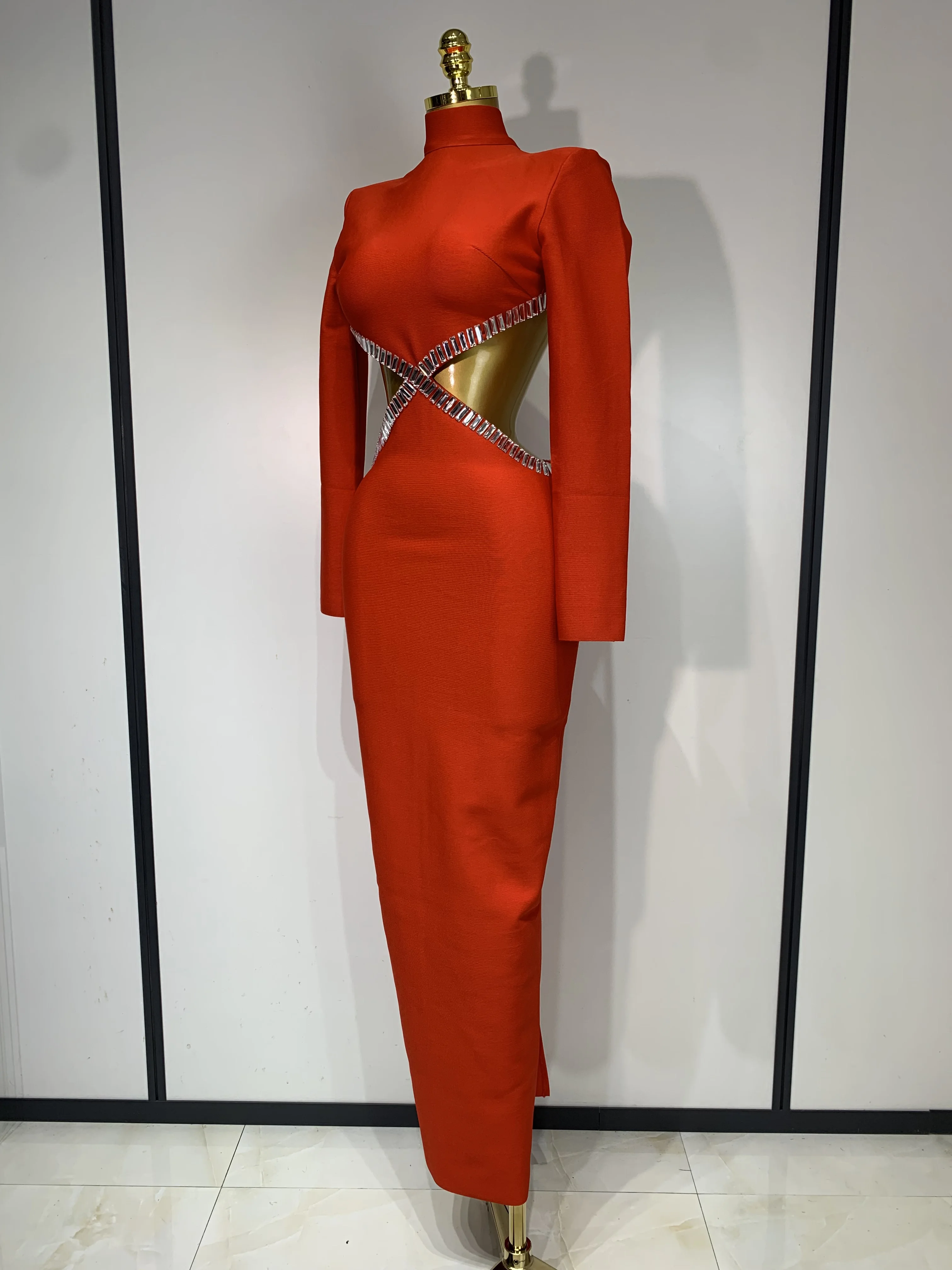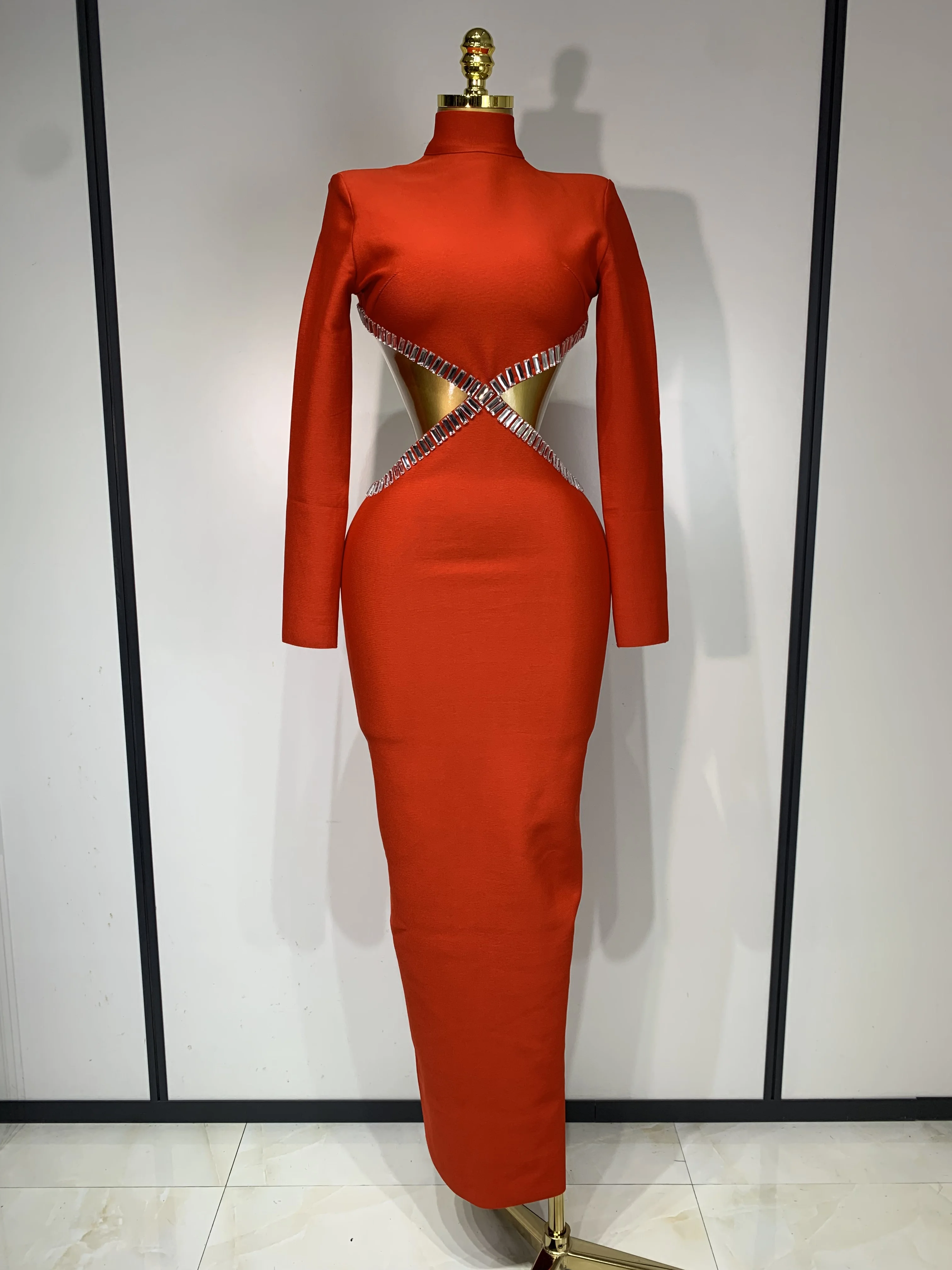 QueenLine Celebrity Luxury Elegant Long Sleeve Turtleneck Crystal Backless Bodycon Evening Bandage Dress