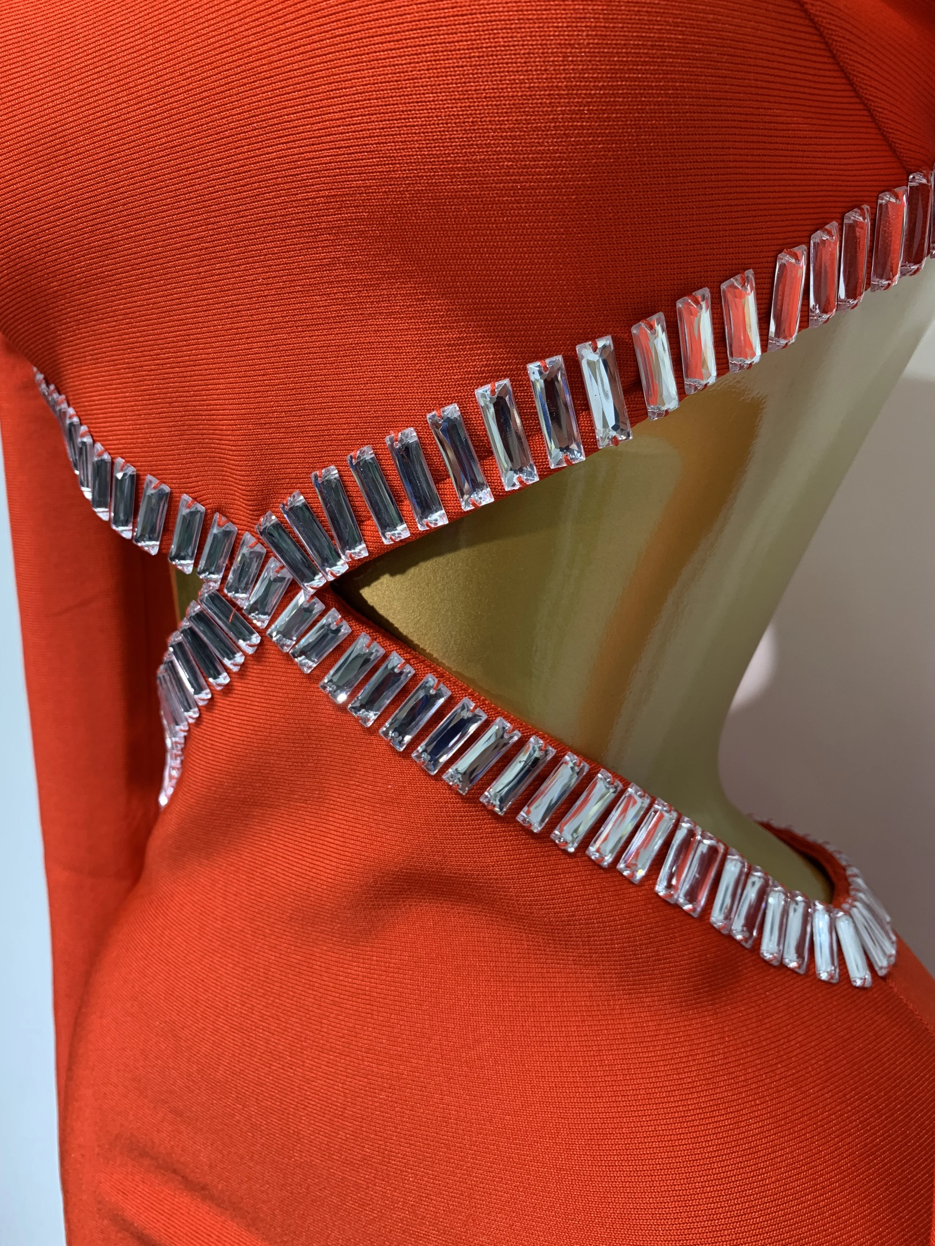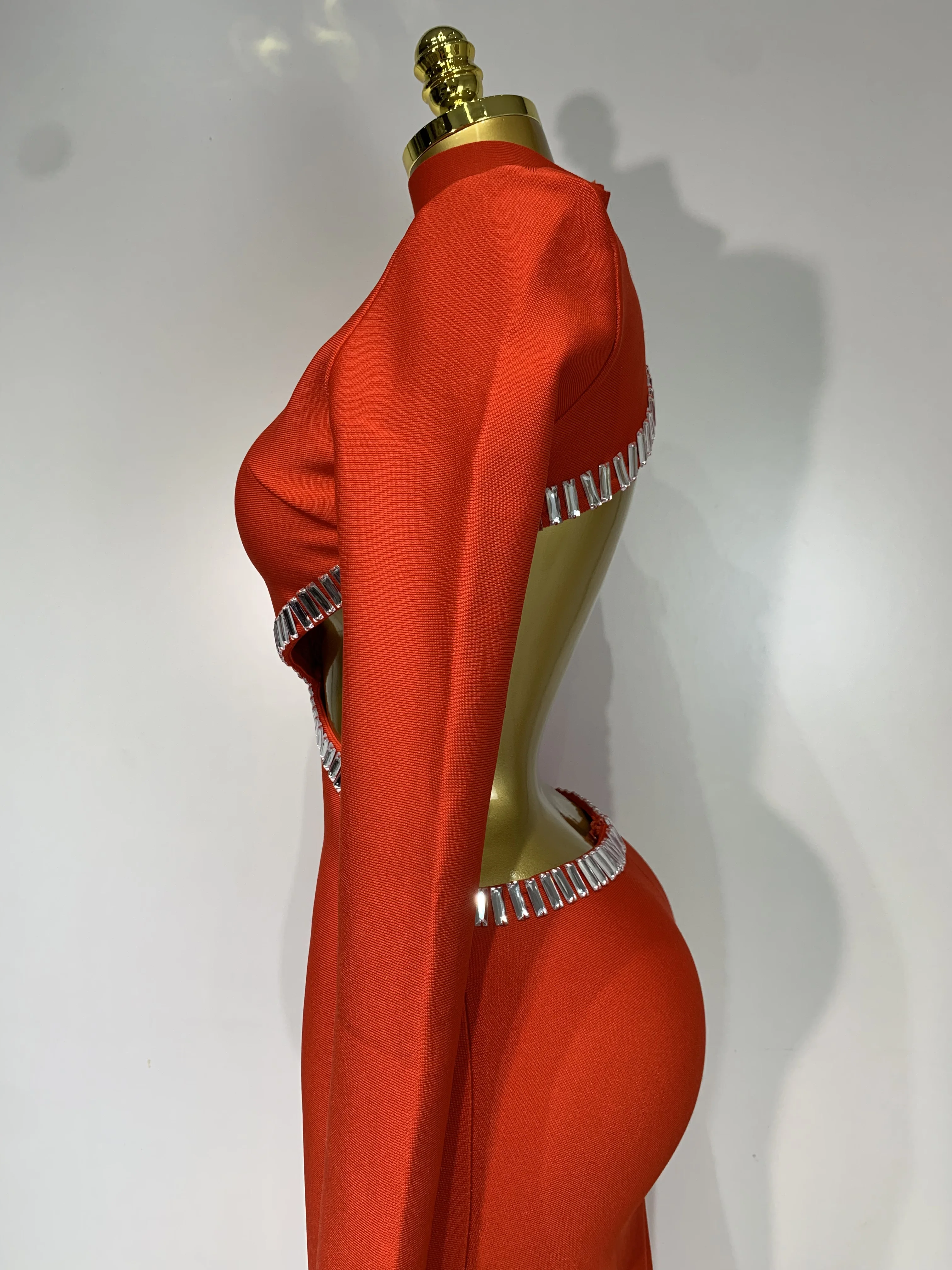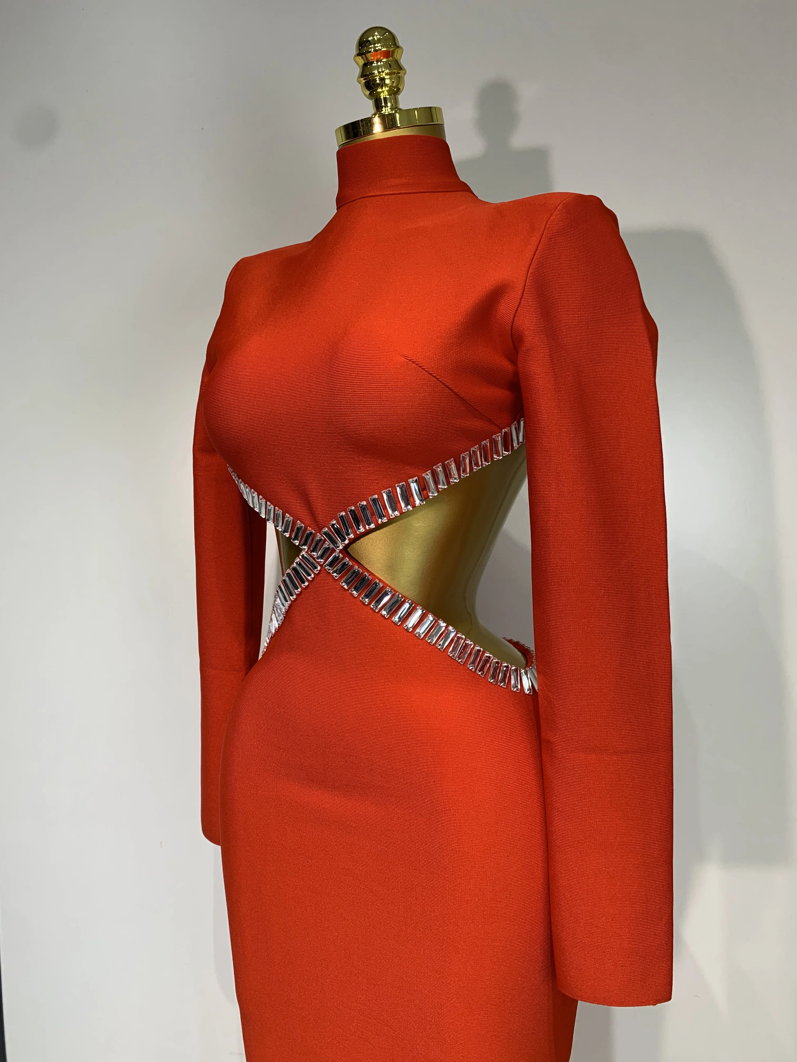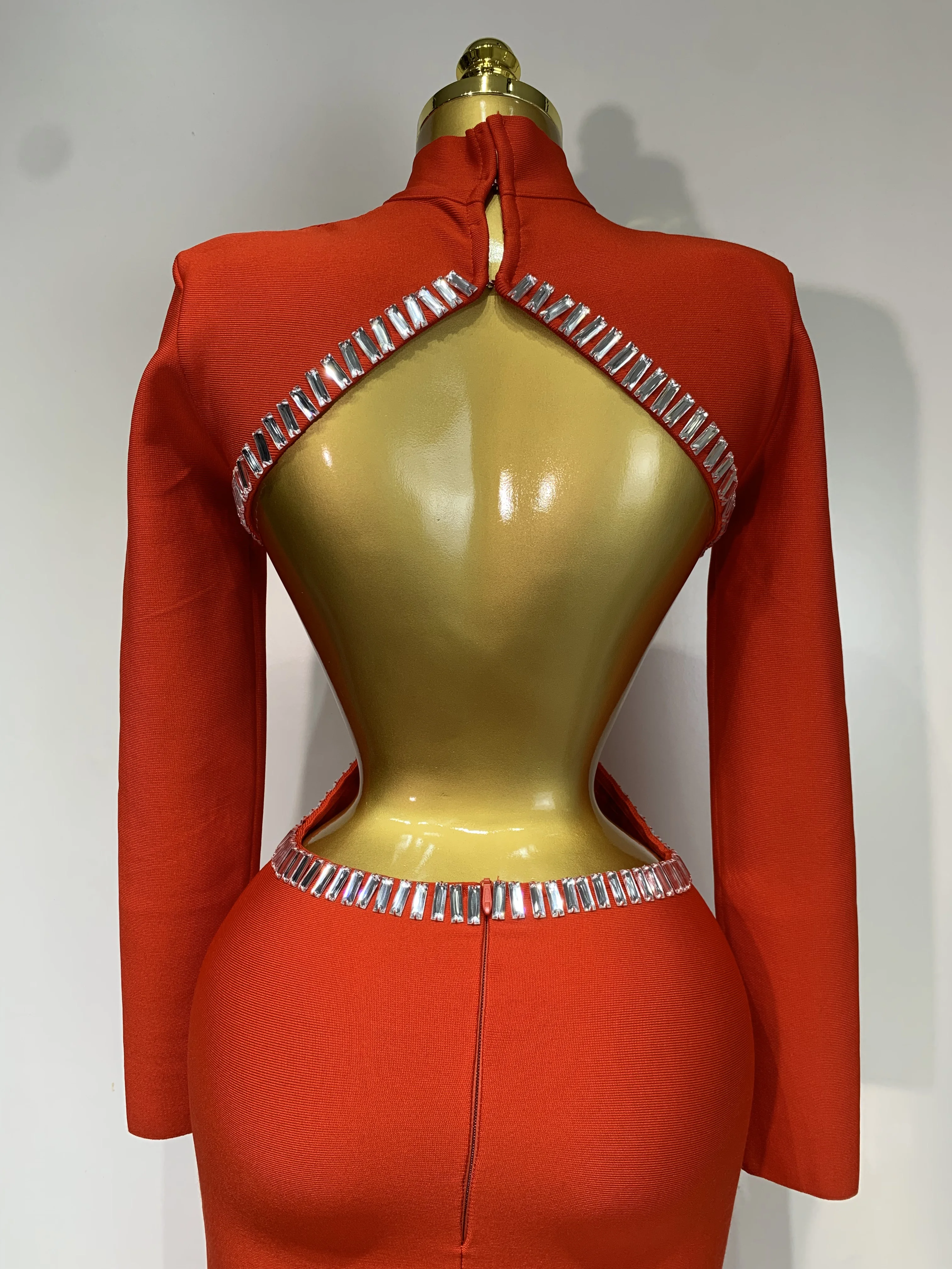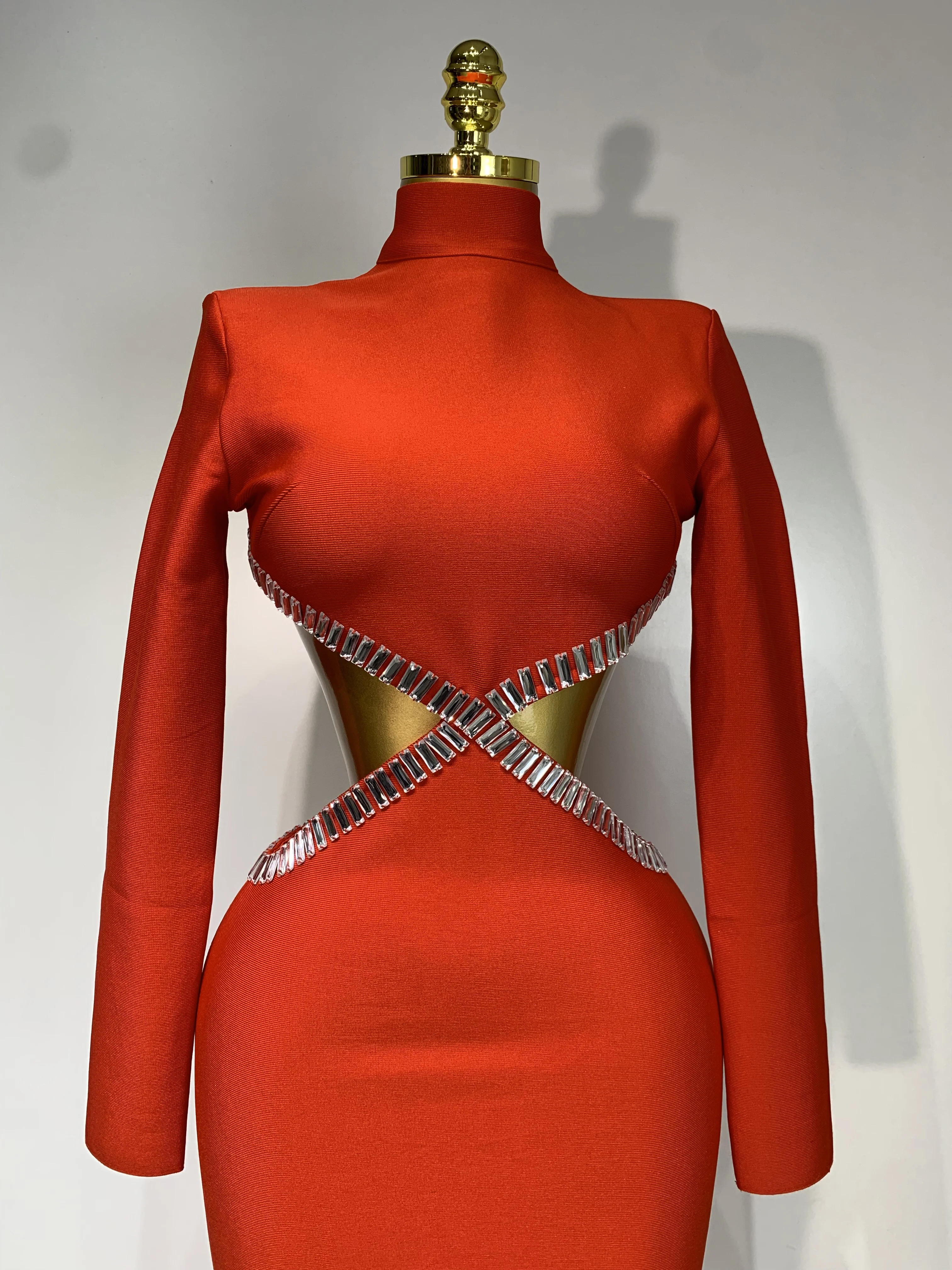 QueenLine Celebrity Luxury Elegant Long Sleeve Turtleneck Crystal Backless Bodycon Evening Bandage Dress