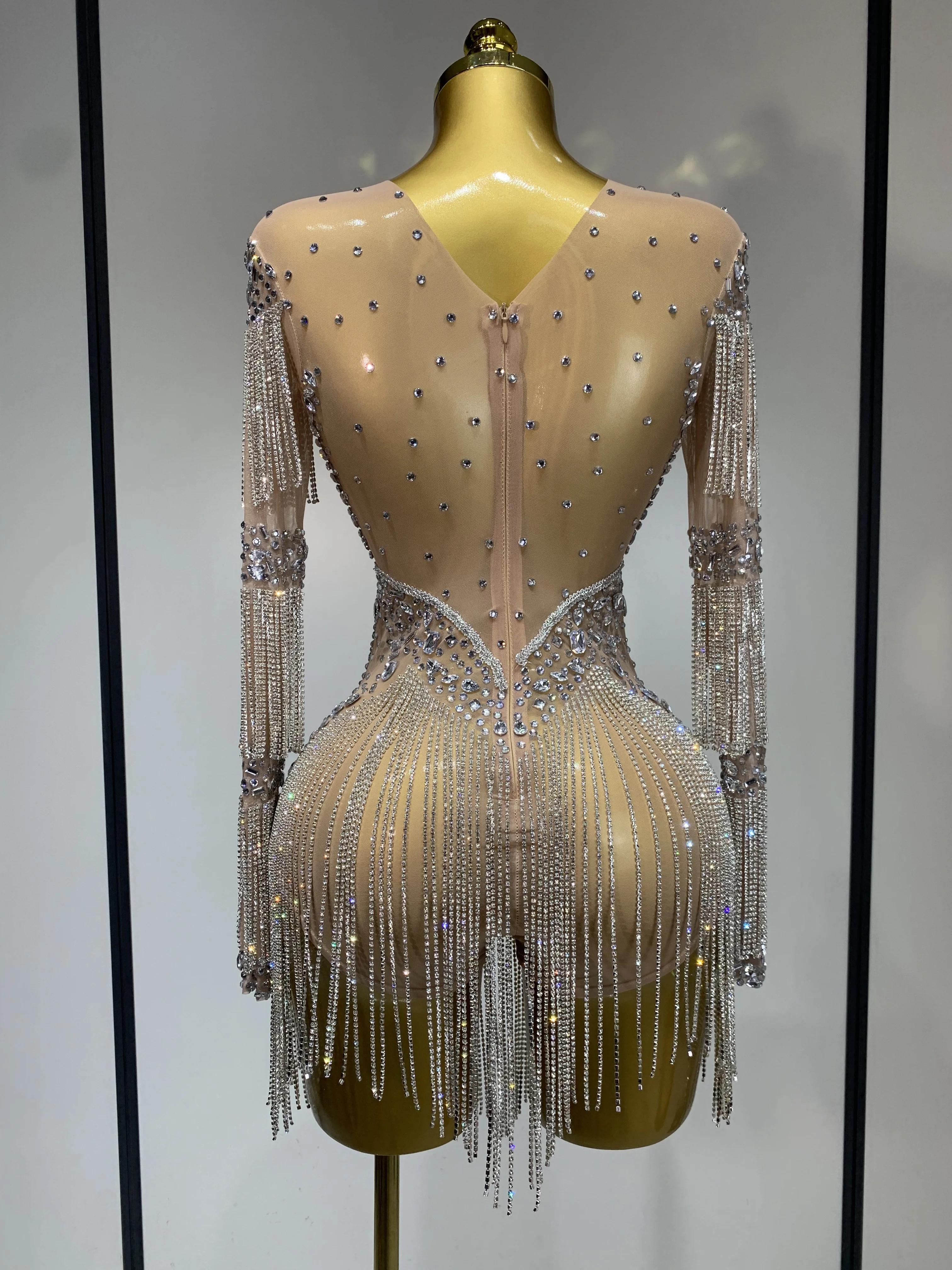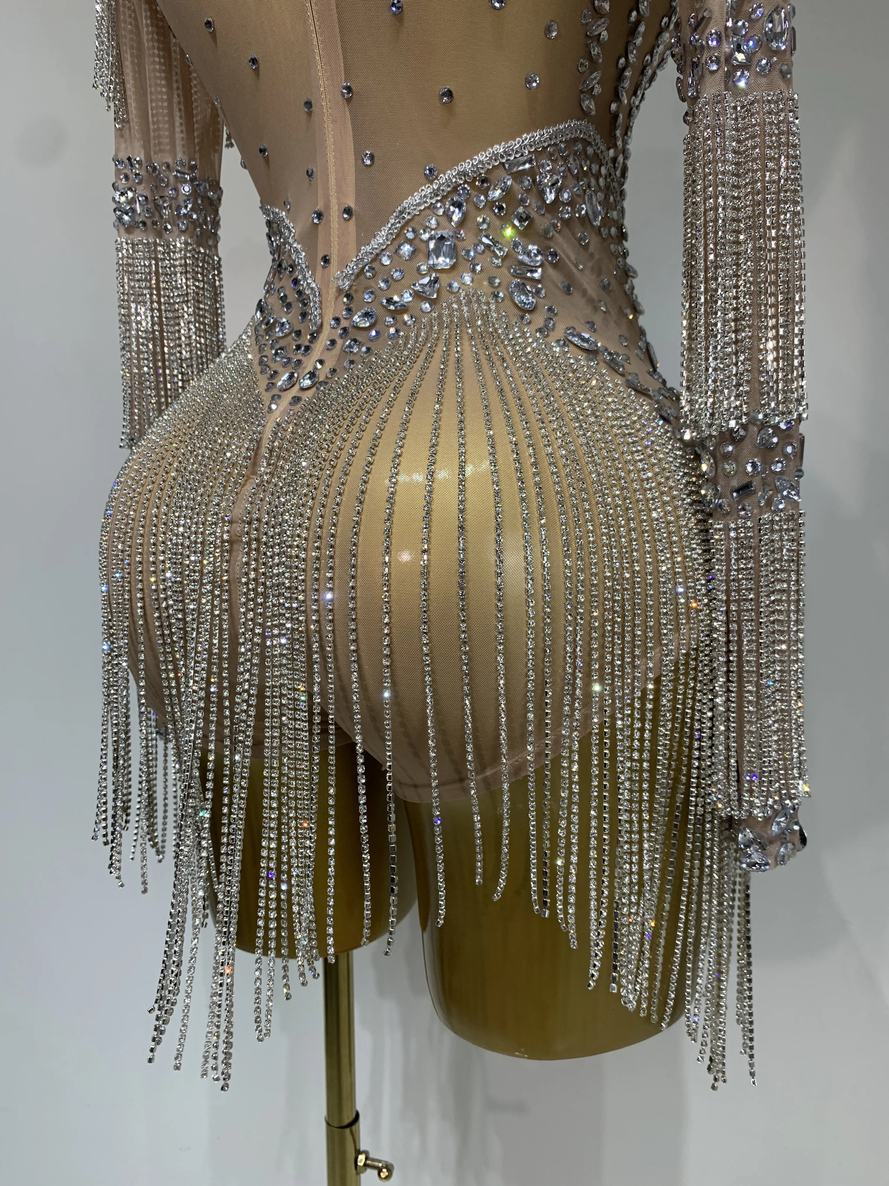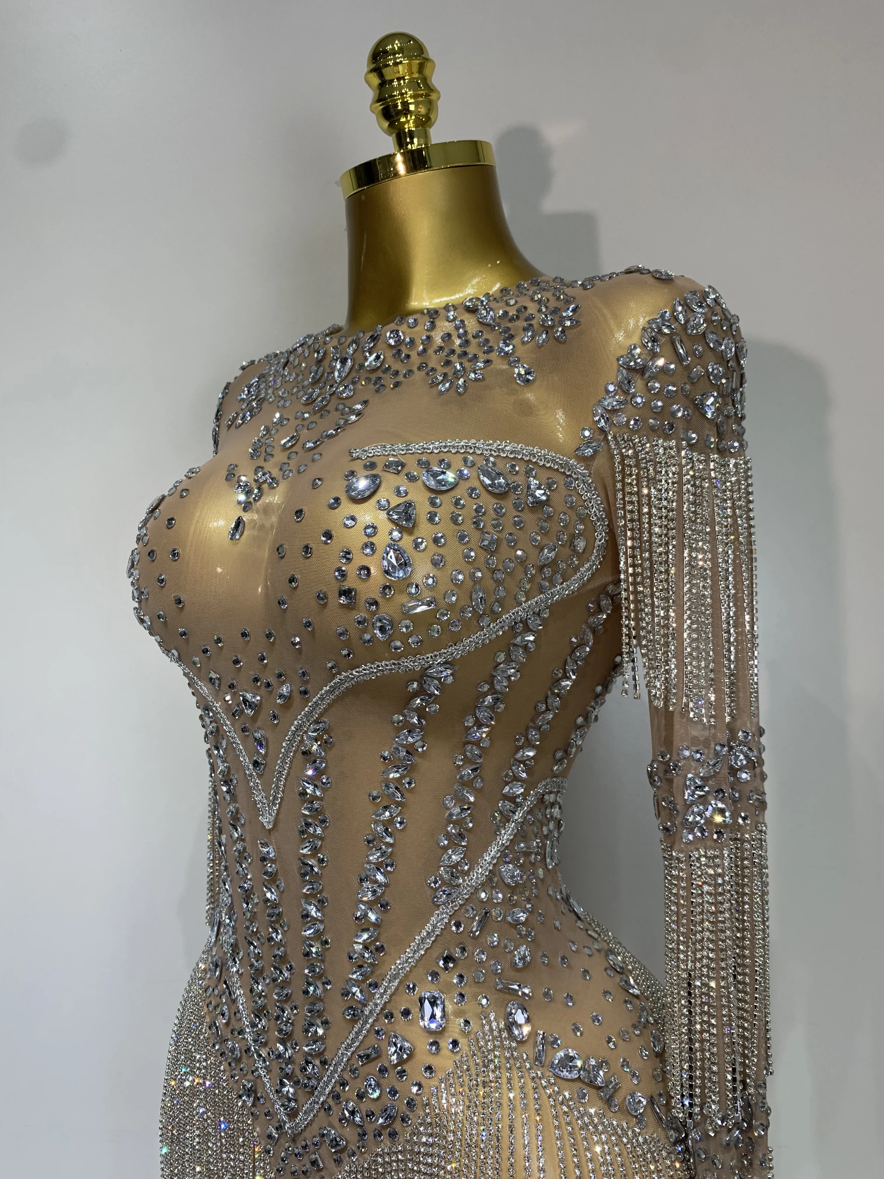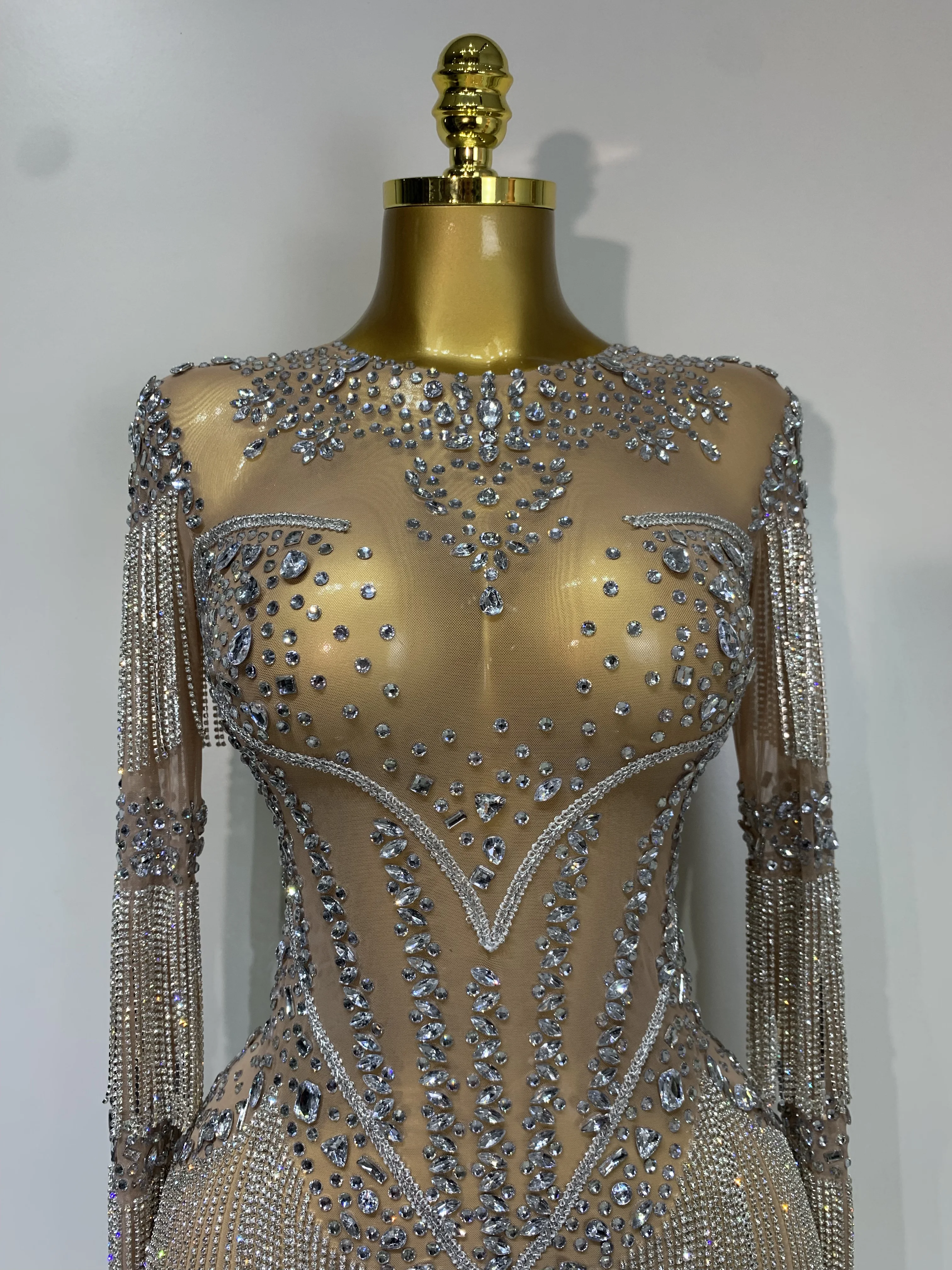 QueenLine Celebrity Luxury Sparkly Rhinestone Bodysuit Sexy Mesh See Through Evening Performance Dance Stage Costume