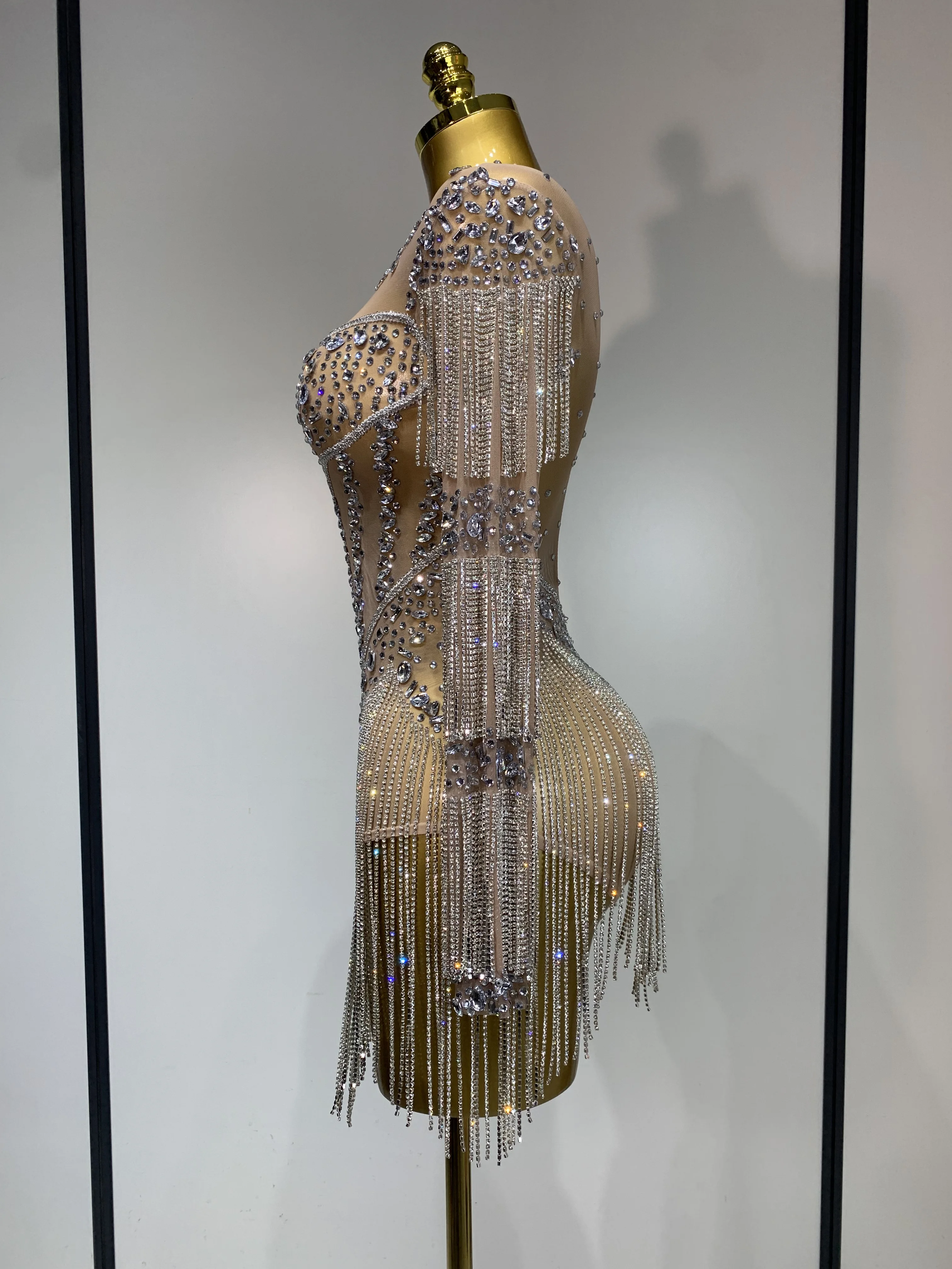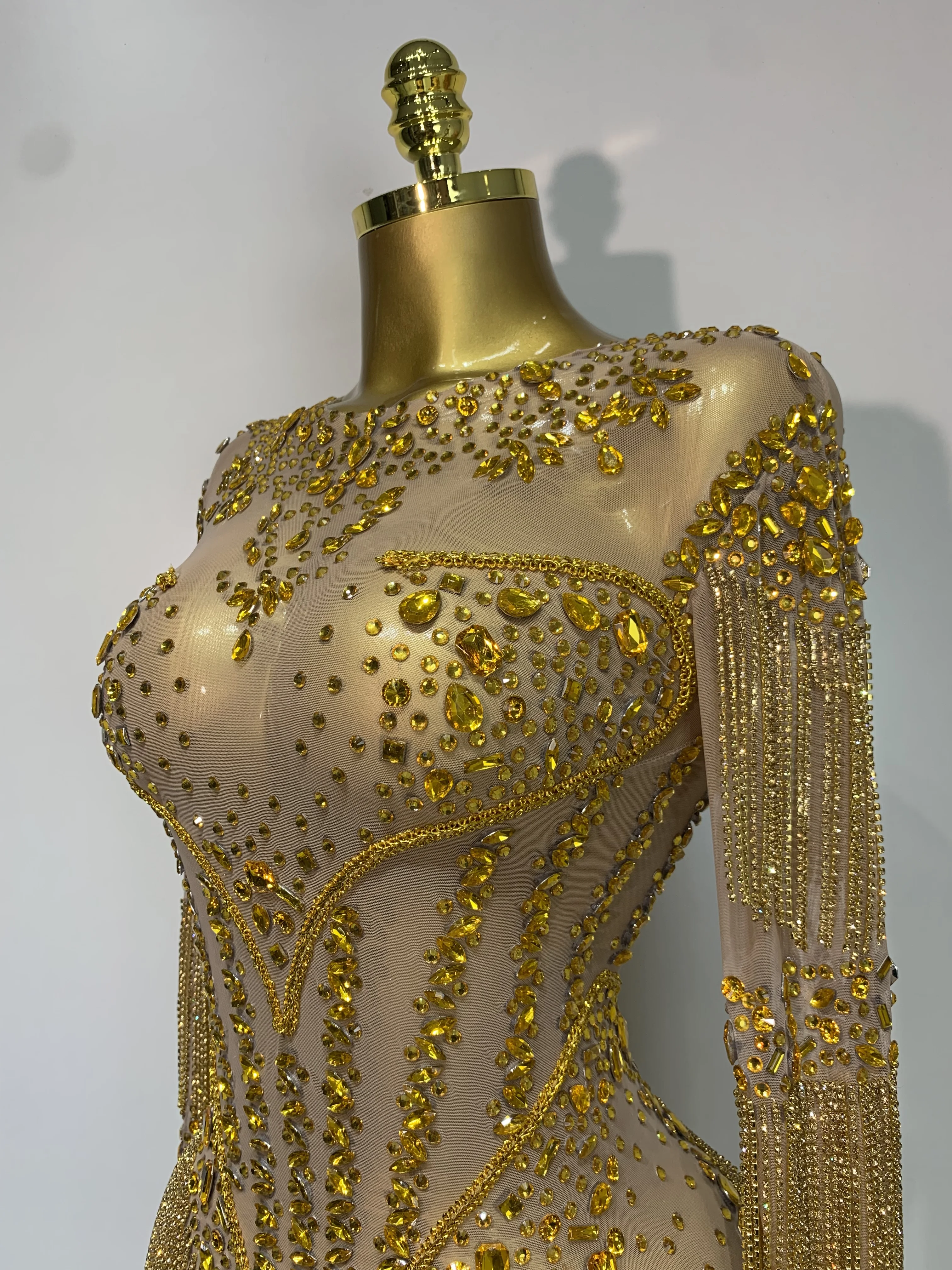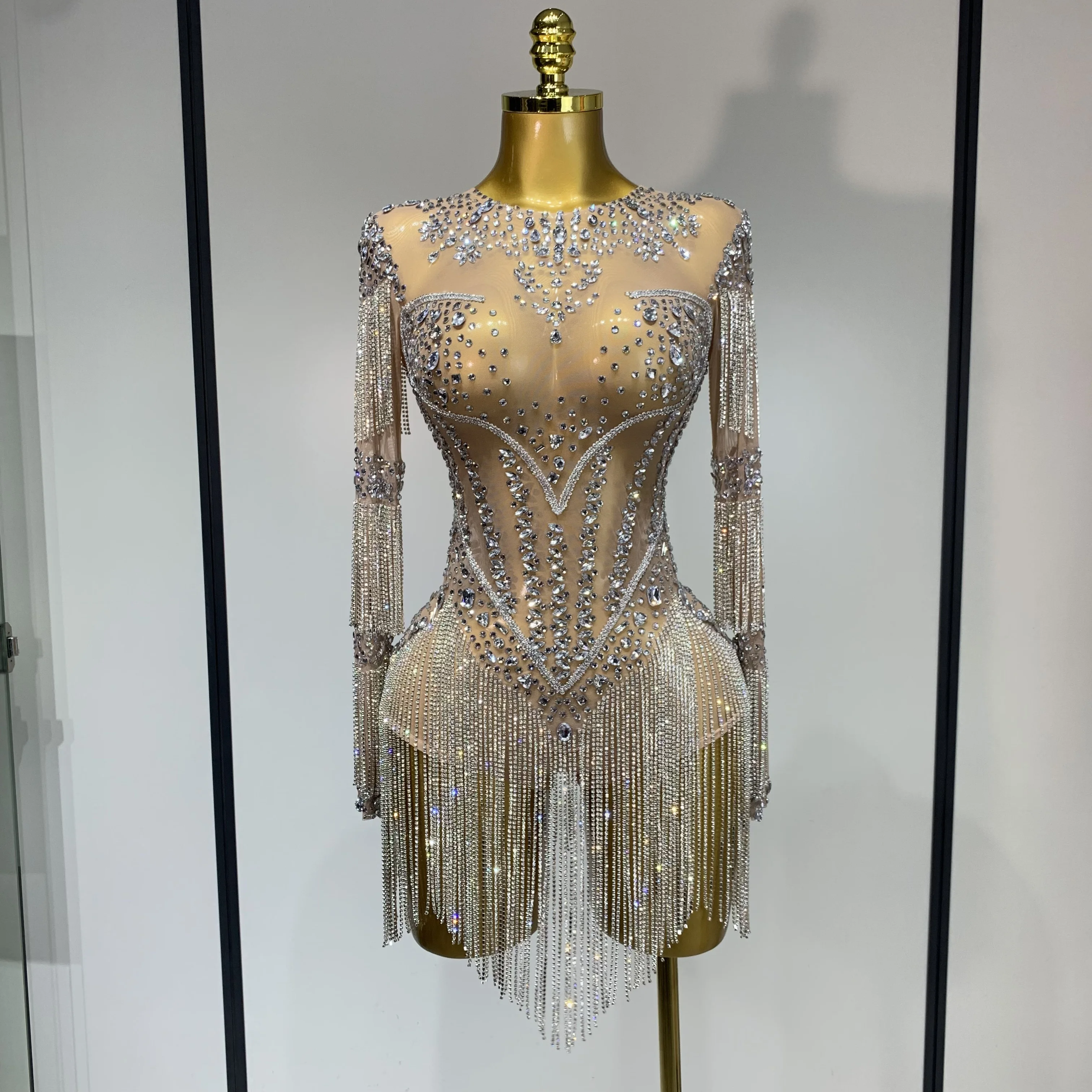 QueenLine Celebrity Luxury Sparkly Rhinestone Bodysuit Sexy Mesh See Through Evening Performance Dance Stage Costume