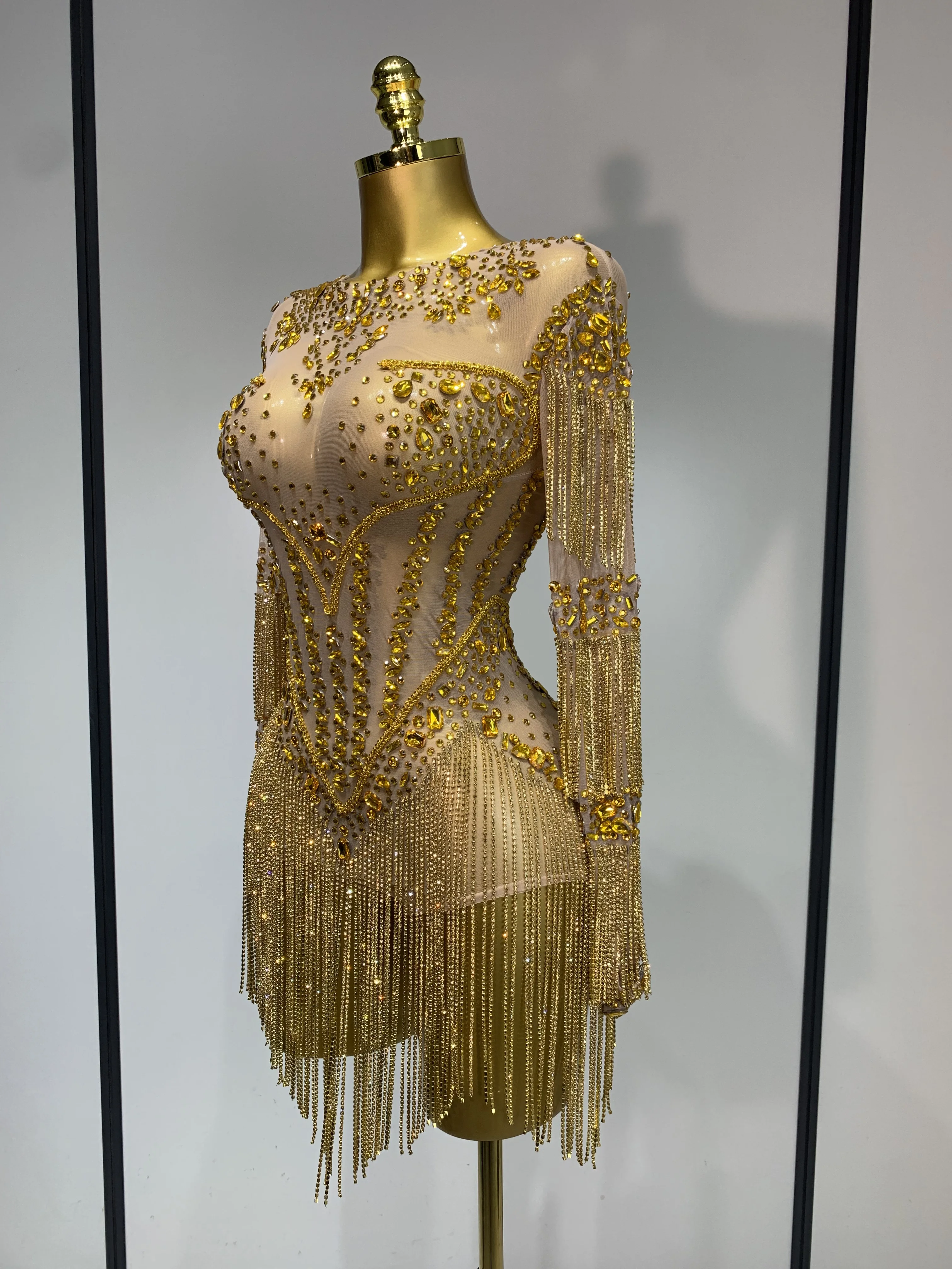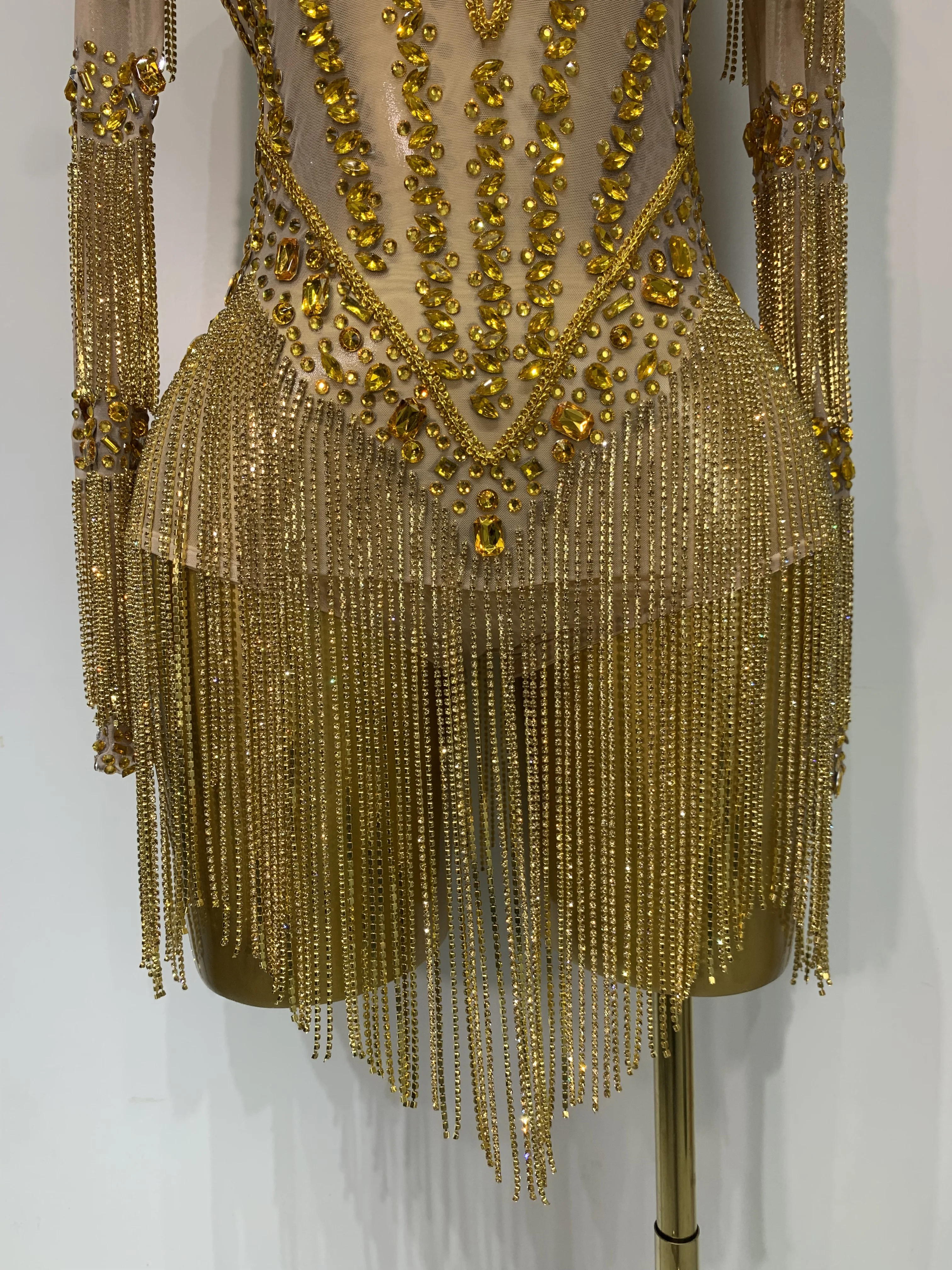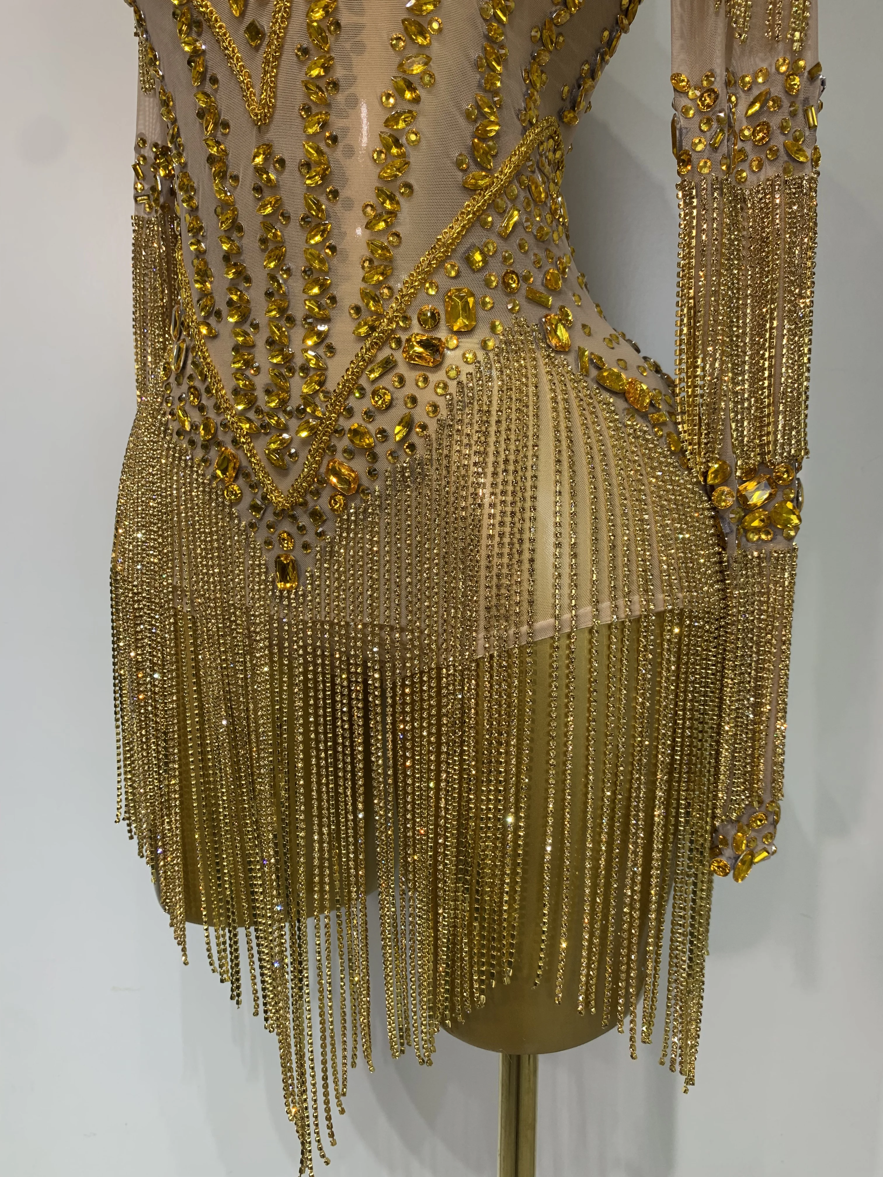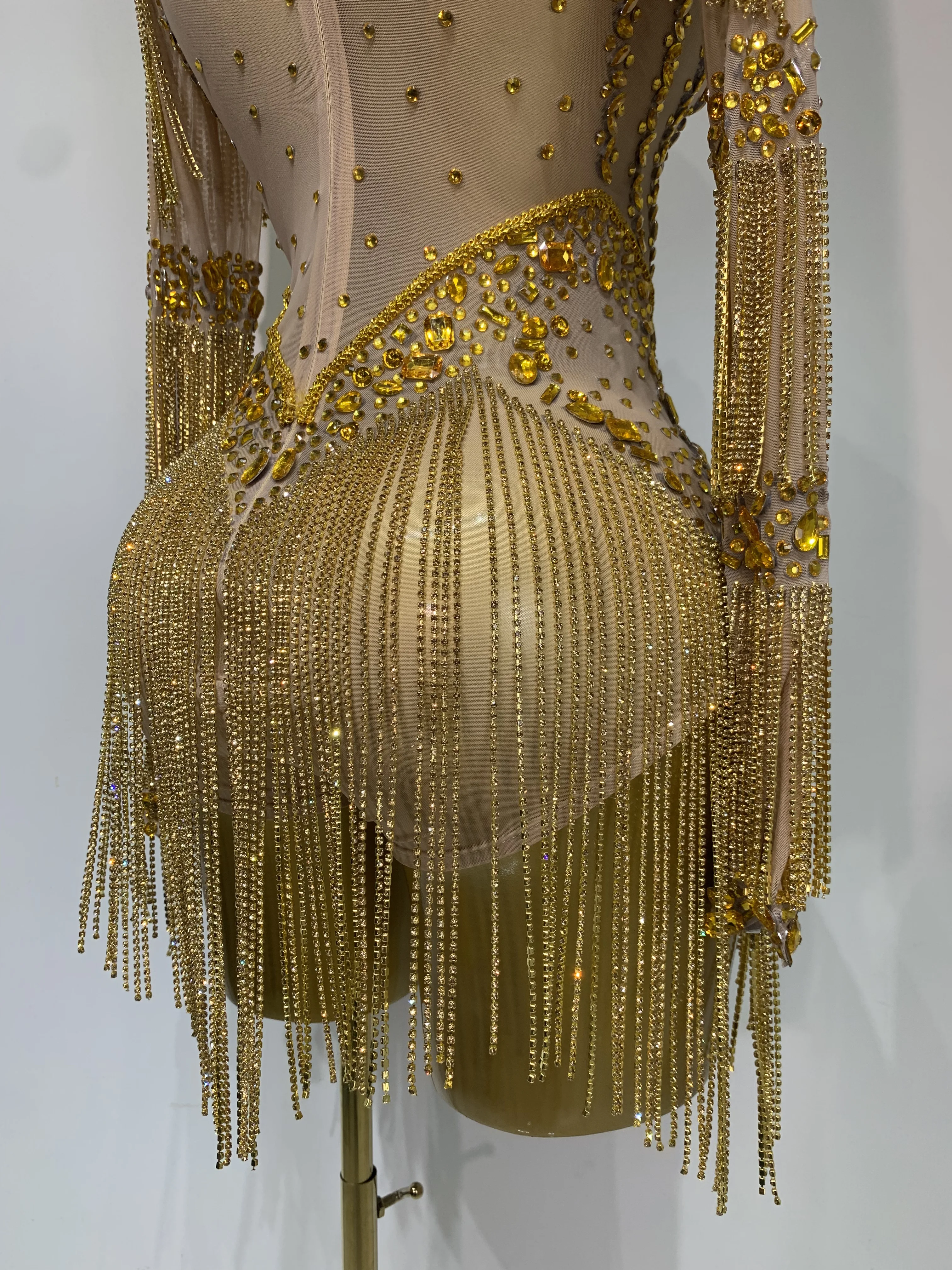 QueenLine Celebrity Luxury Sparkly Rhinestone Bodysuit Sexy Mesh See Through Evening Performance Dance Stage Costume