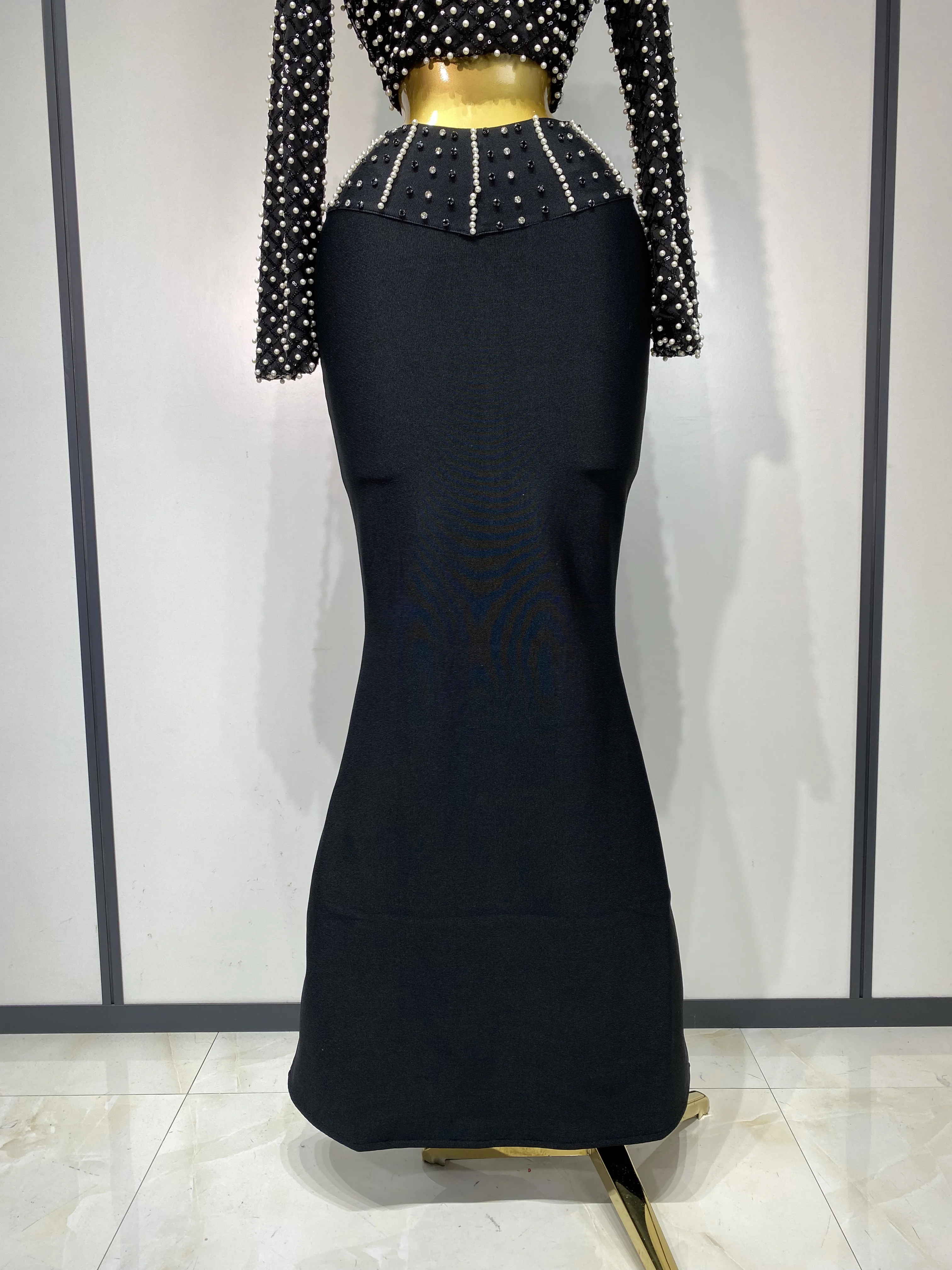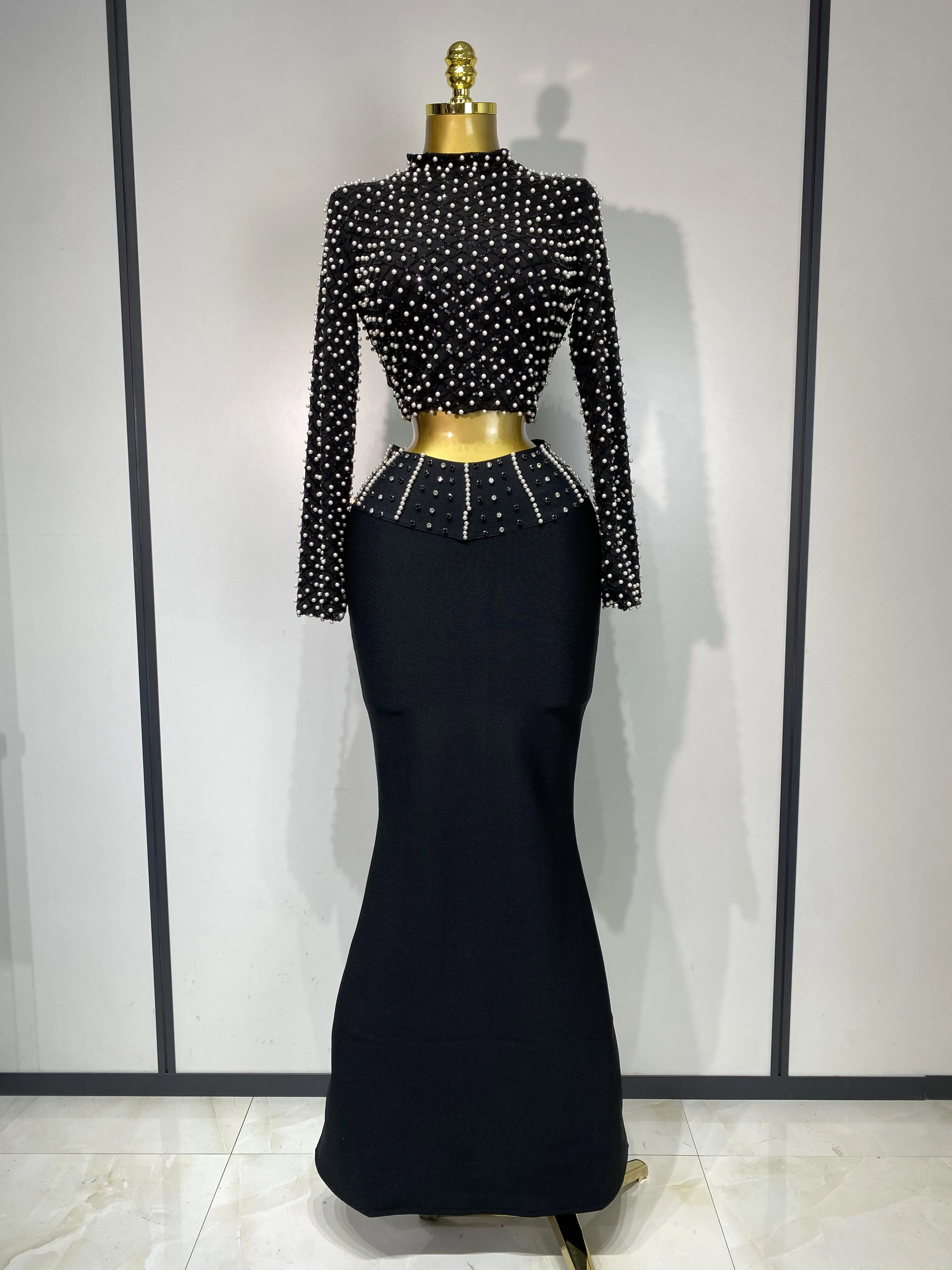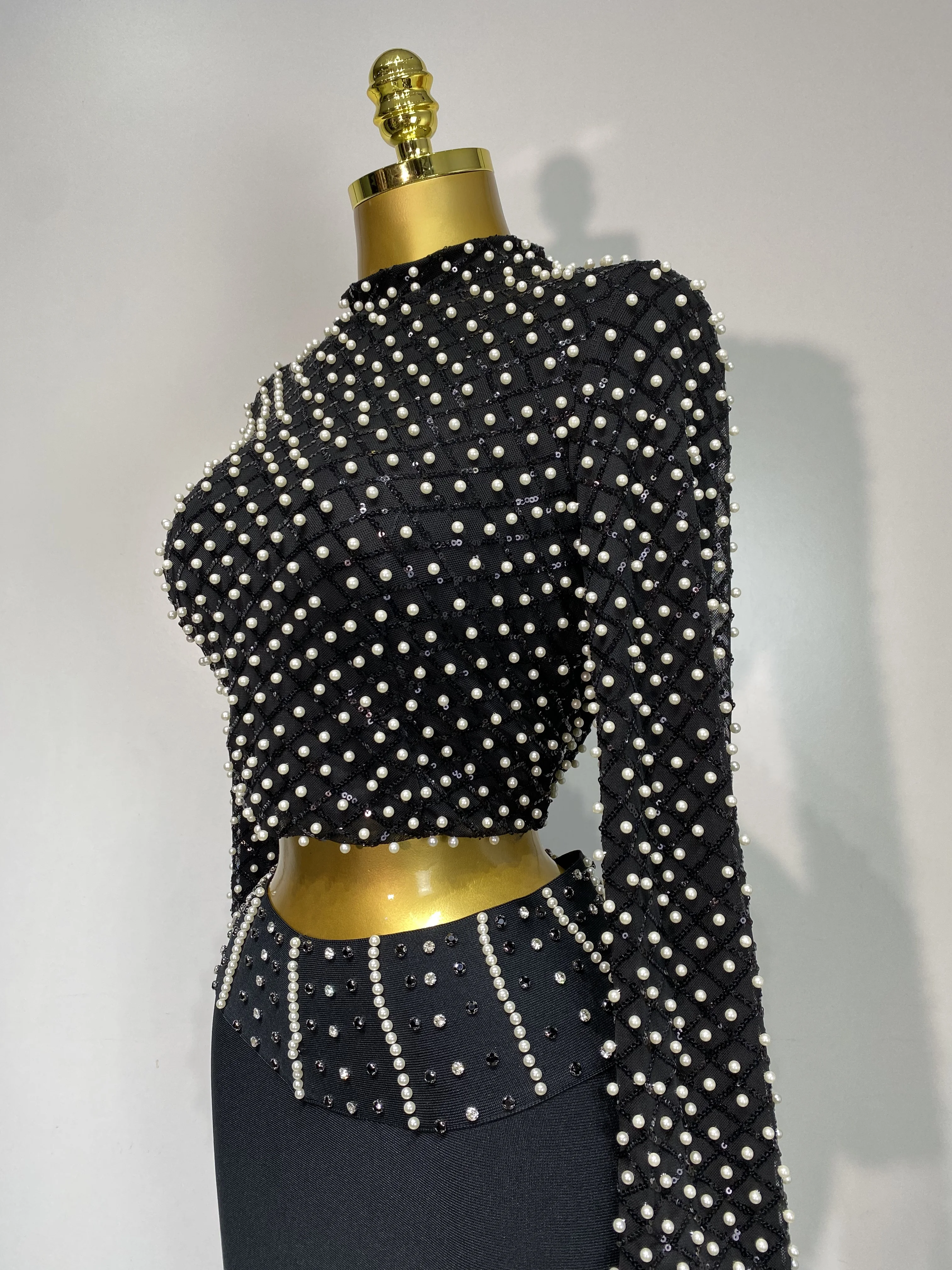QueenLine Celebrity Sexy Long Sleeve Black Mesh Studded Dianonds Crystal Pearl Two Pieces Evening Bandage Set