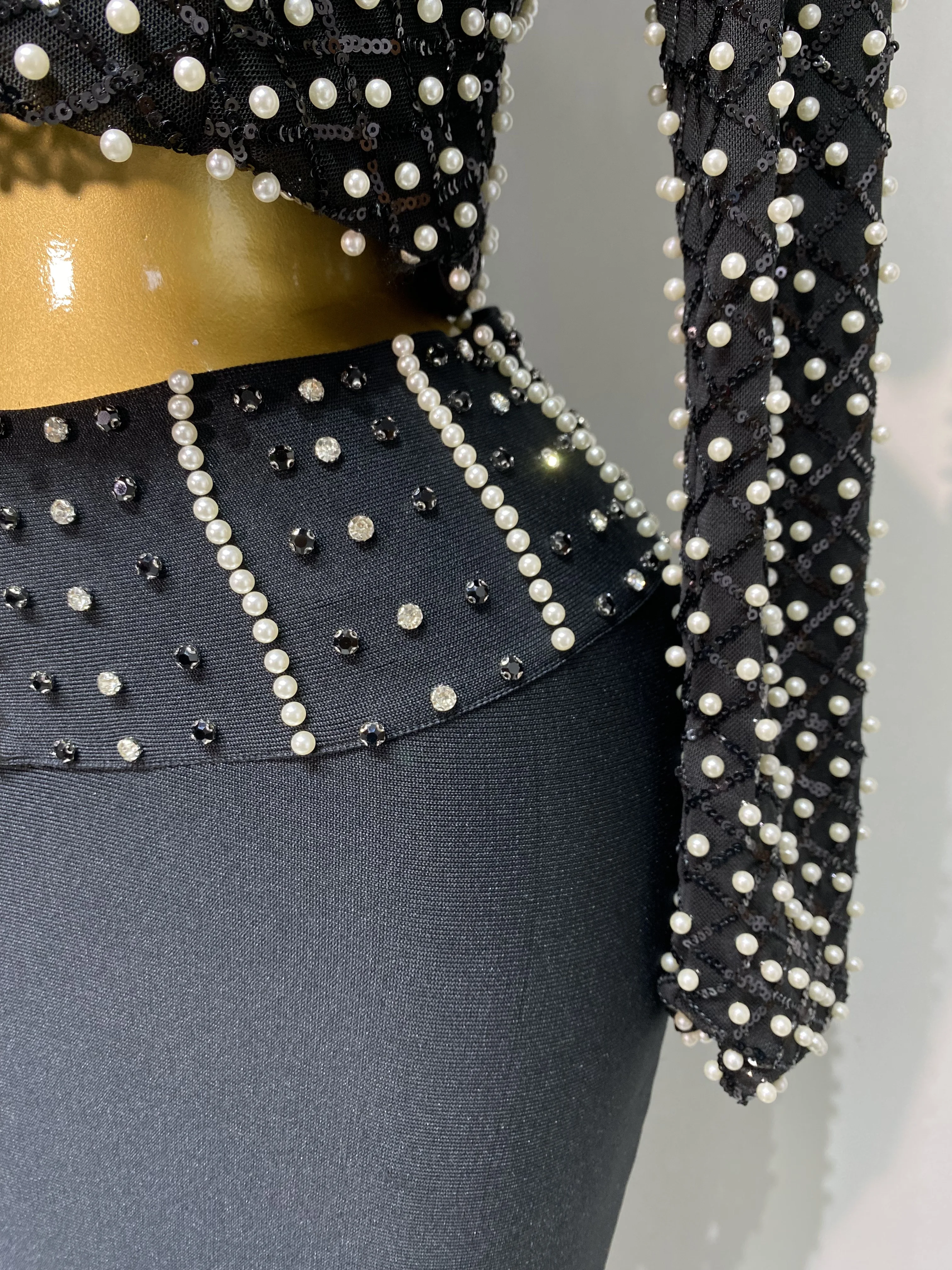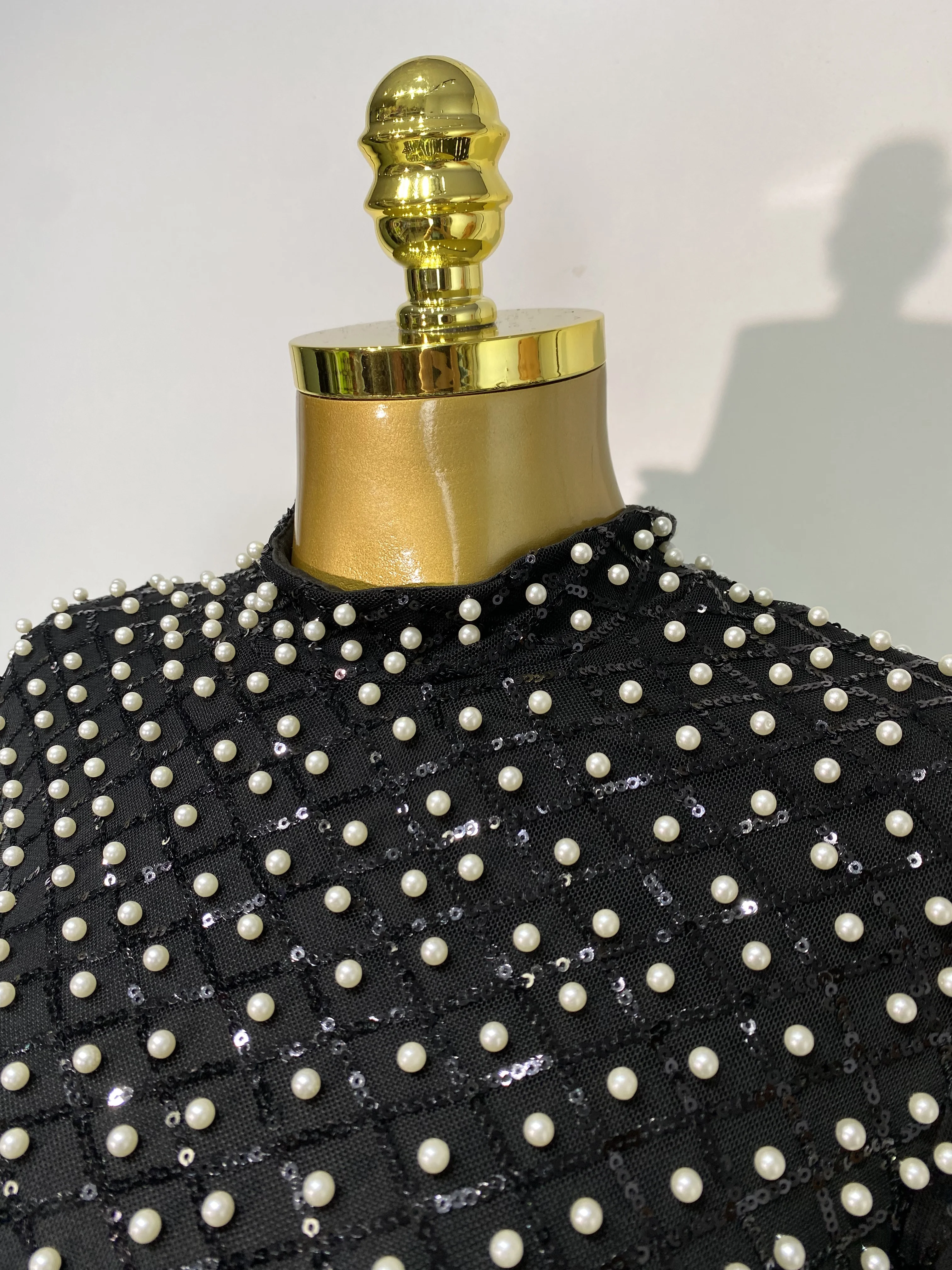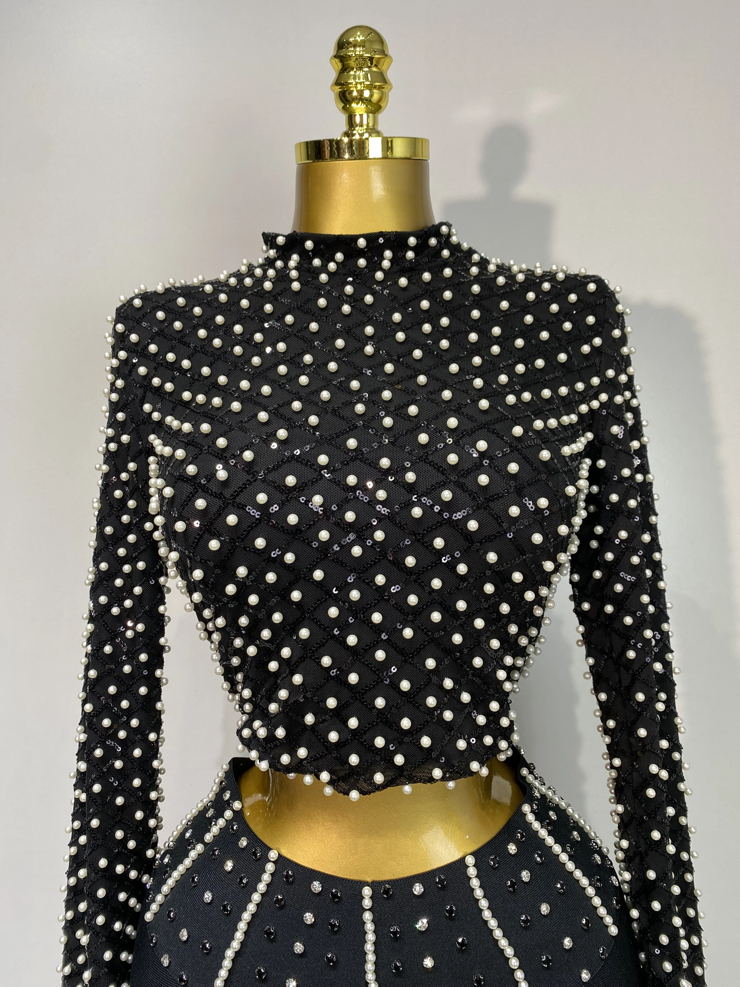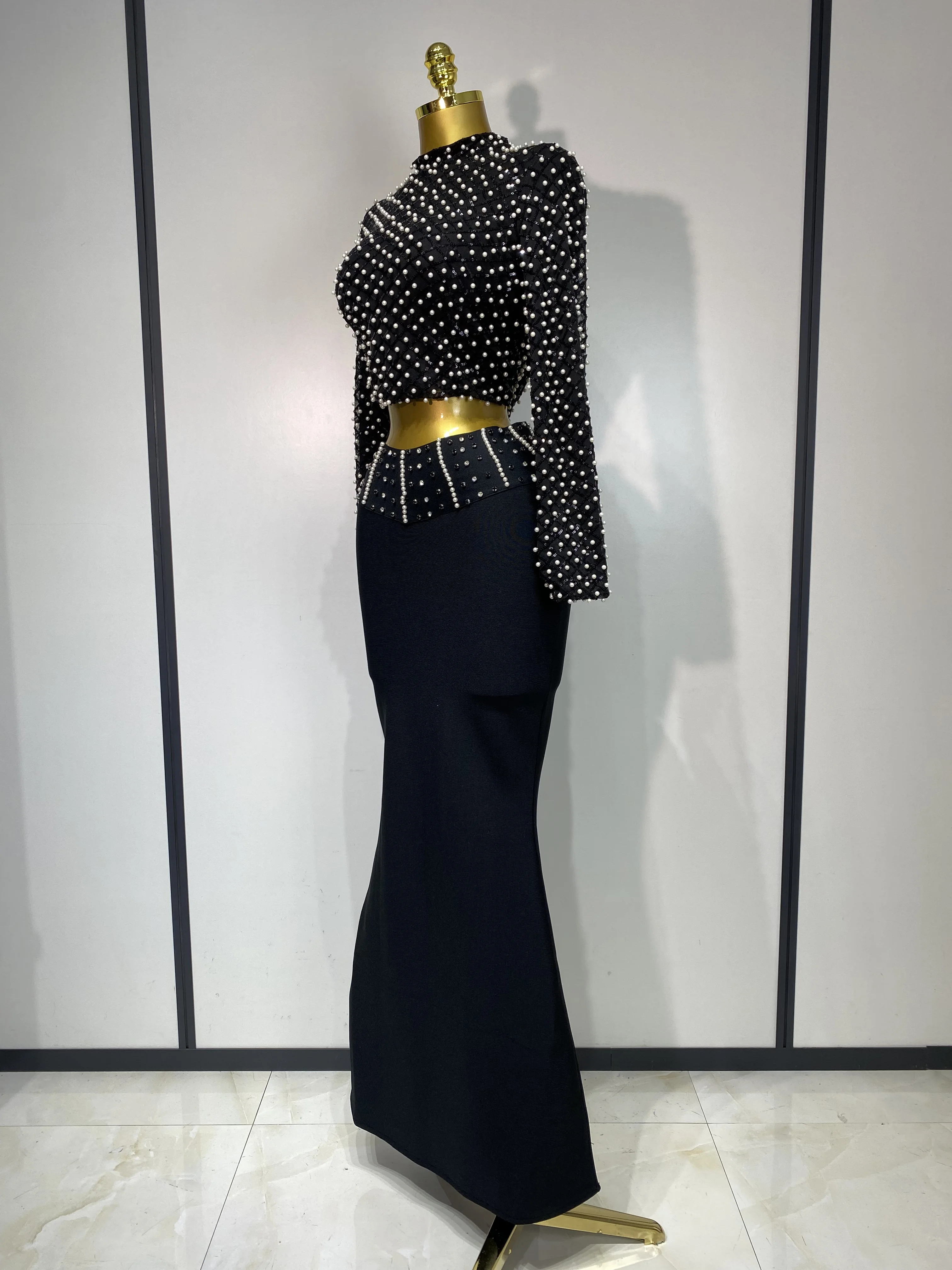QueenLine Celebrity Sexy Long Sleeve Black Mesh Studded Dianonds Crystal Pearl Two Pieces Evening Bandage Set