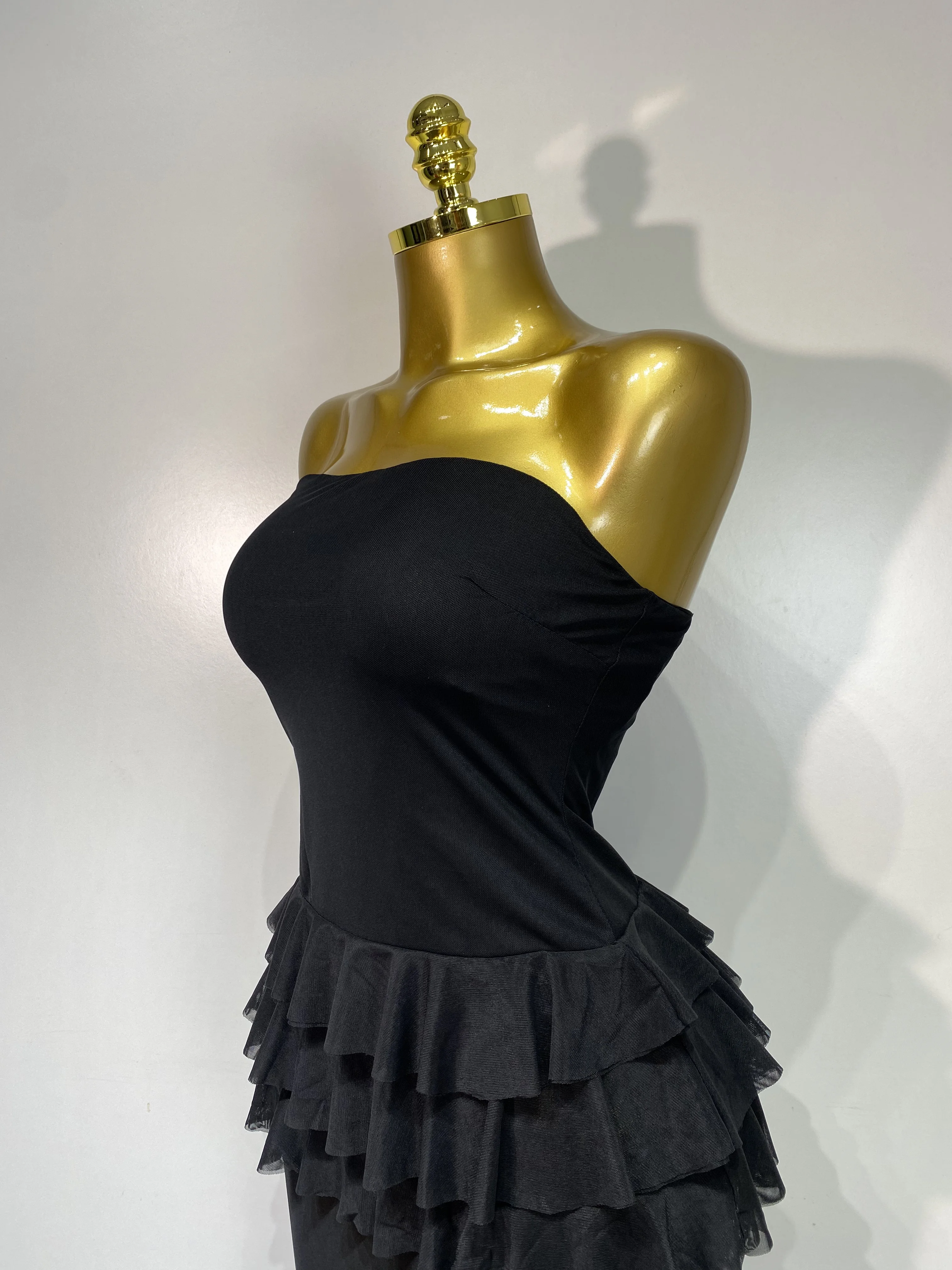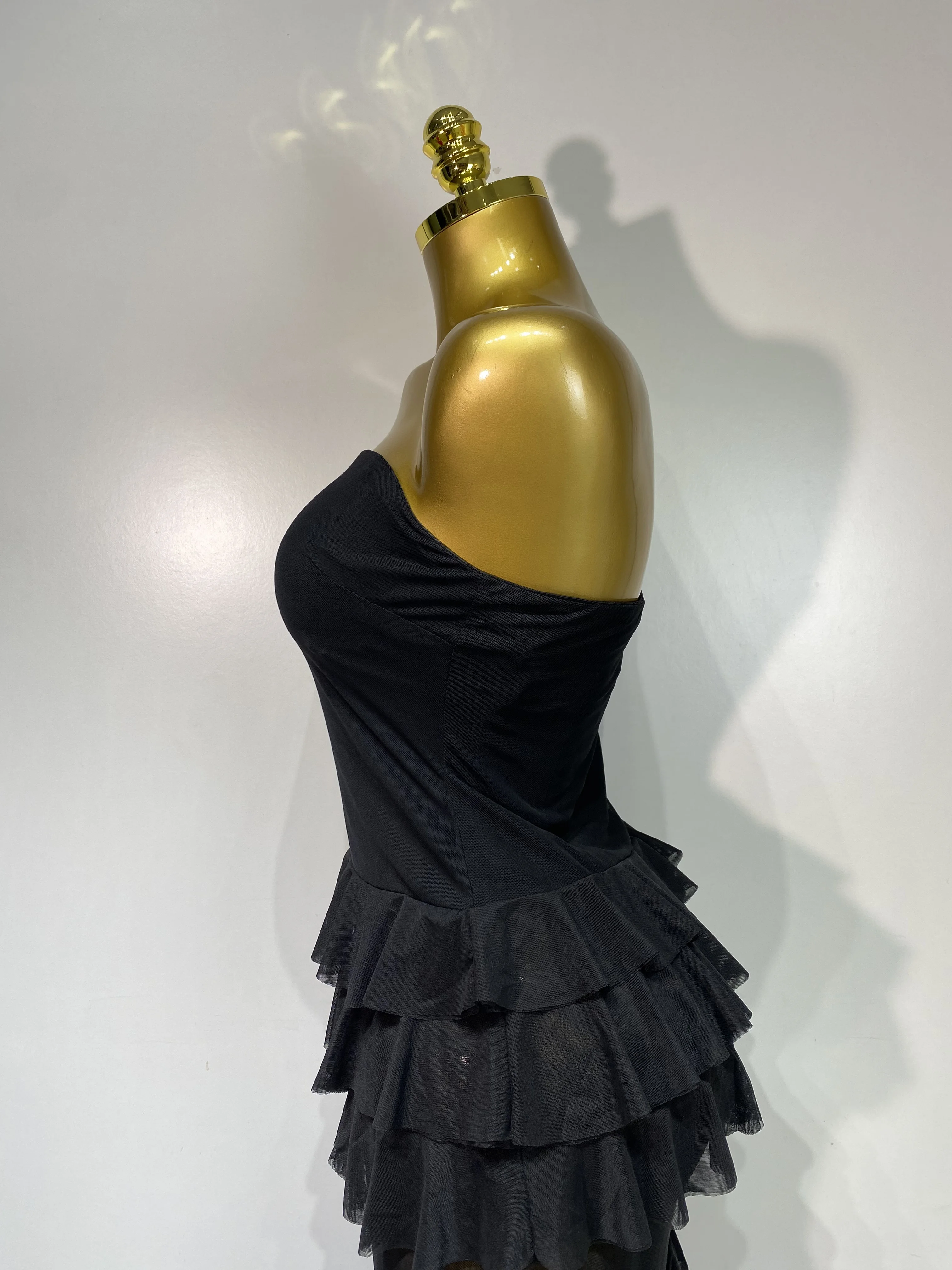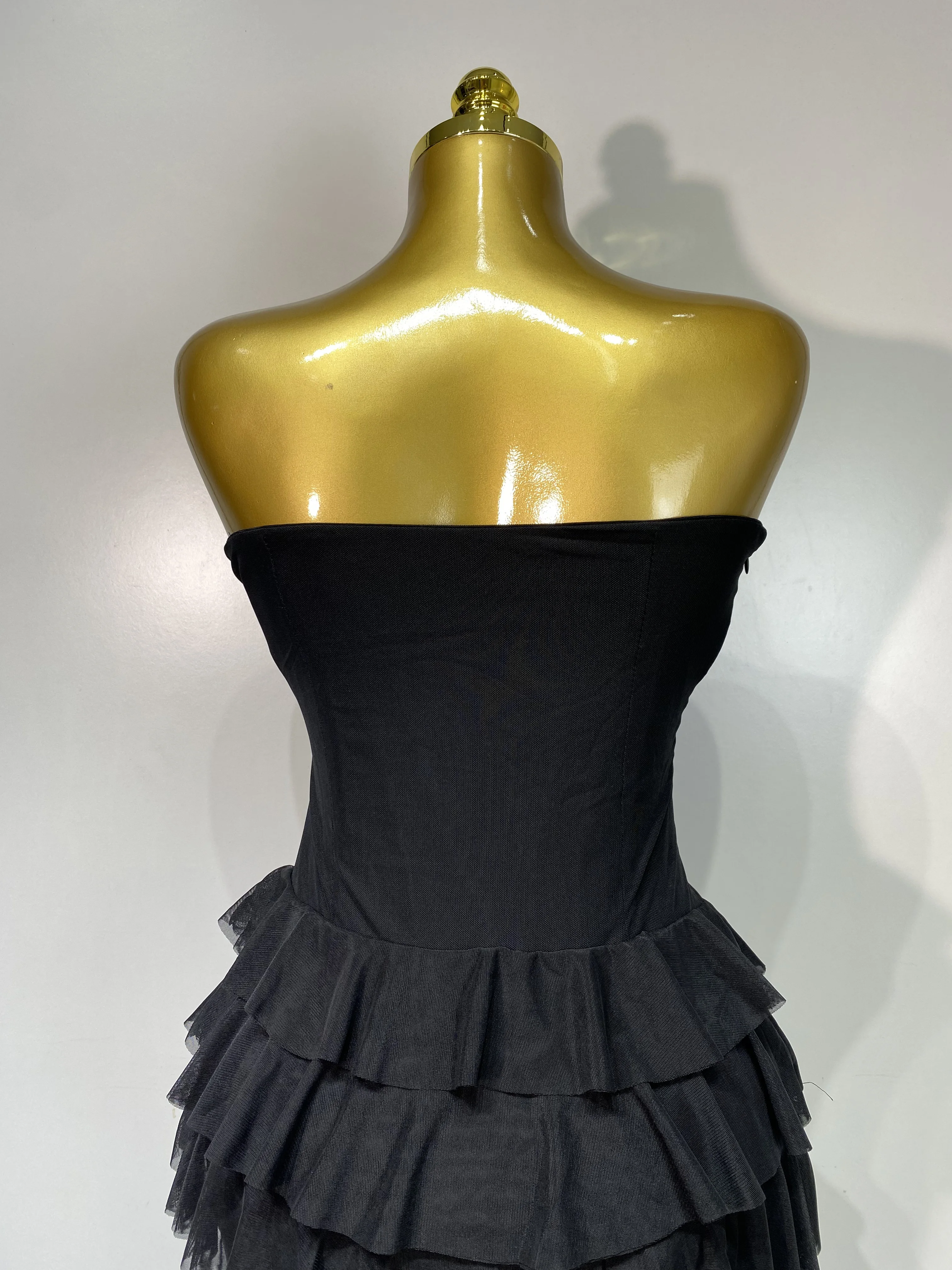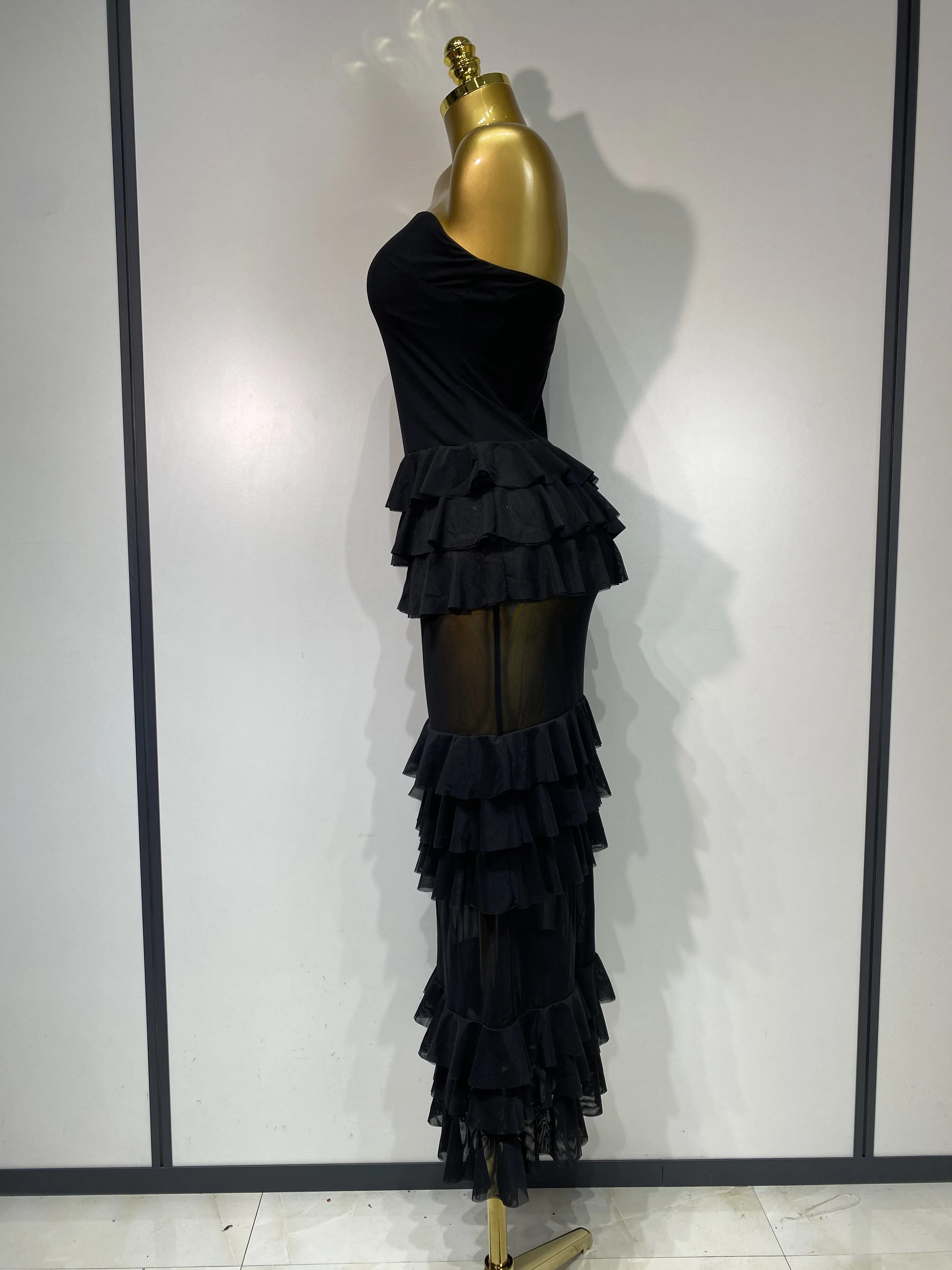 QueenLine Celebrity Sexy Strapless Ruffles Long Black Backless Mesh See Through Design Evening Birthday Dress