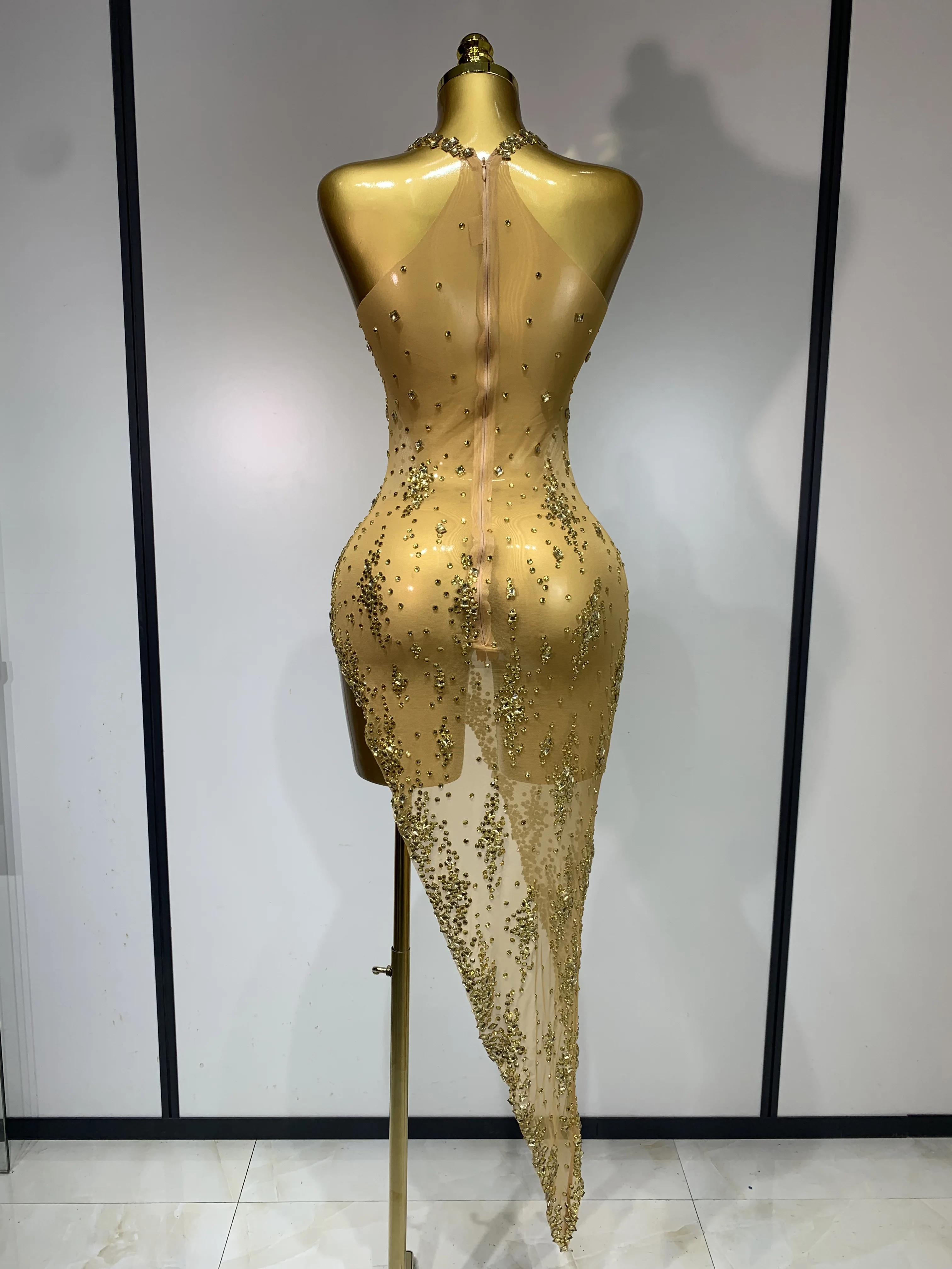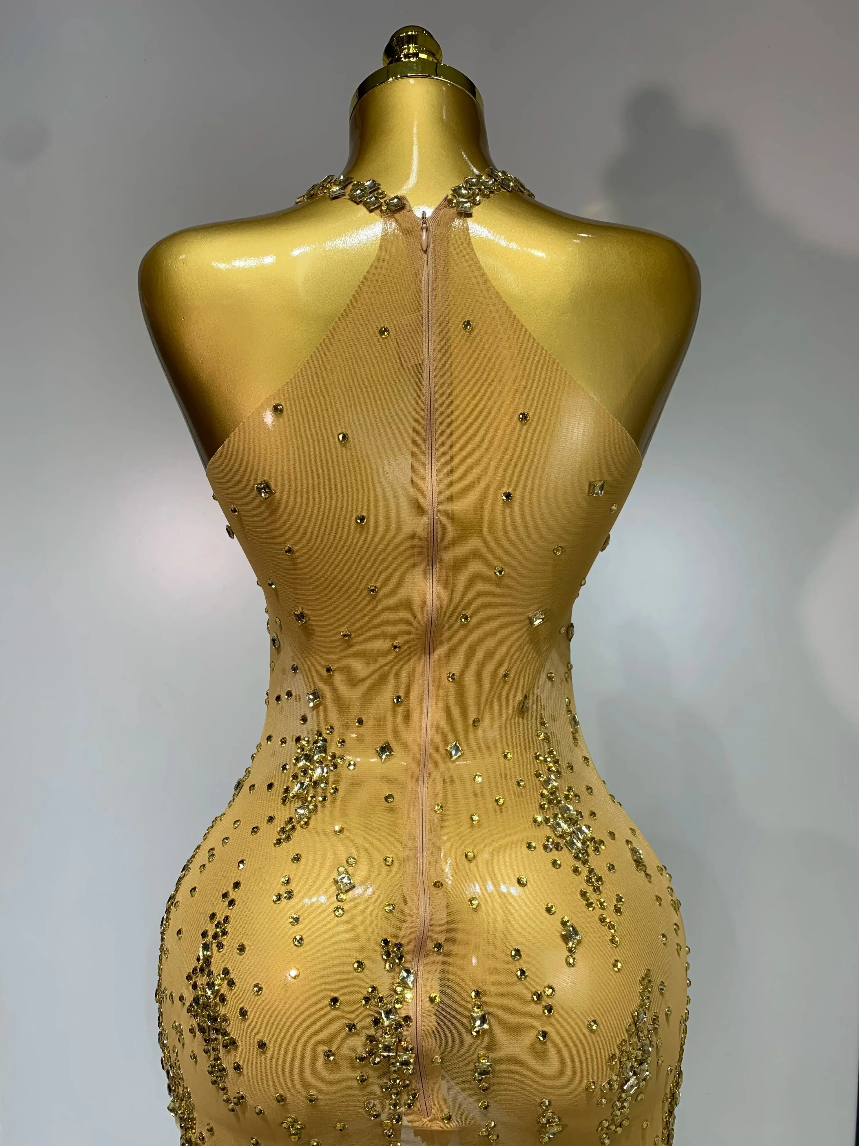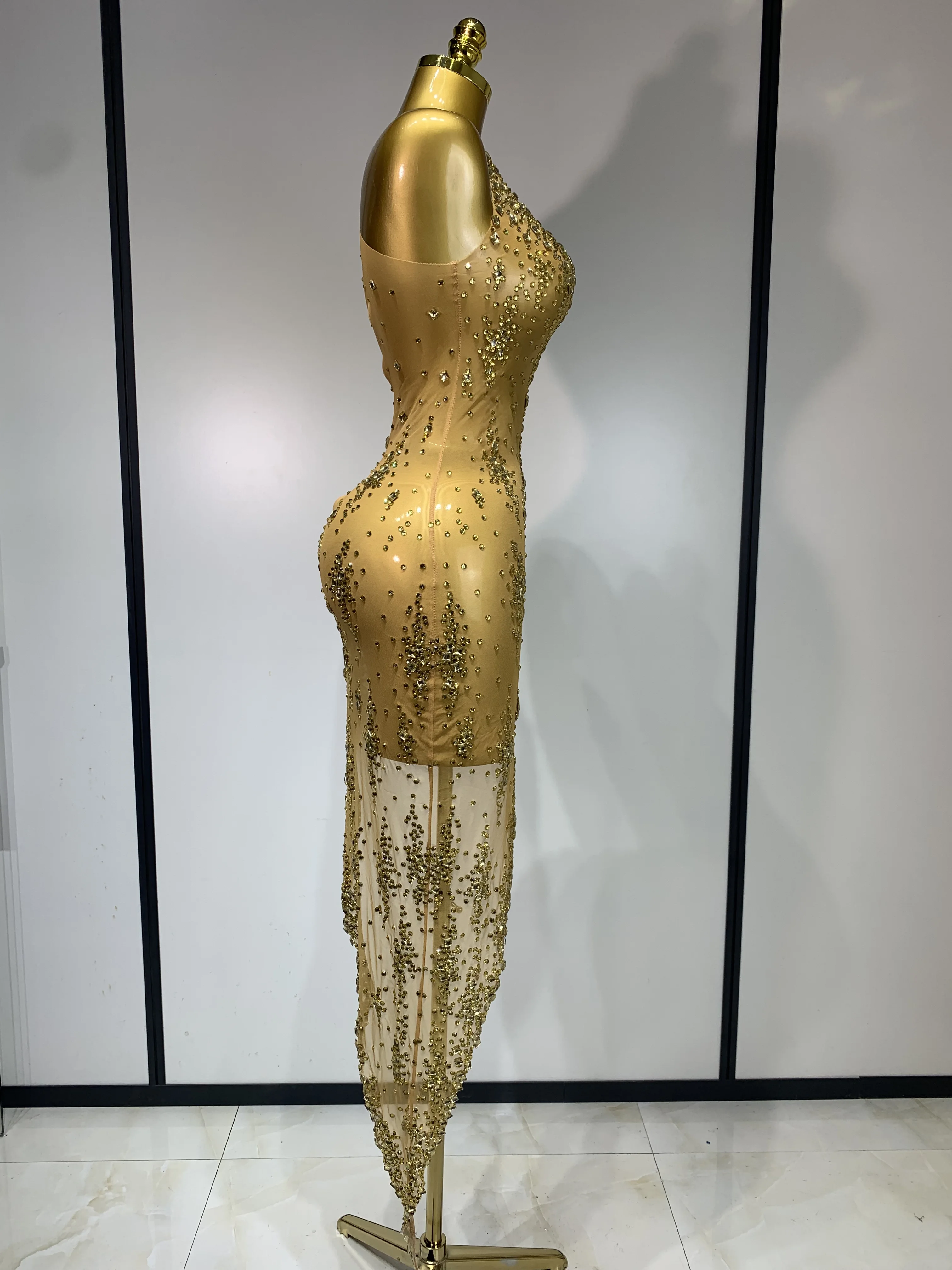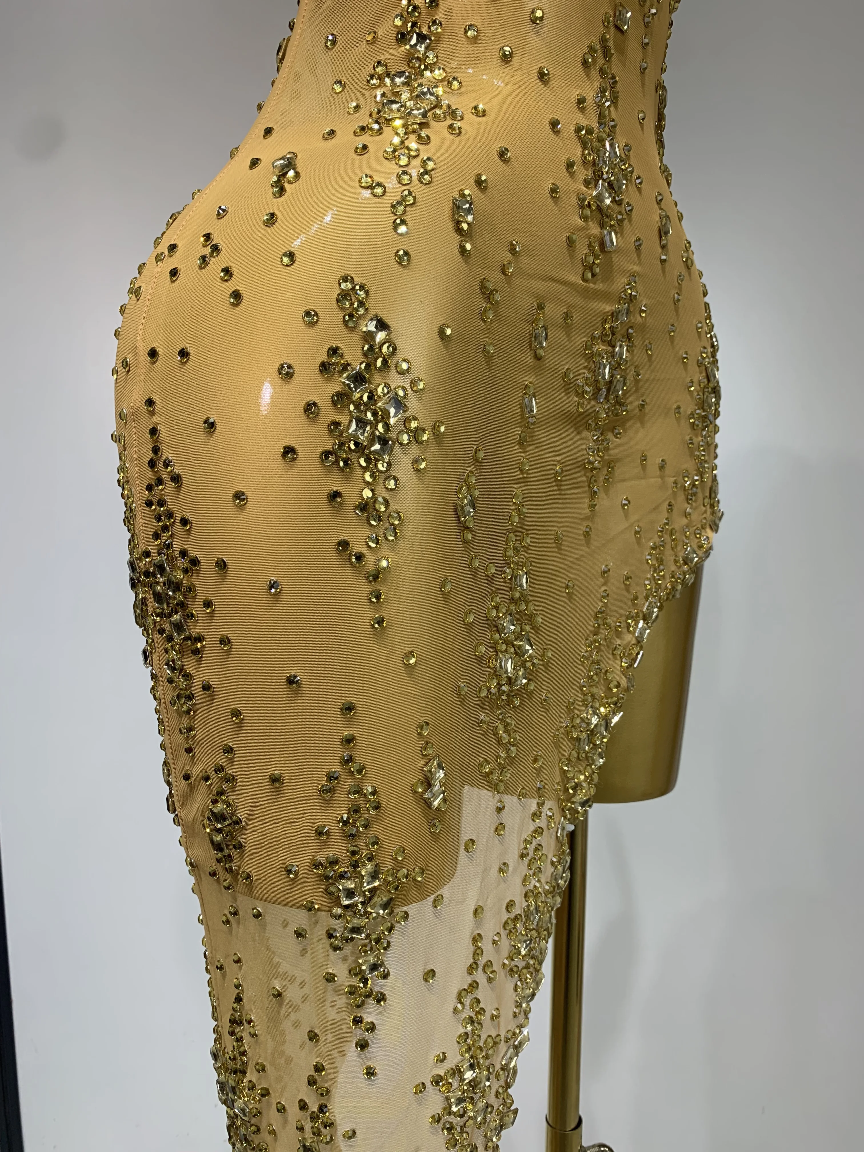 QueenLine Celebrity Sparkly Crystal Diamond Gold Sexy See-Through Sheath Performance Custome Birthday Evening Dress