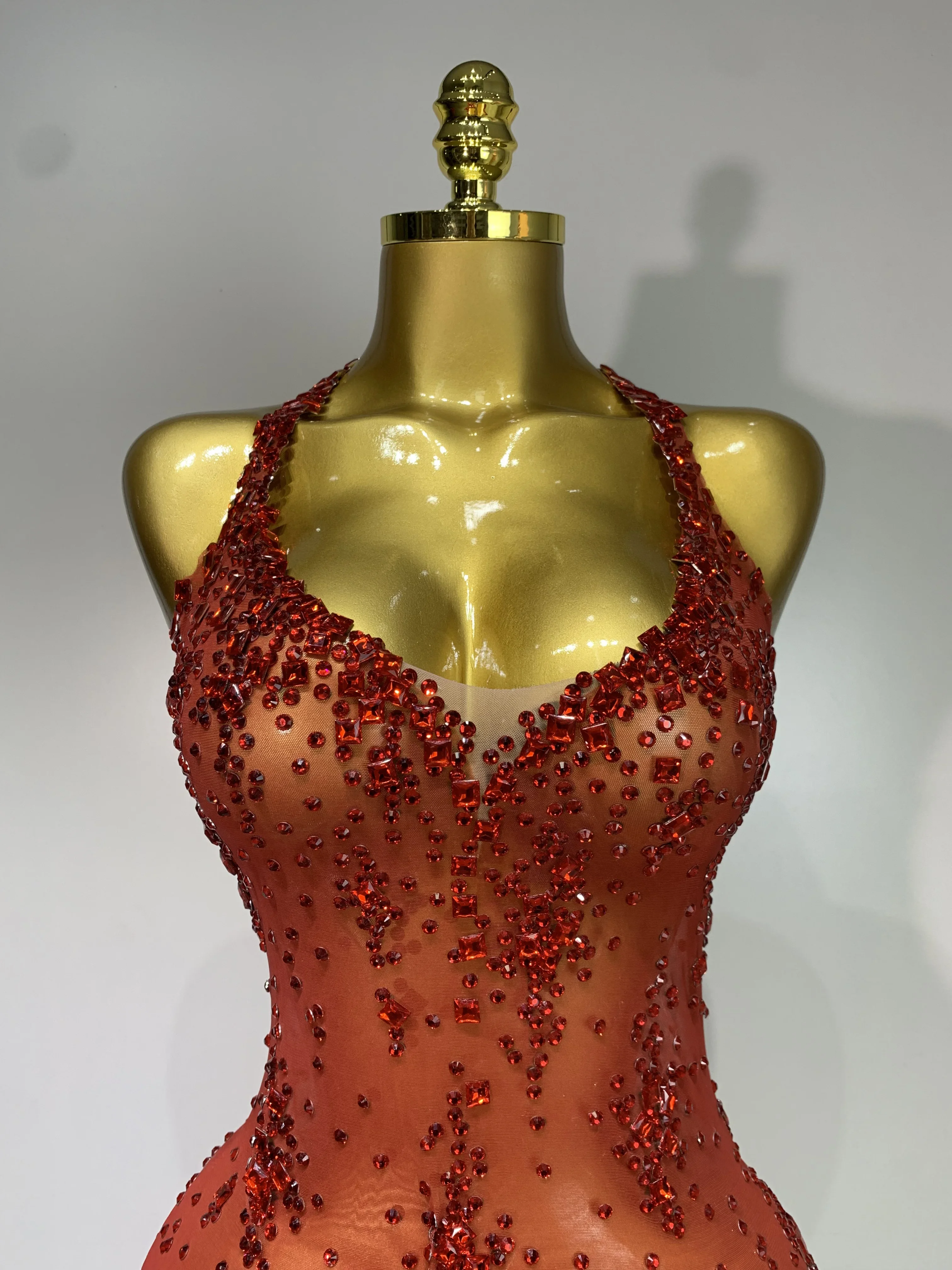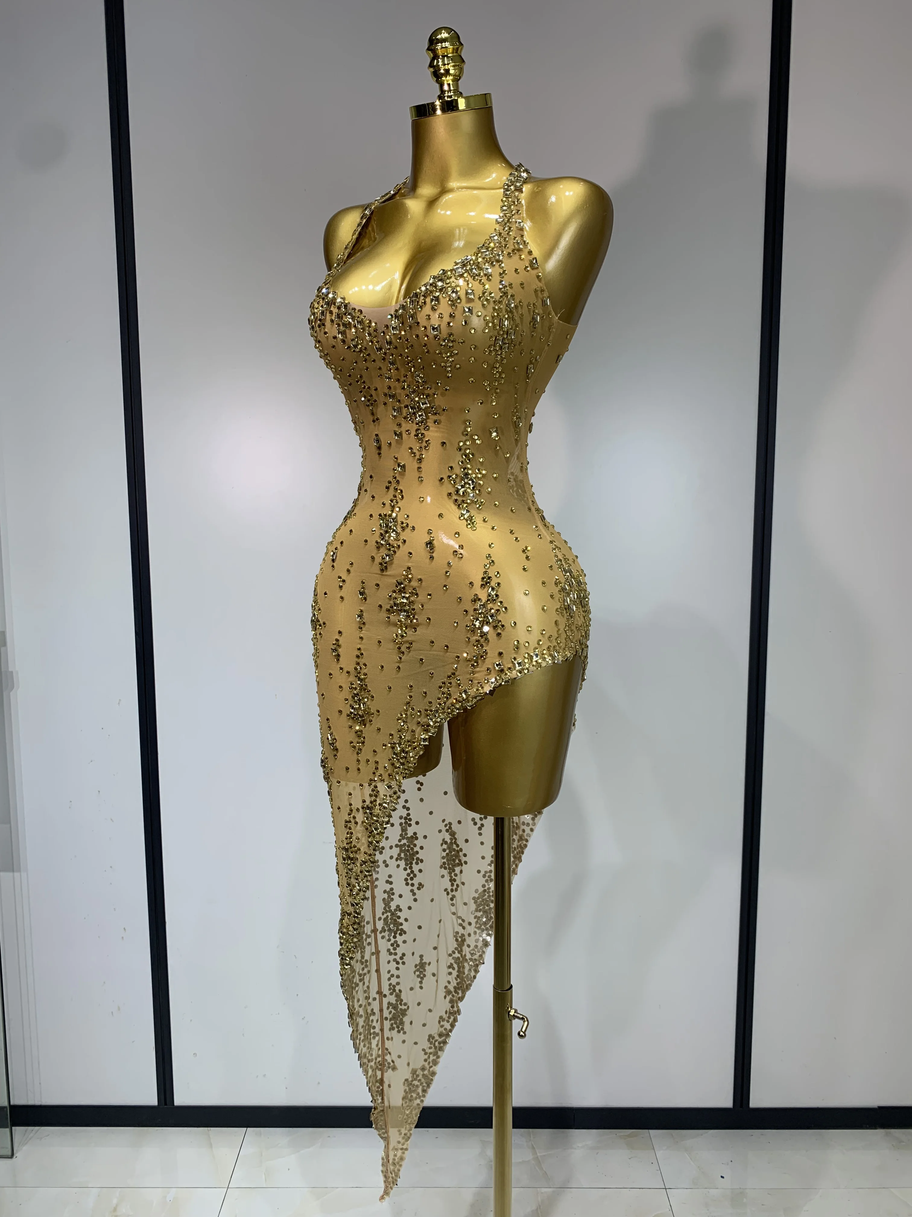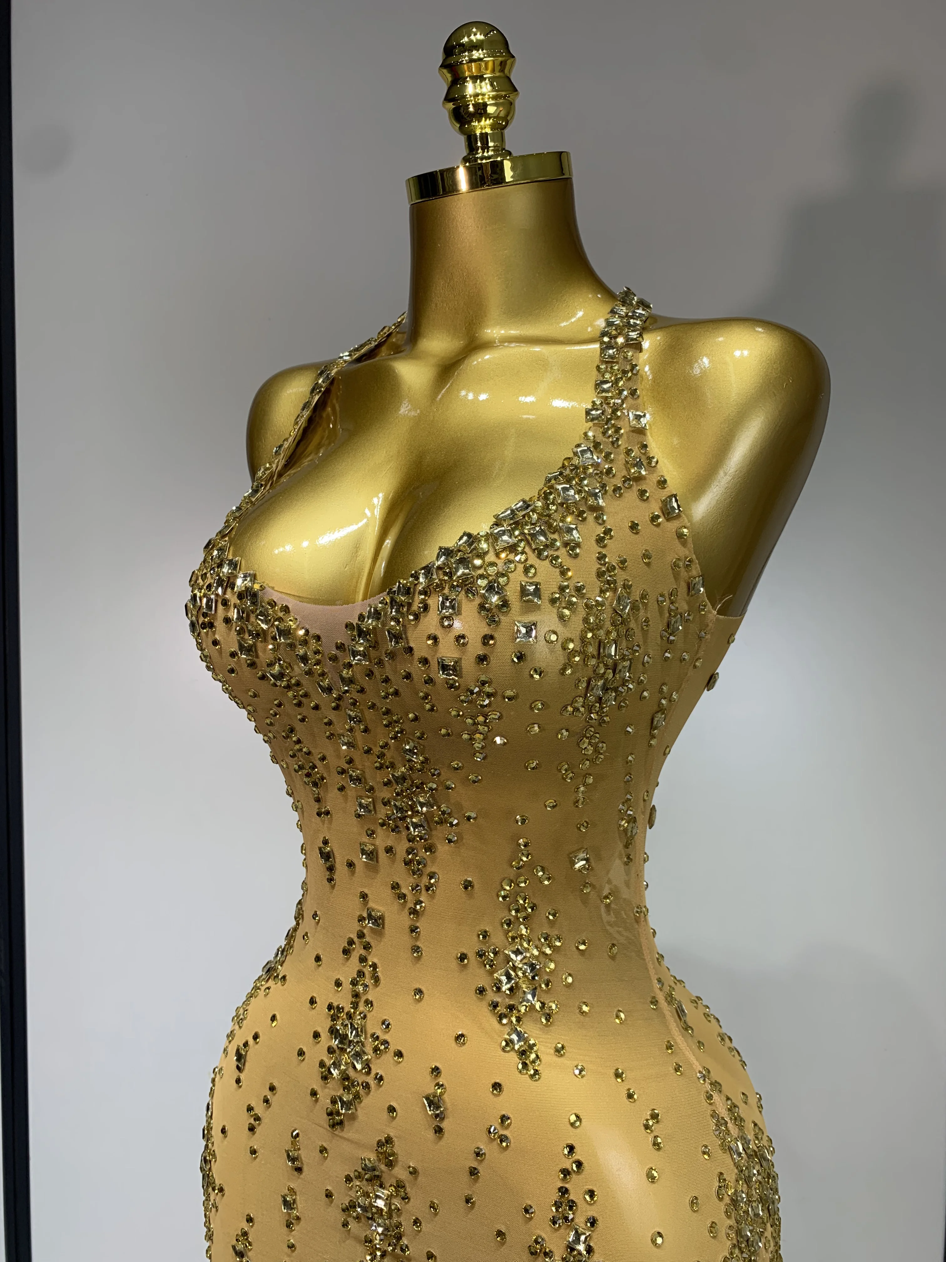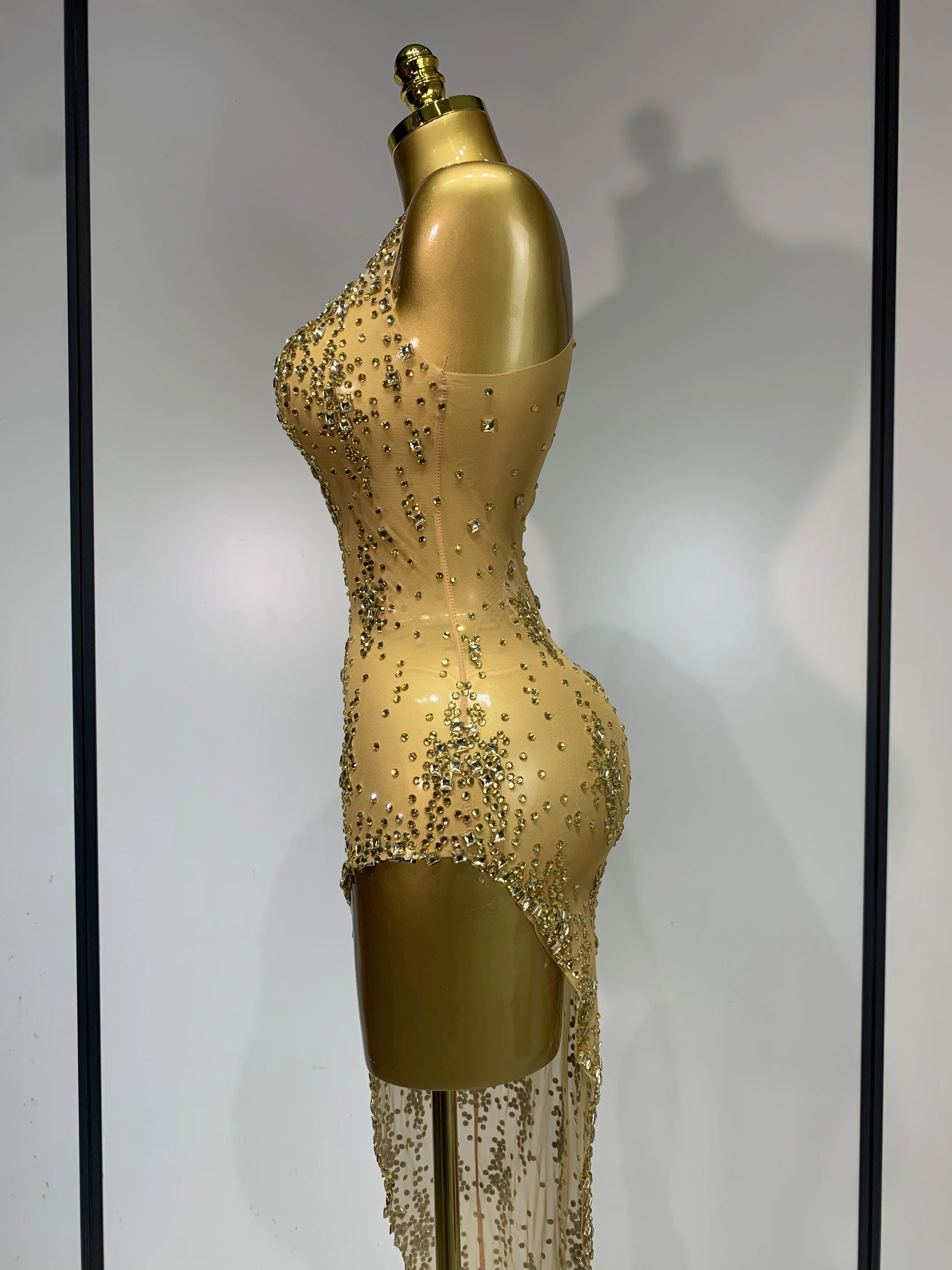 QueenLine Celebrity Sparkly Crystal Diamond Gold Sexy See-Through Sheath Performance Custome Birthday Evening Dress