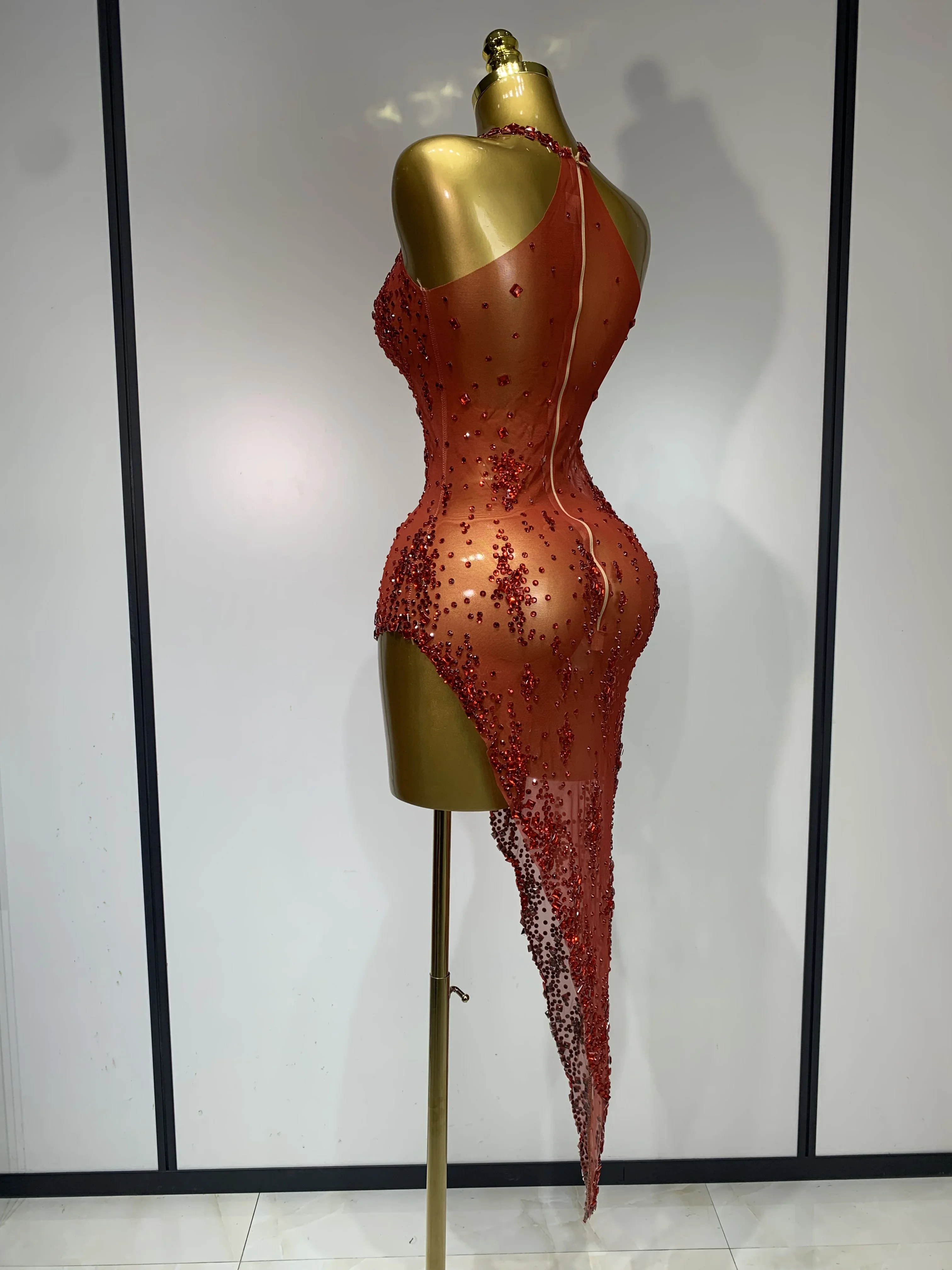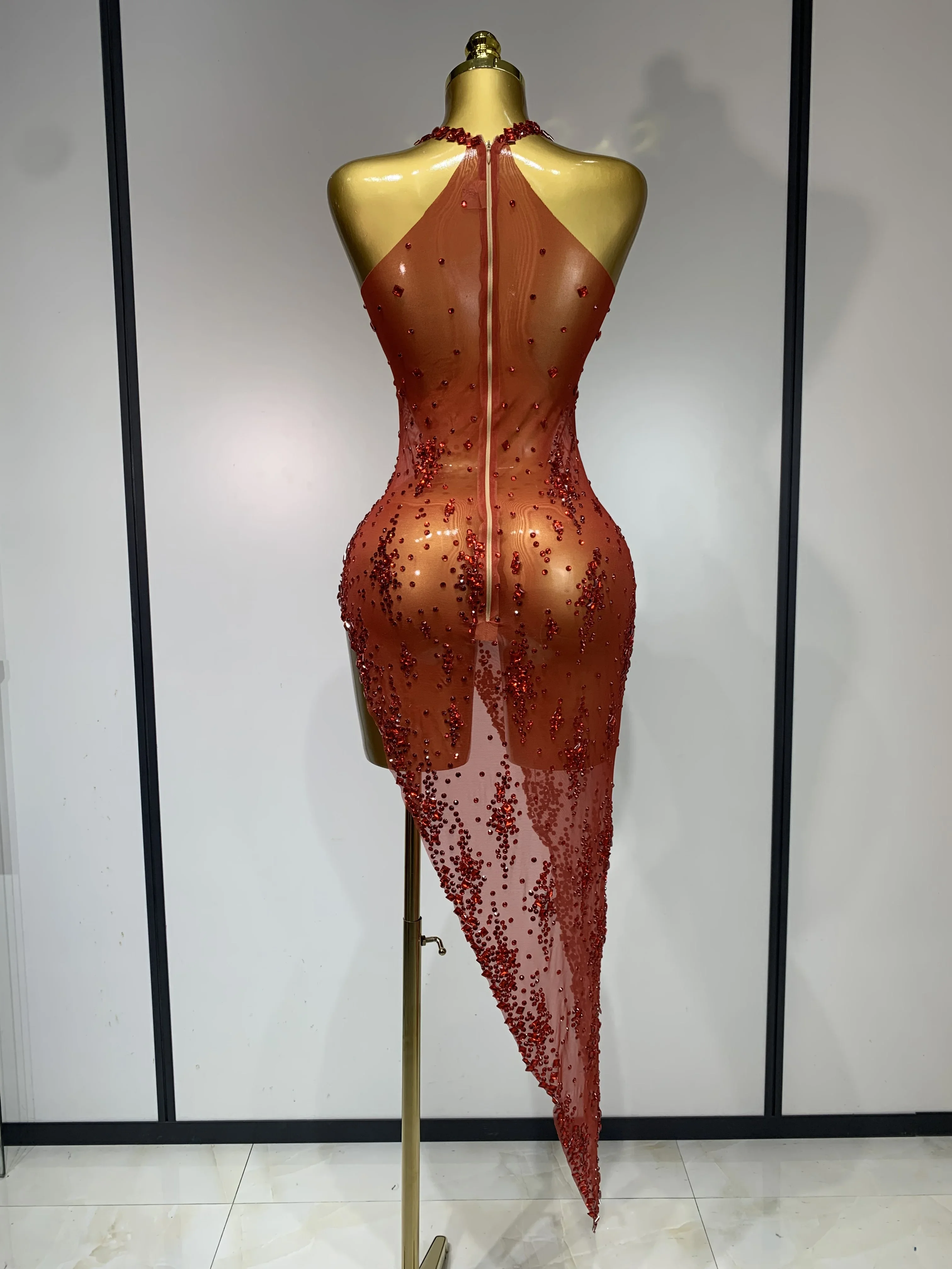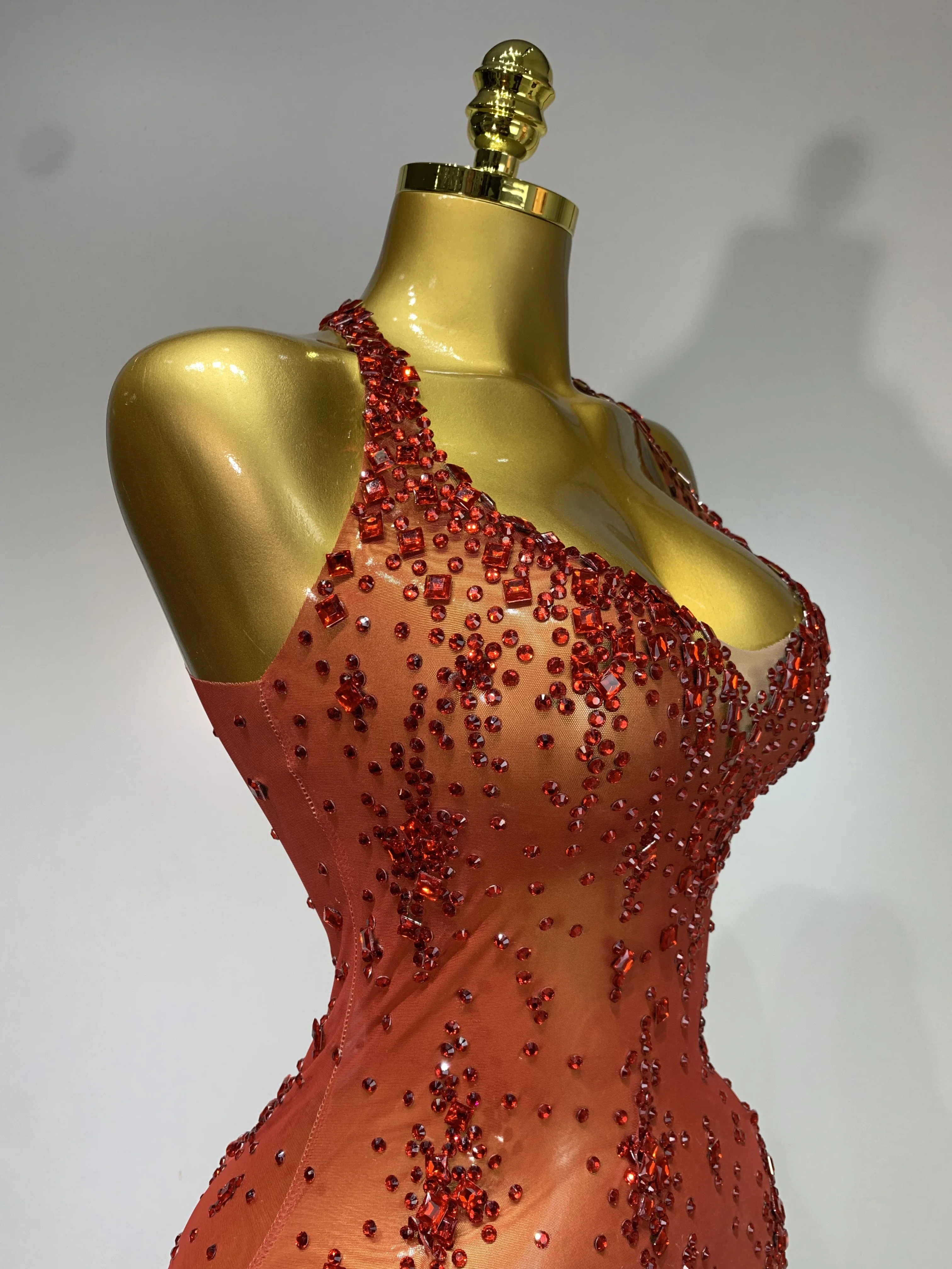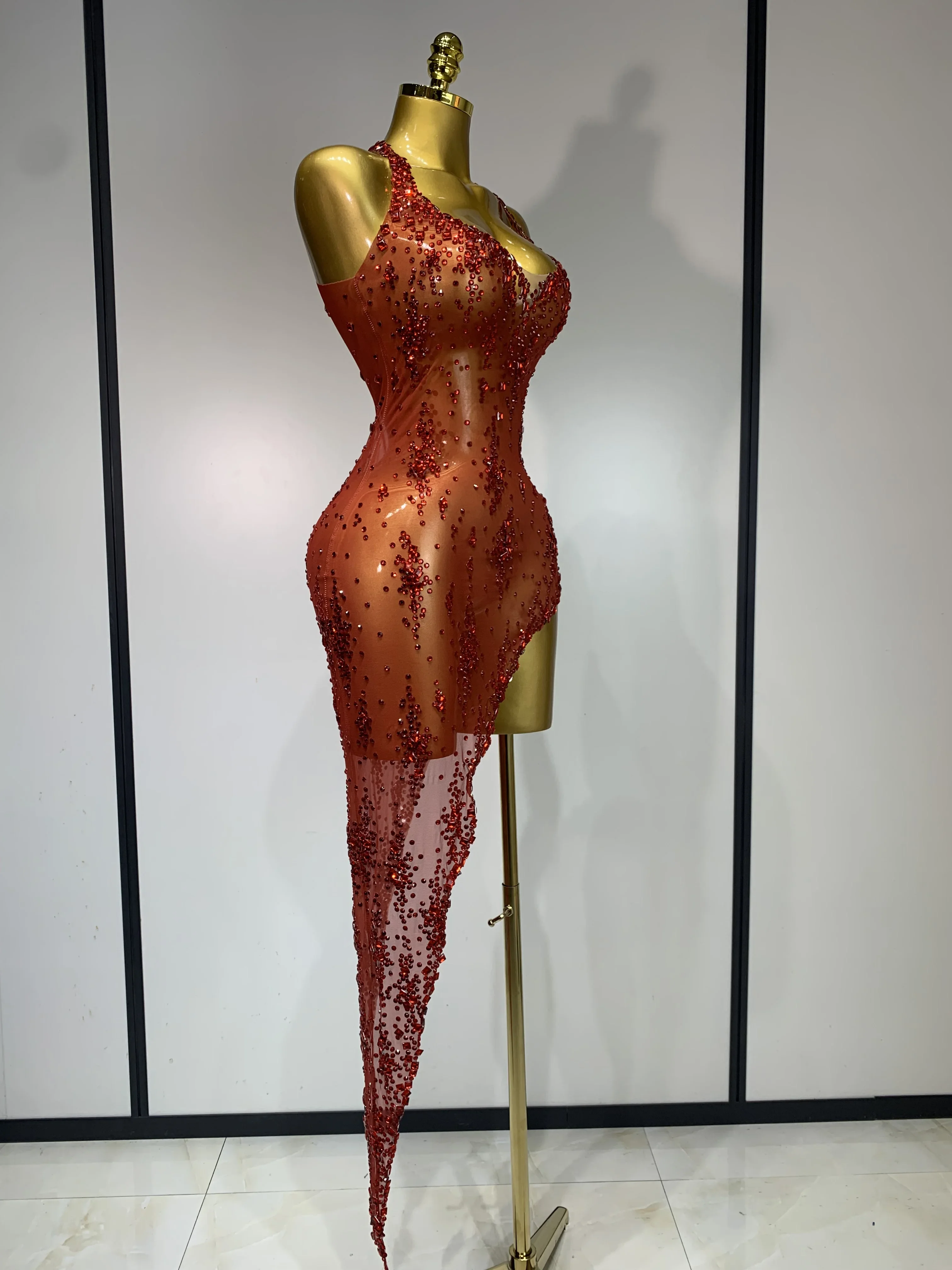 QueenLine Celebrity Sparkly Crystal Diamond Gold Sexy See-Through Sheath Performance Custome Birthday Evening Dress