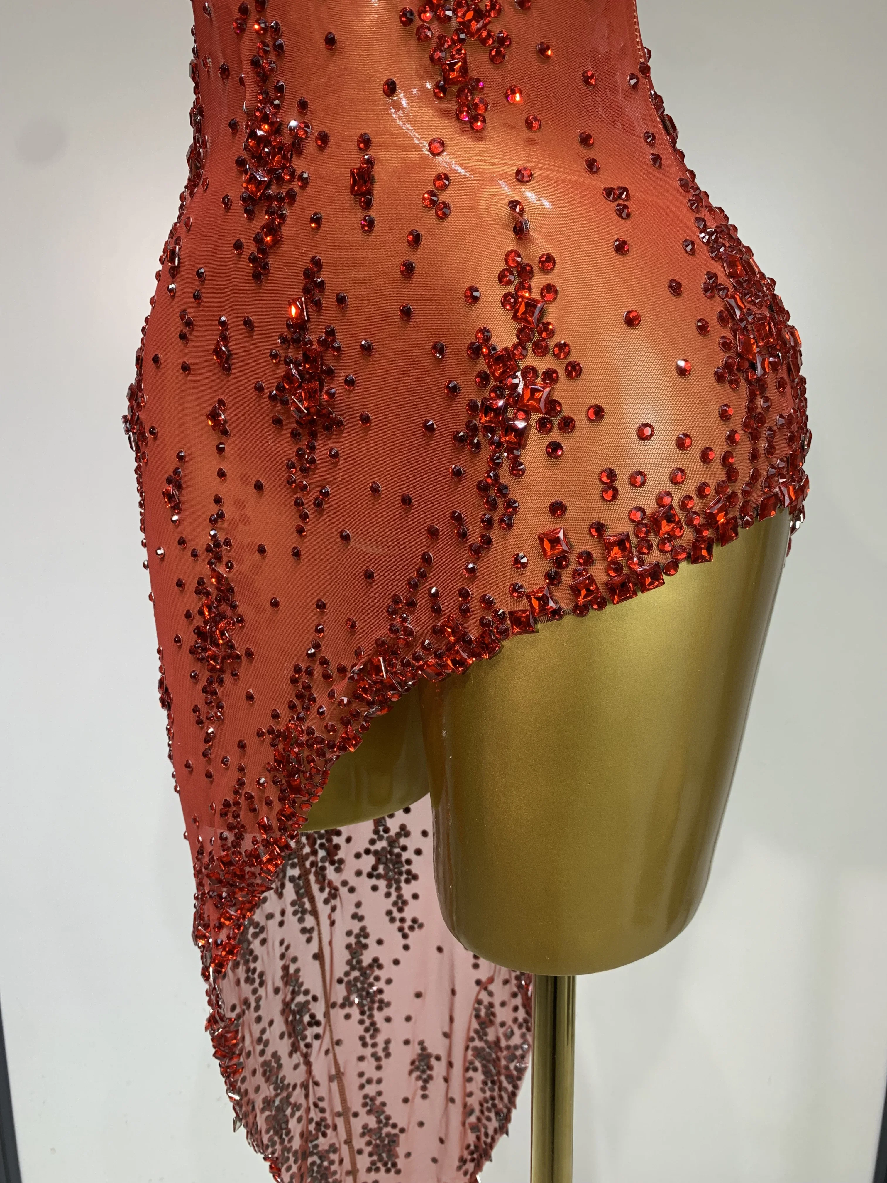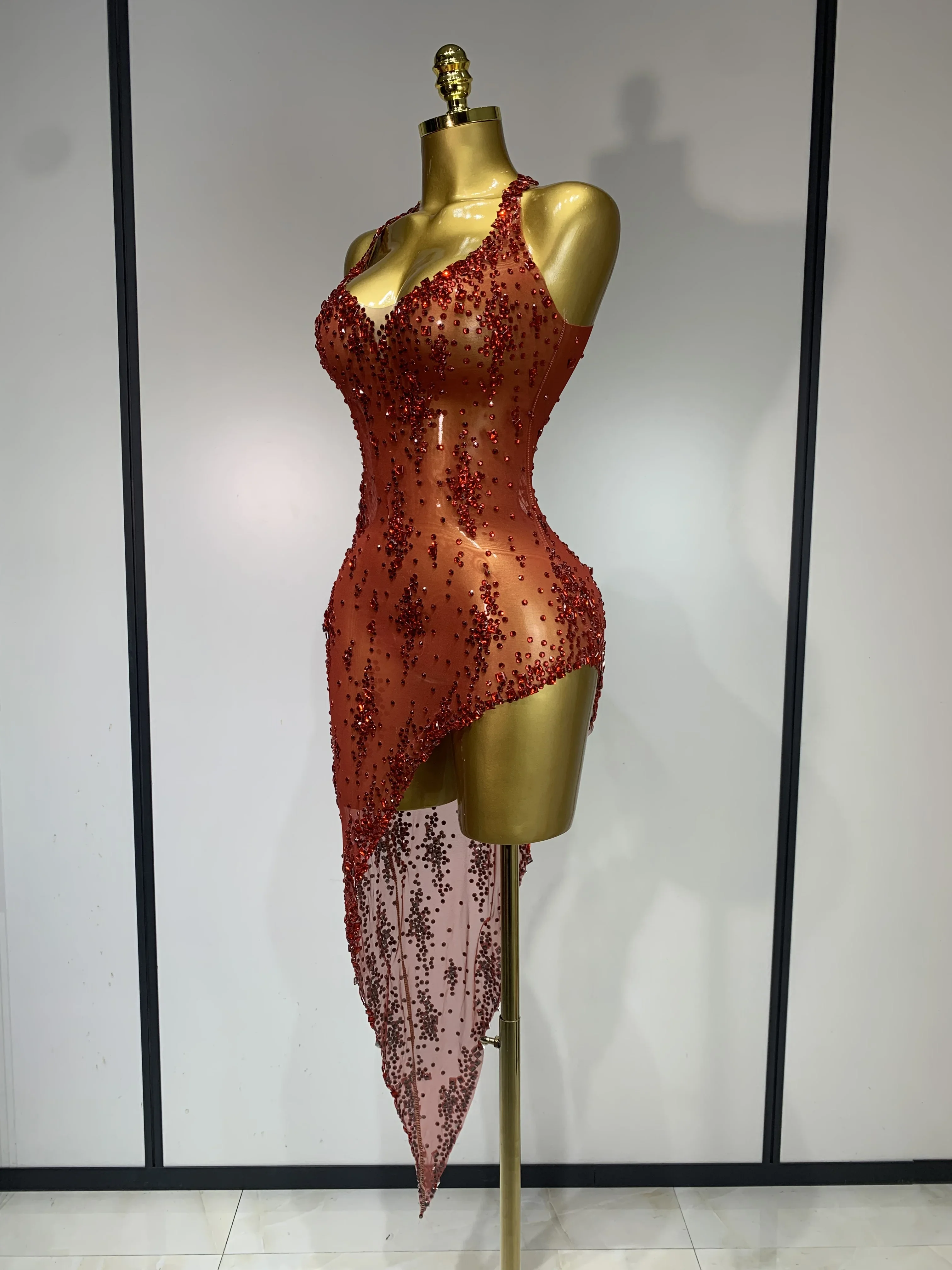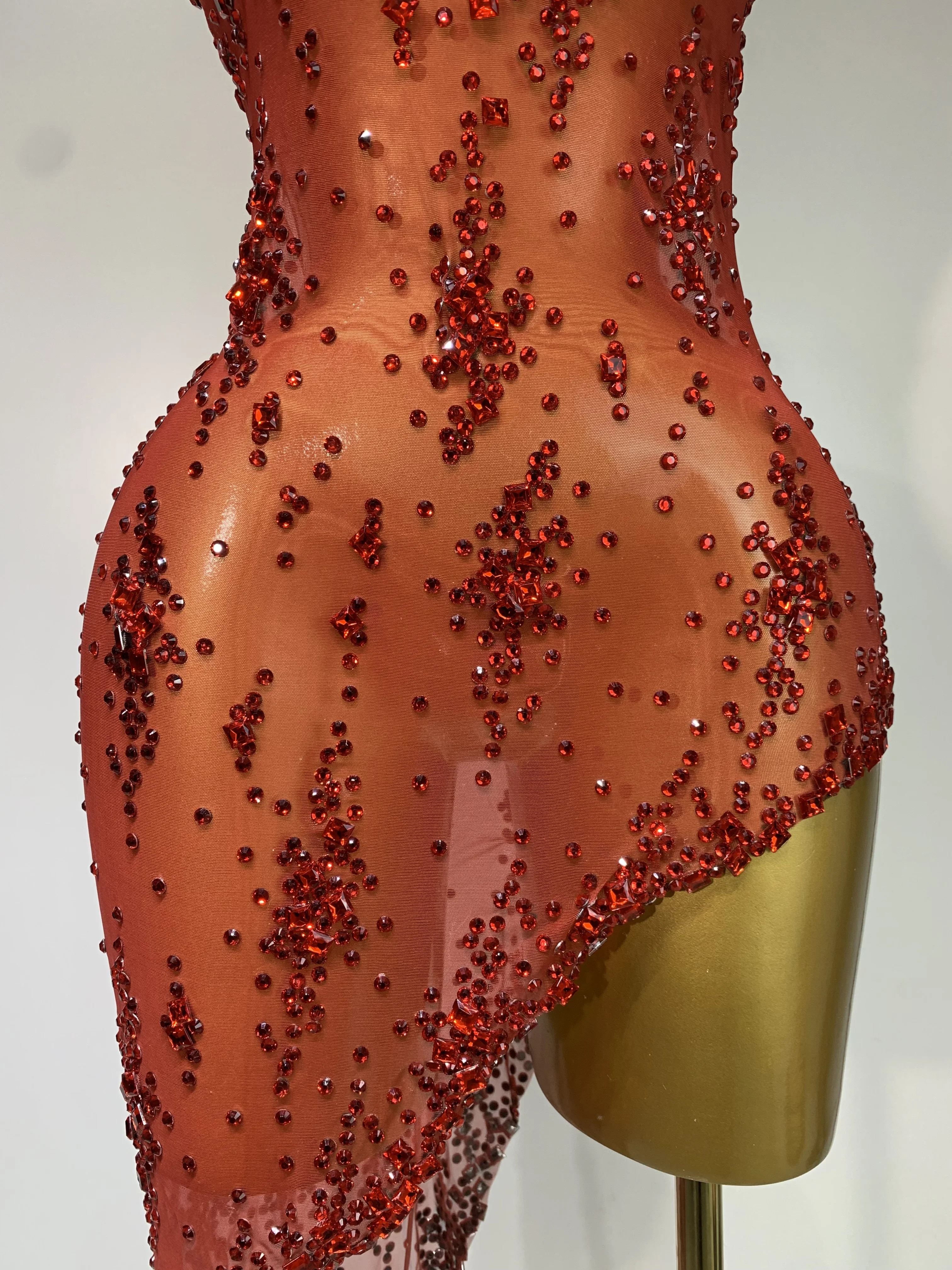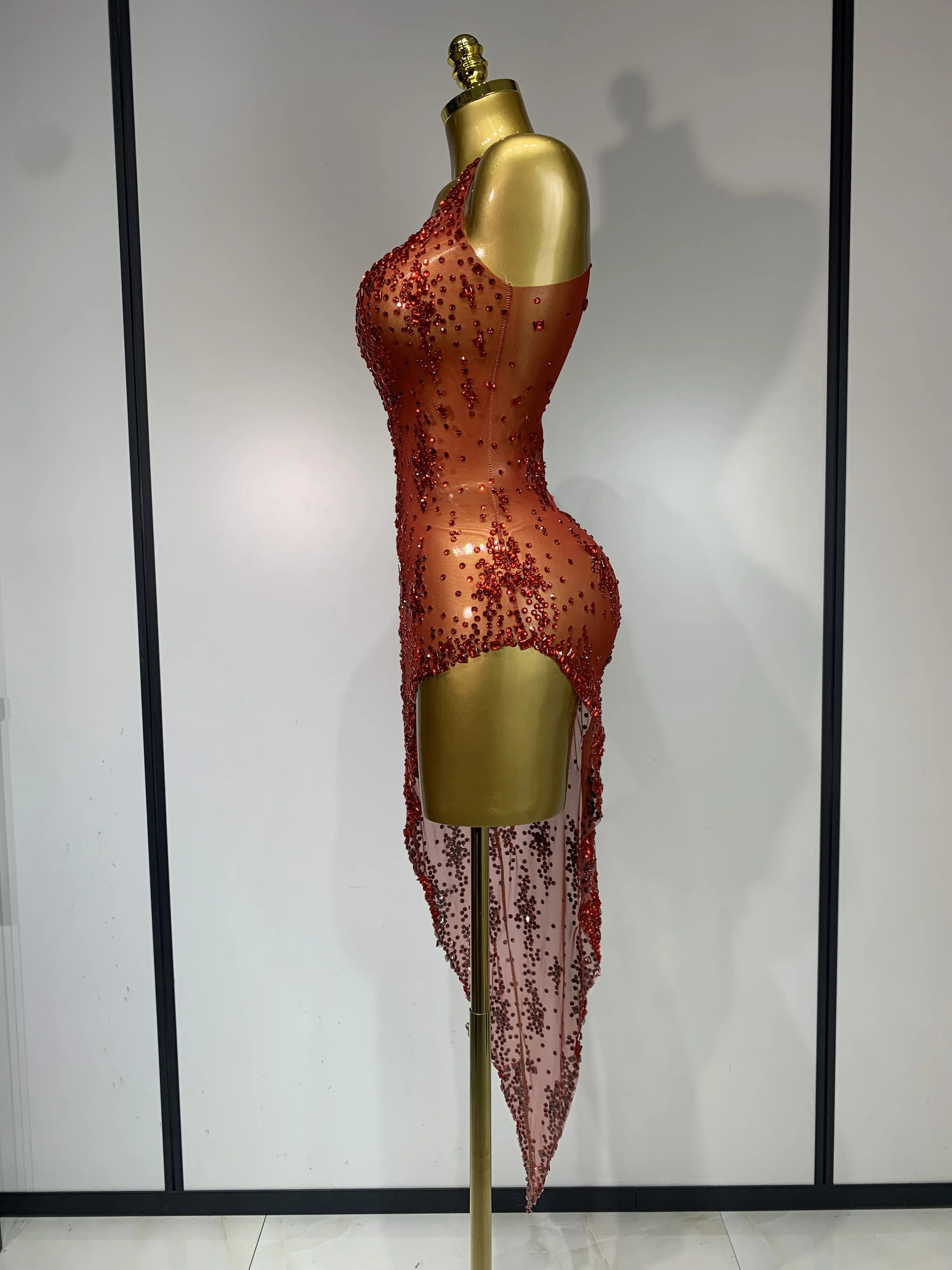 QueenLine Celebrity Sparkly Crystal Diamond Gold Sexy See-Through Sheath Performance Custome Birthday Evening Dress