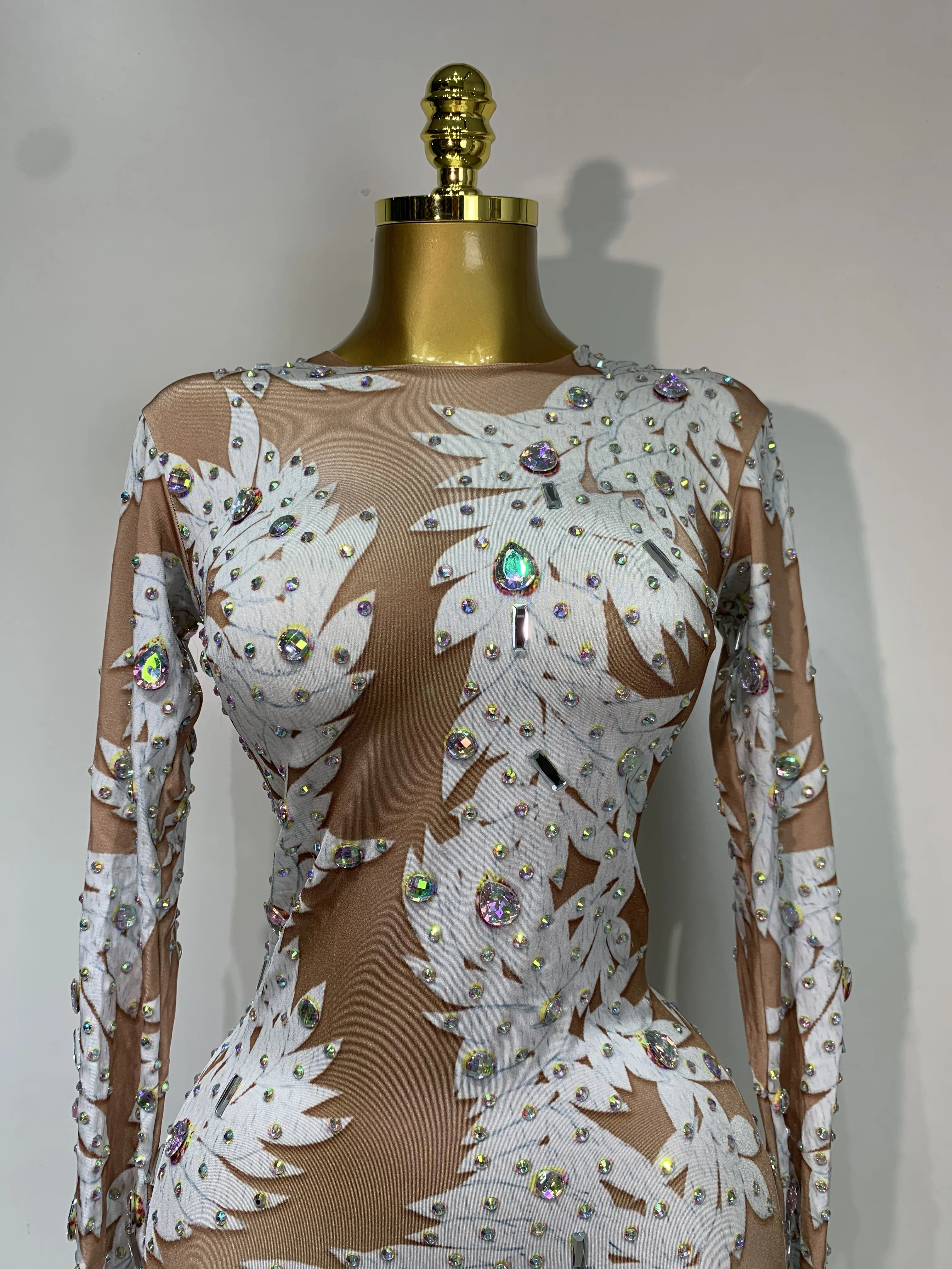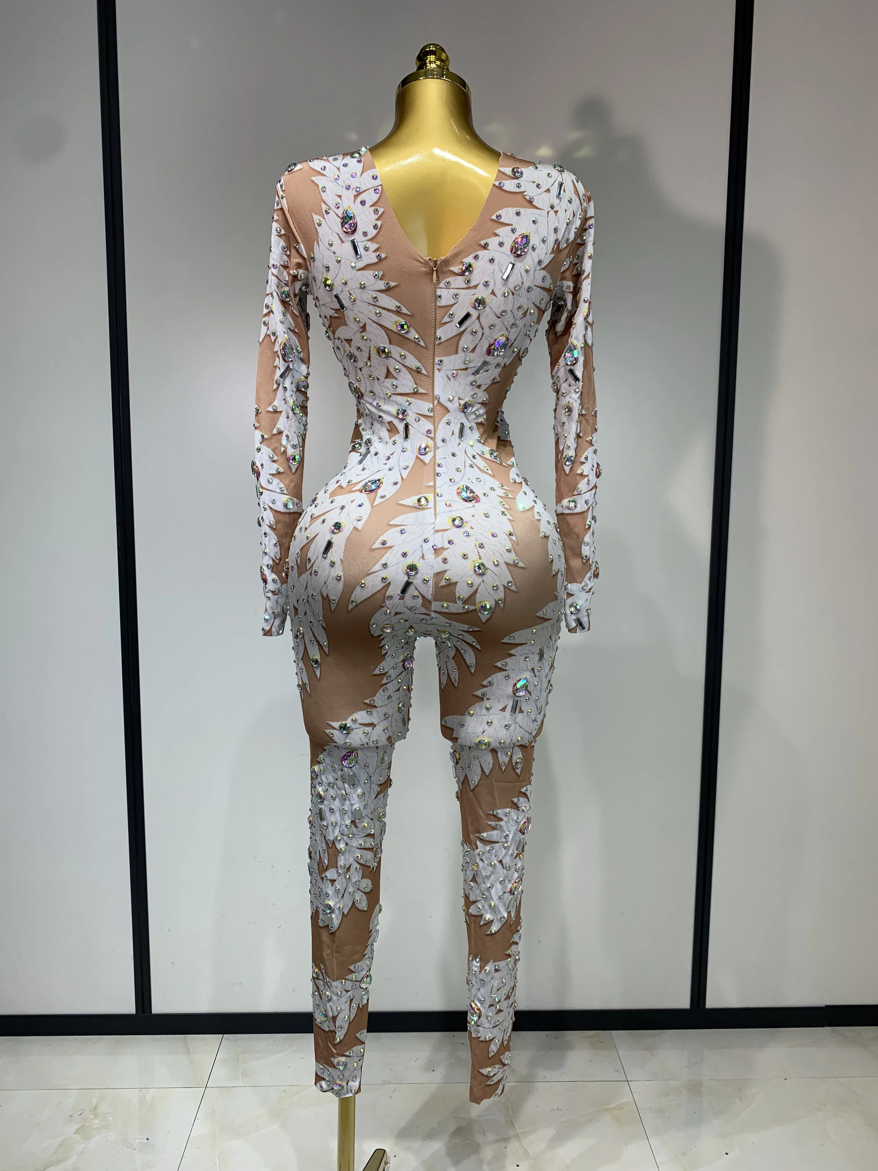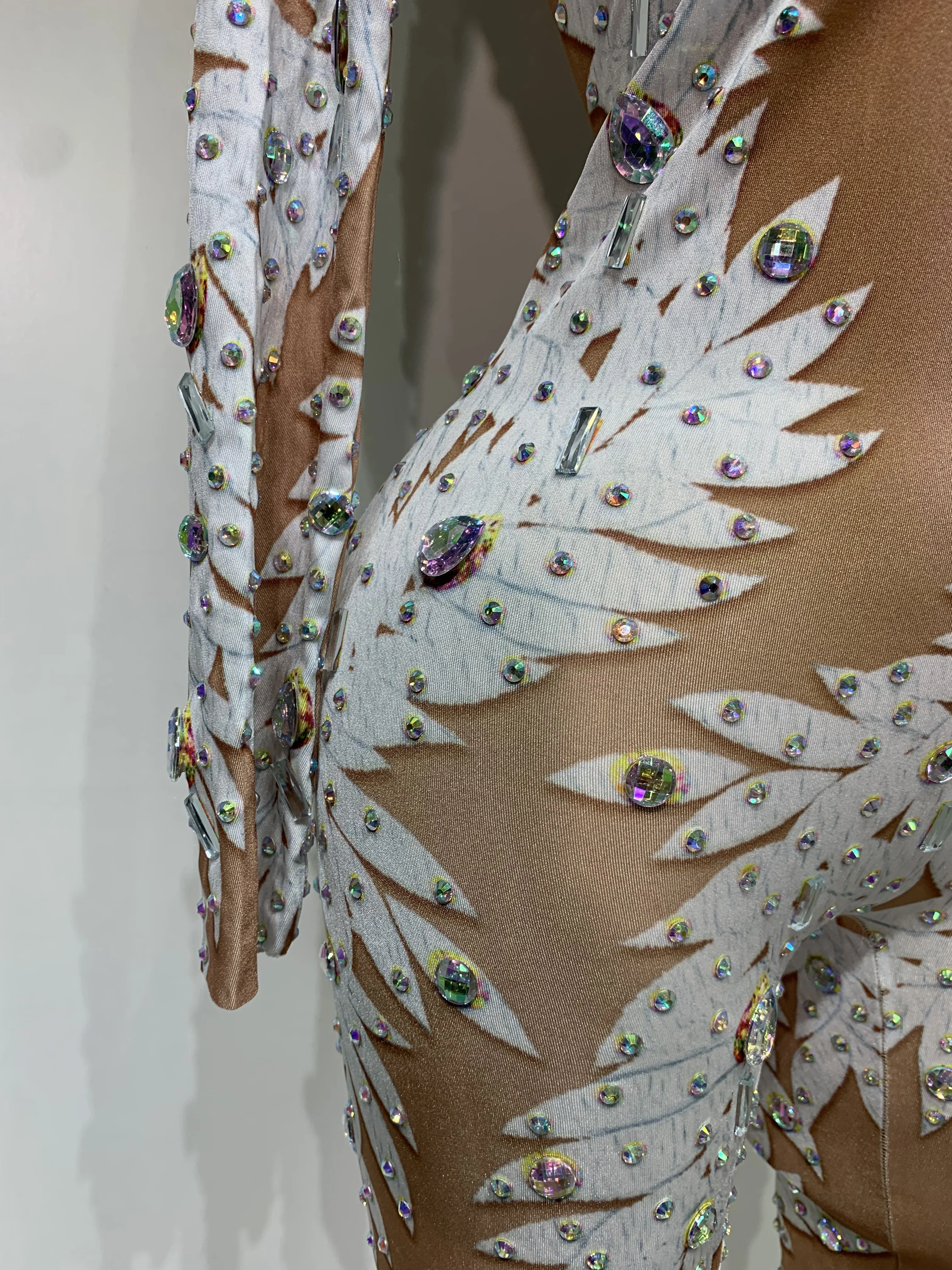 QueenLine Celebrity Sparkly Crystal High Stretch Bodycon Long sleeve Performance Jumpsuit