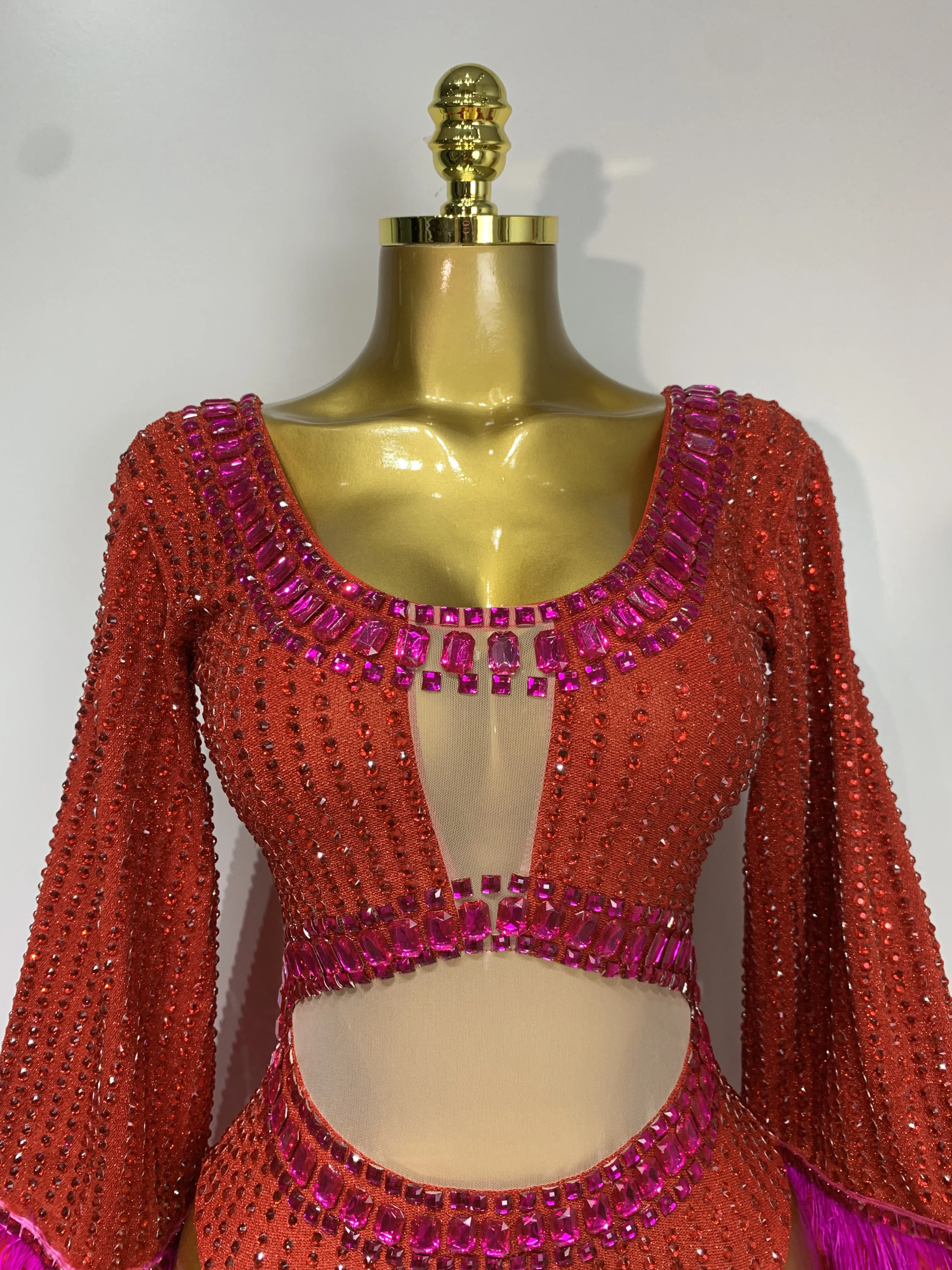 QueenLine Celebrity Sparkly Rhinestones Bodysuit Feathers Flare Sleever Sexy Performance Leotard Bodysuit