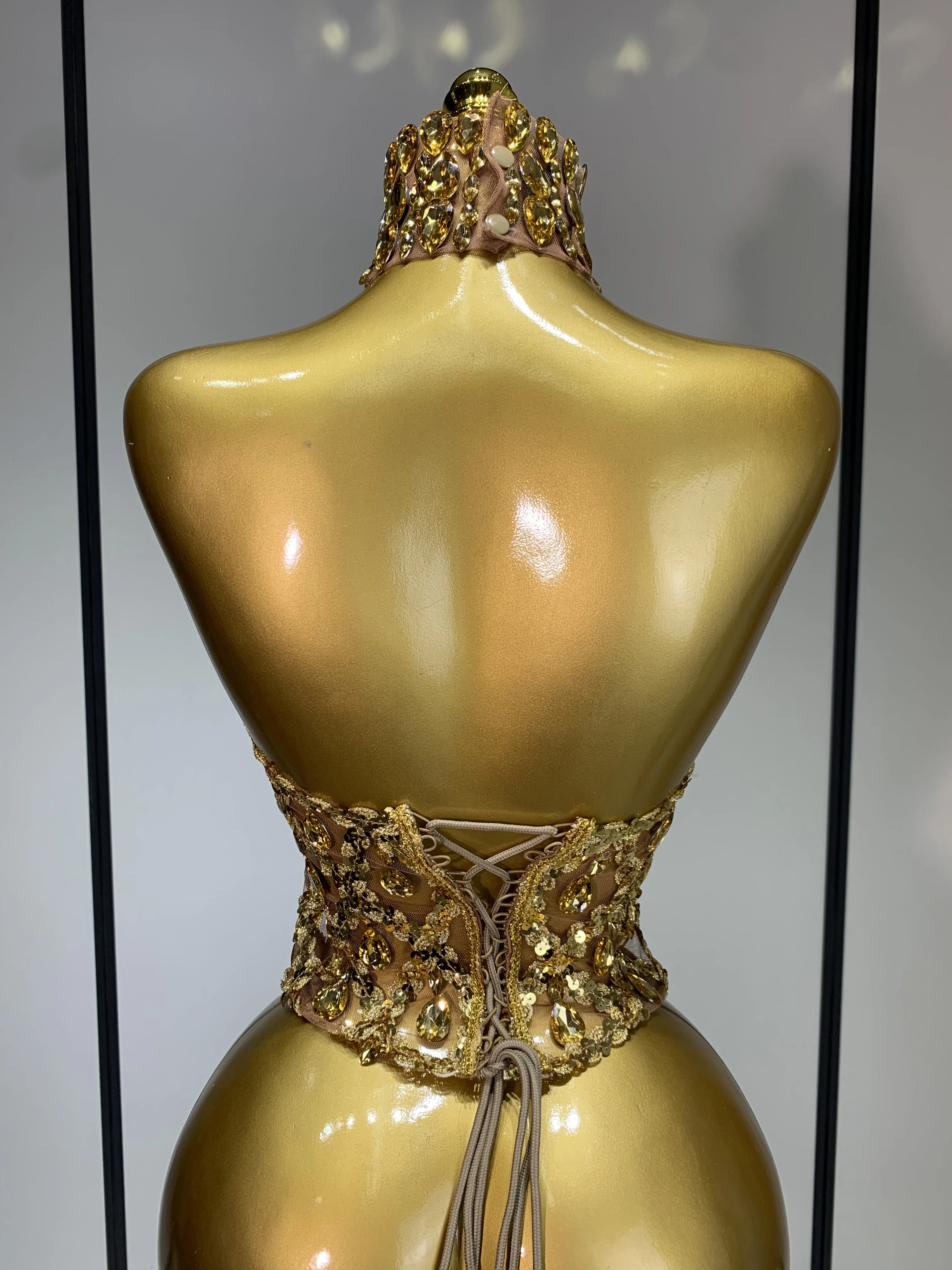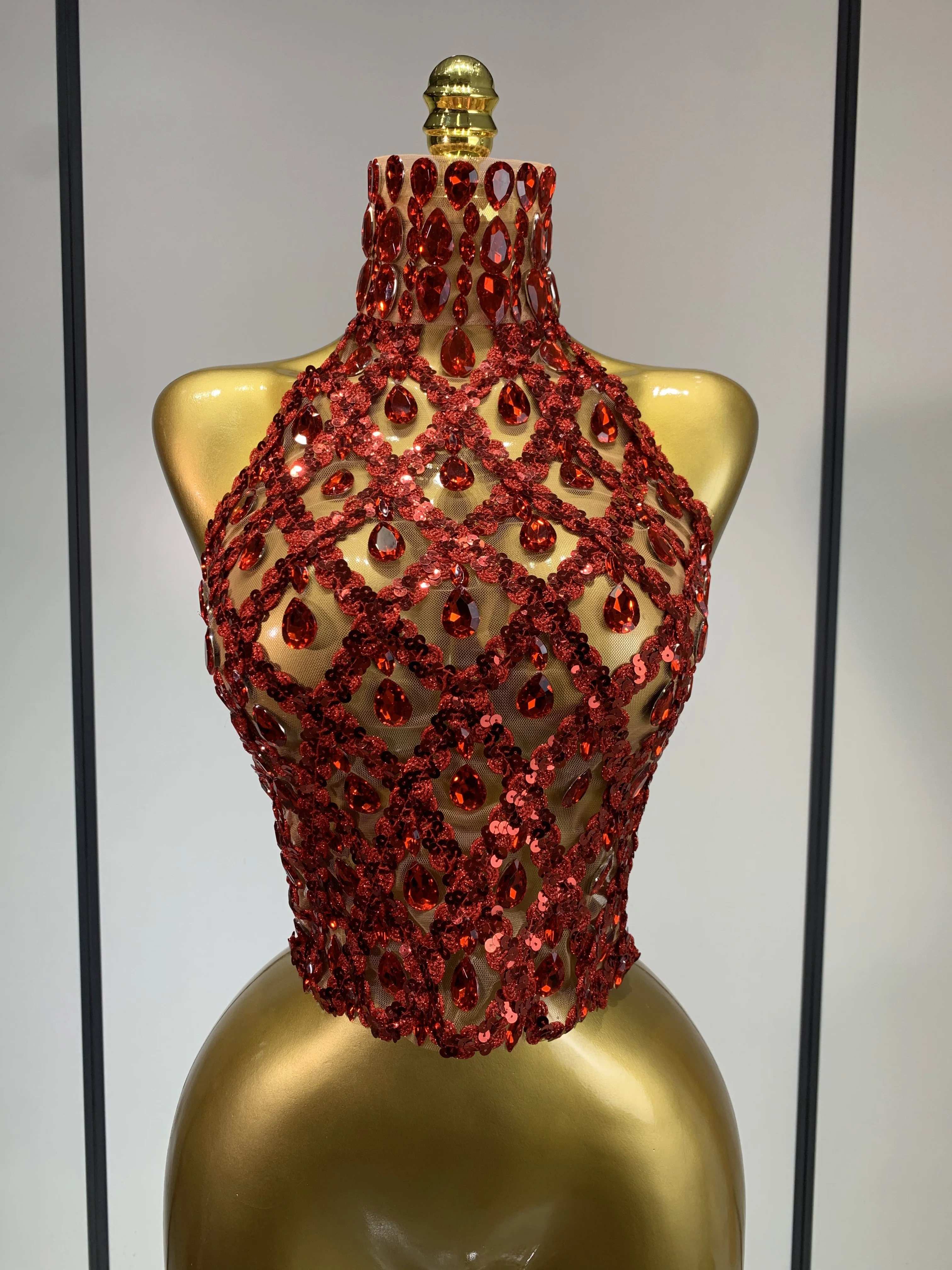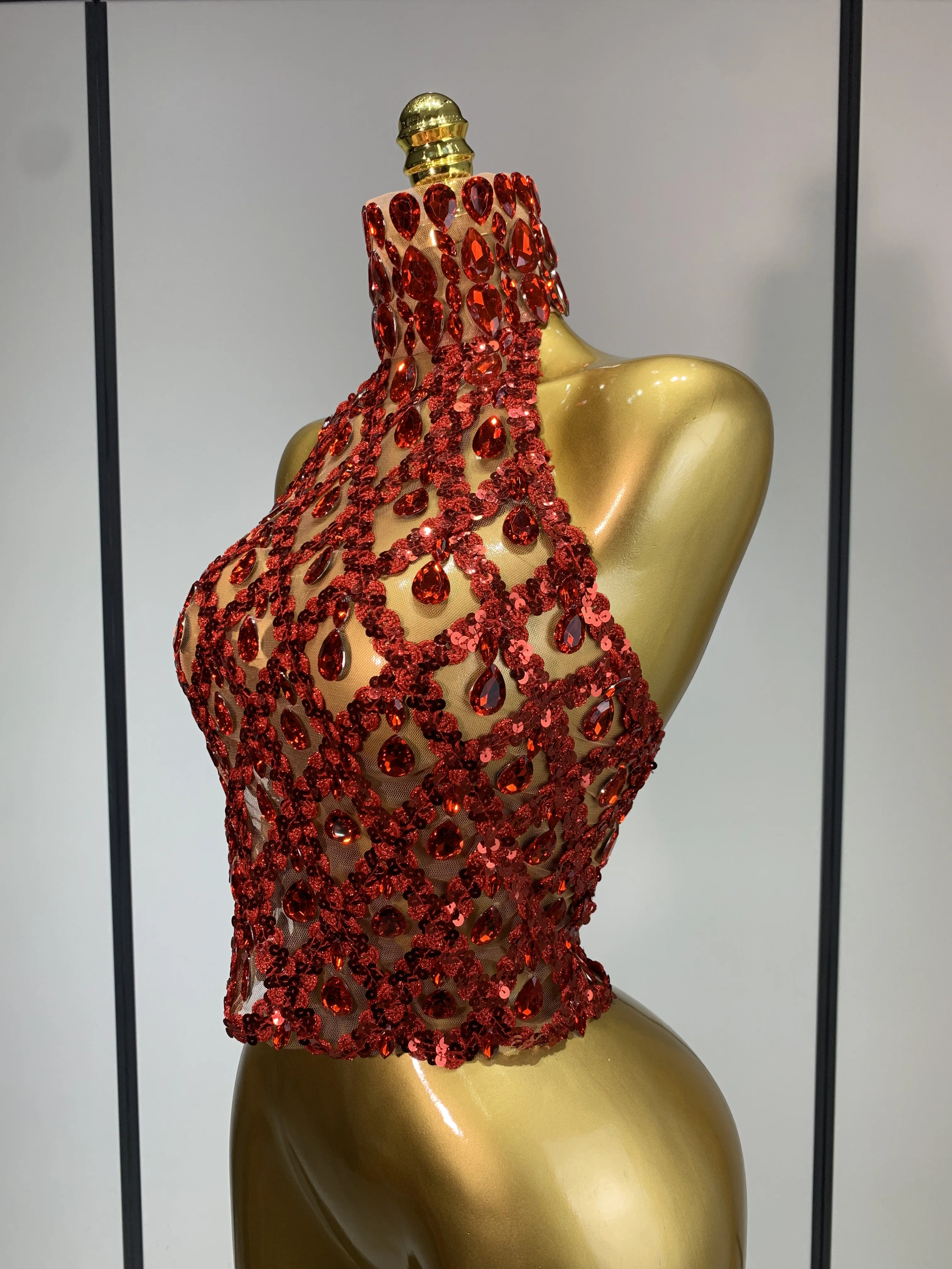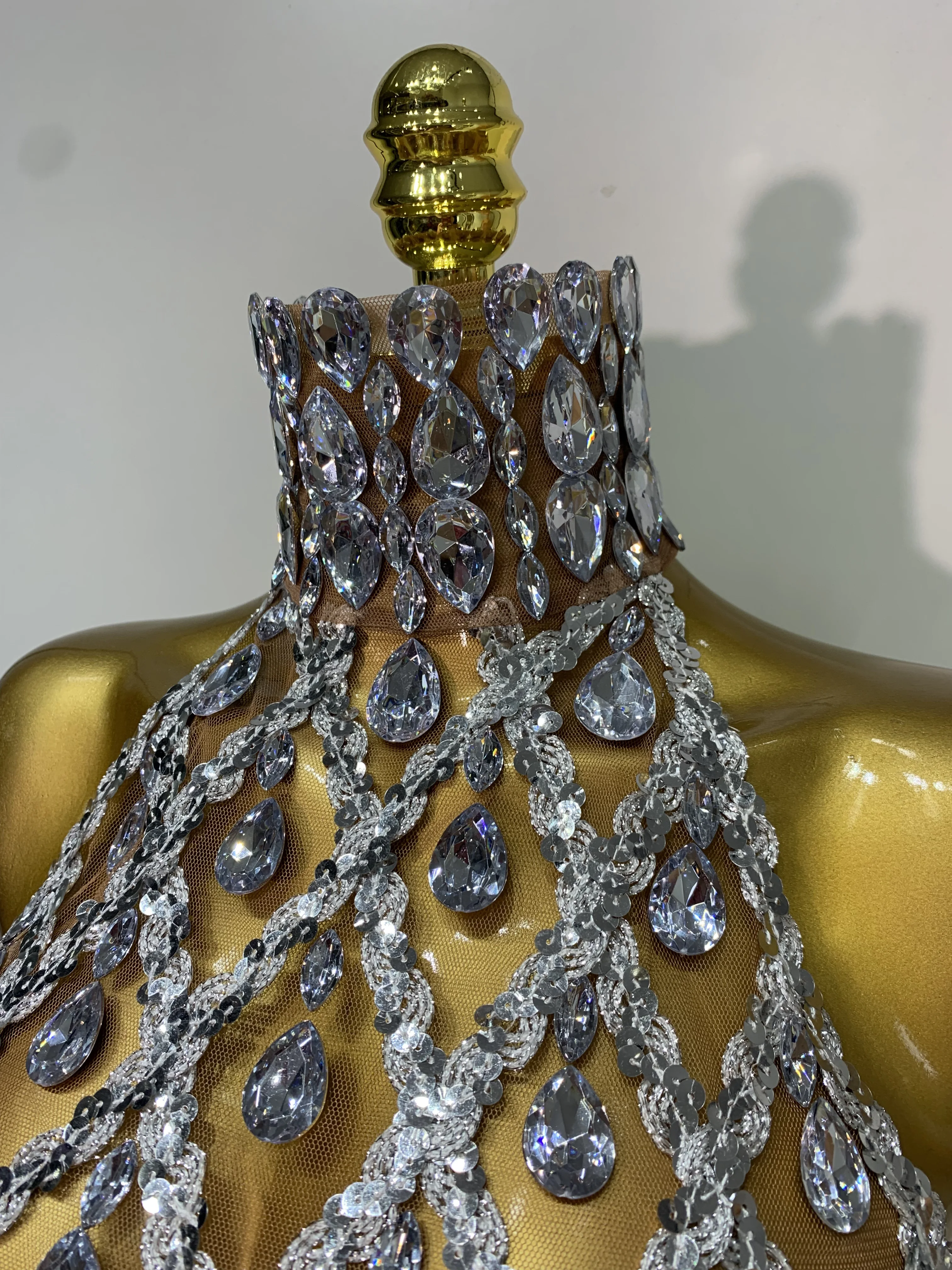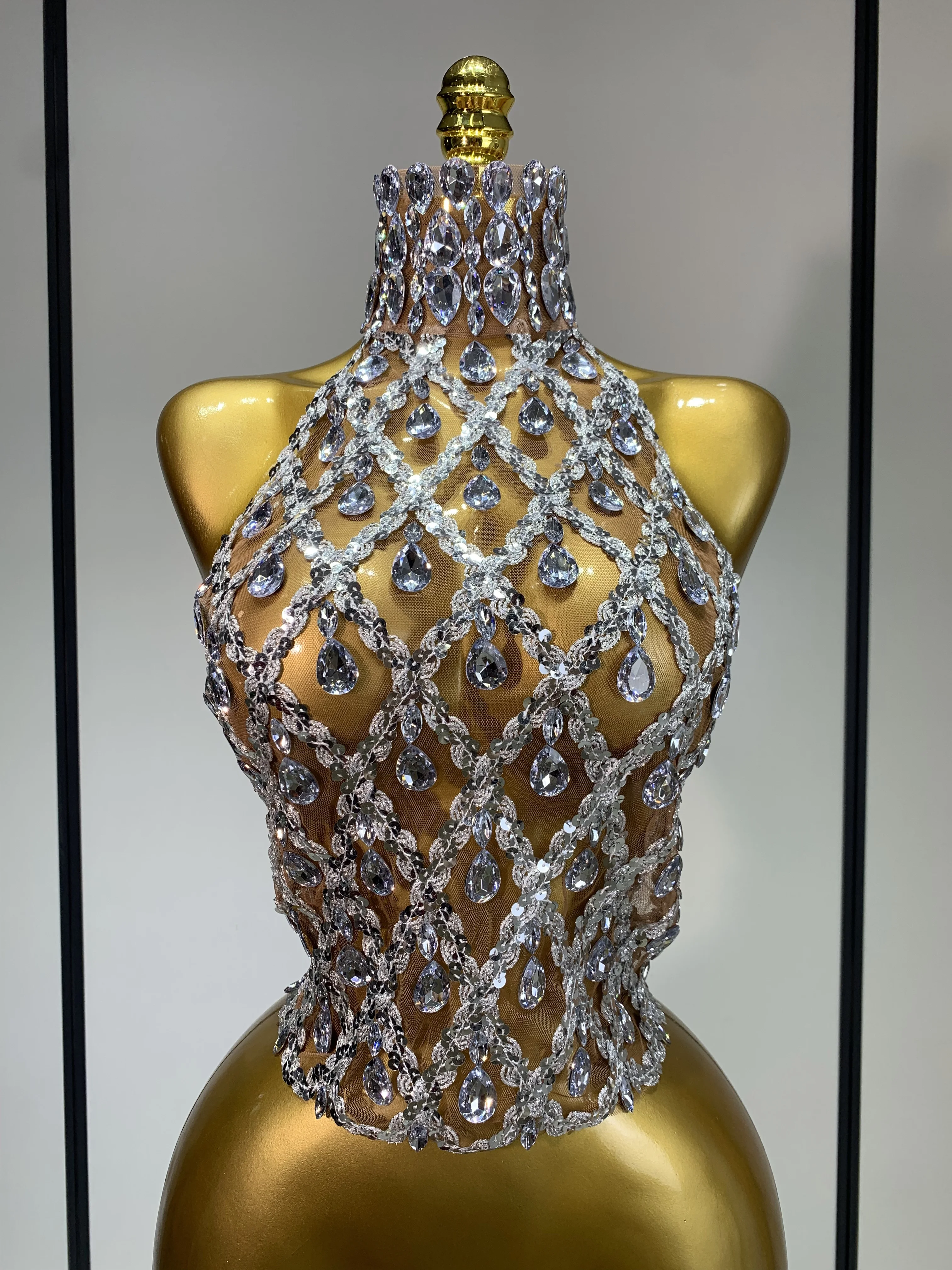 QueenLine Celebrity Sparkly Slver Rhinestone Sequins Mesh See Through Sexy Stage Evening Backless Spicy Top