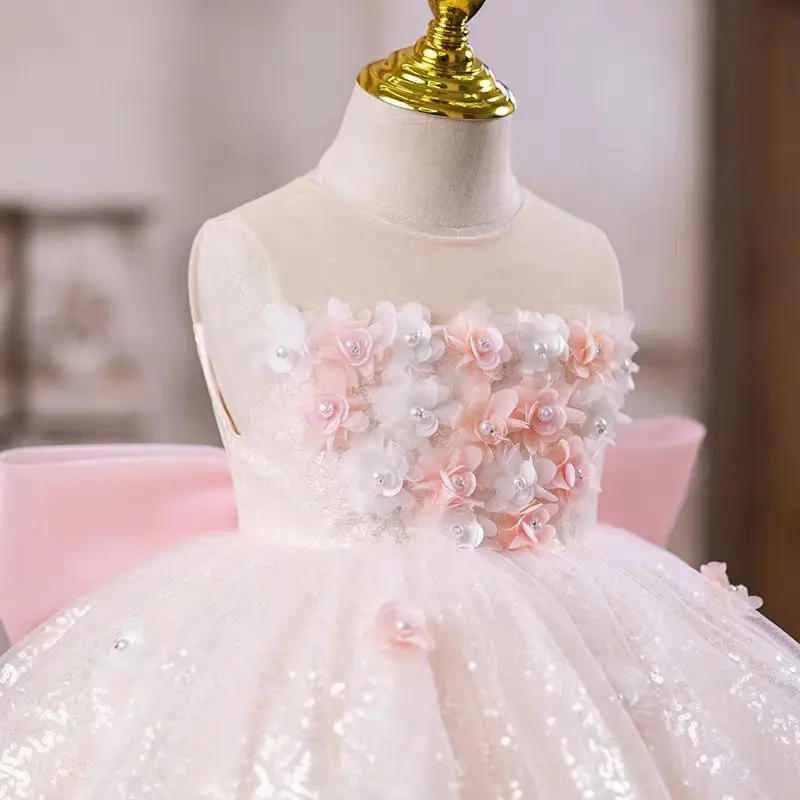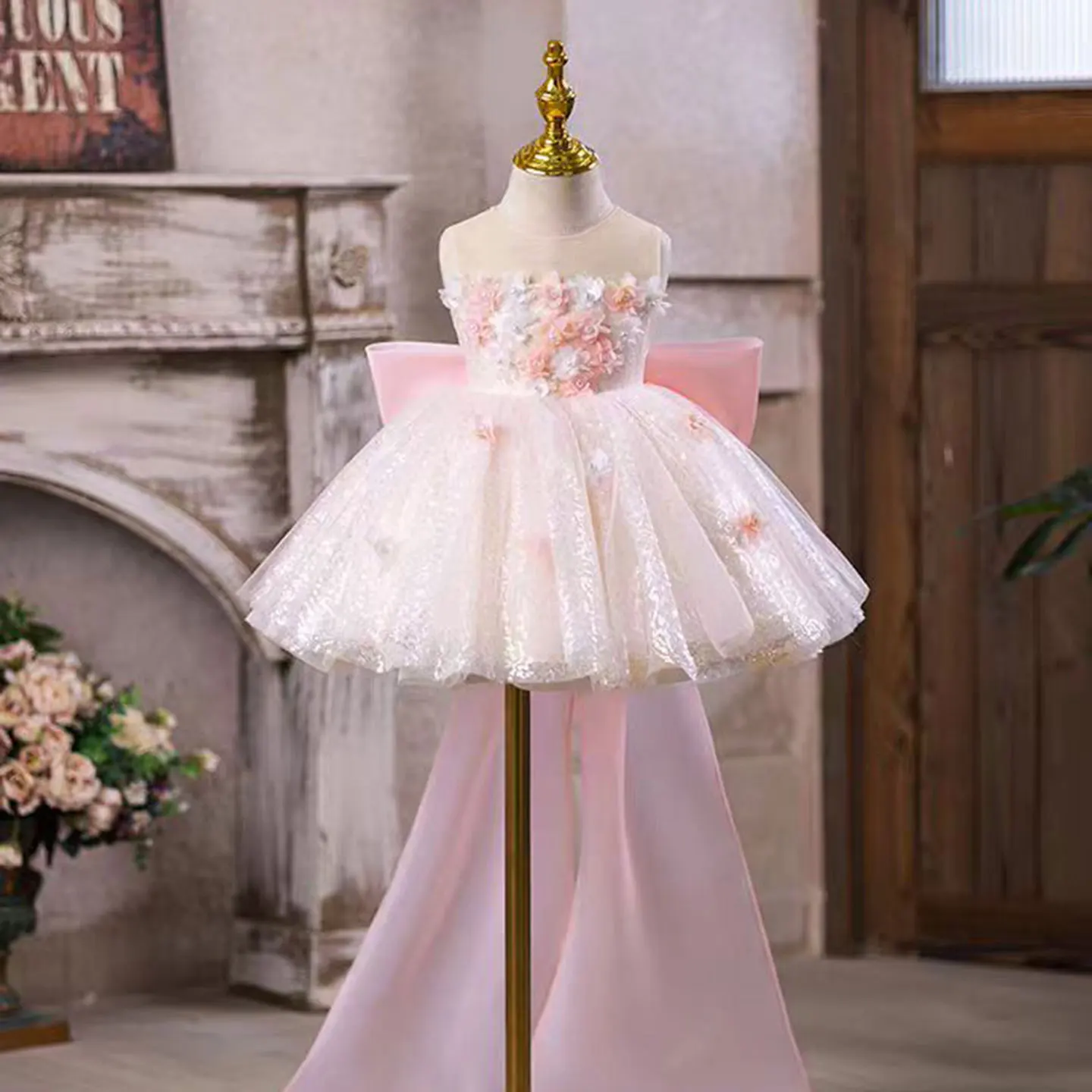 QueenLine Eleagnt Pink Flower Girls Knee Length Princess Baby Wedding 1st Birthday Pageant Gown with Big Bow