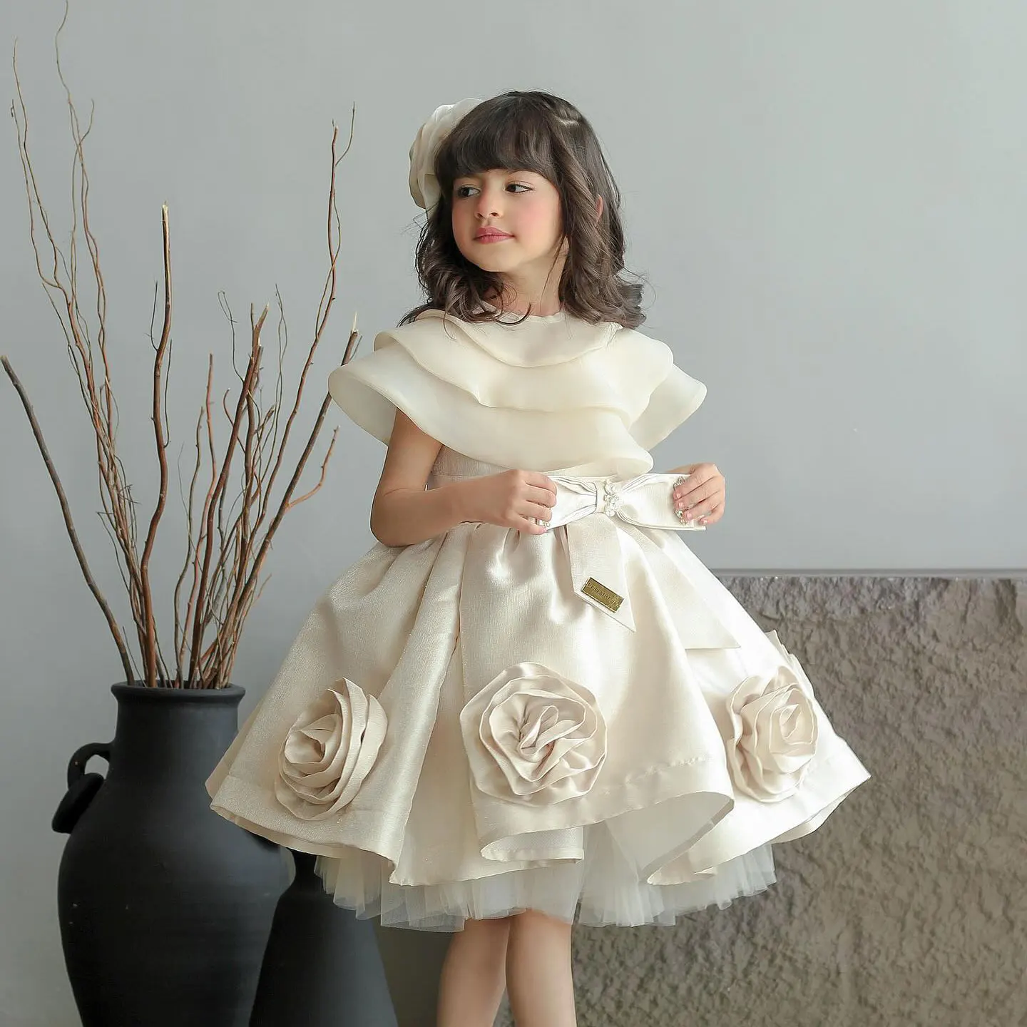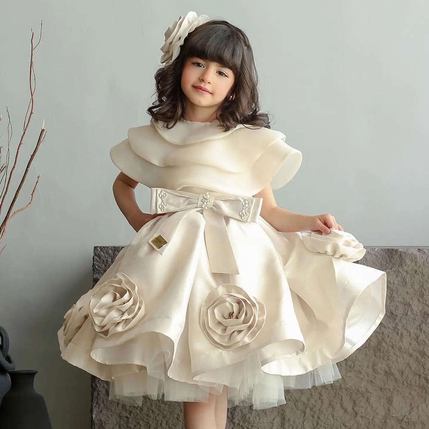 QueenLine Elegant Beige Handmade Flowers with Headgear Wedding Birthday Holiday Party Girl Dress