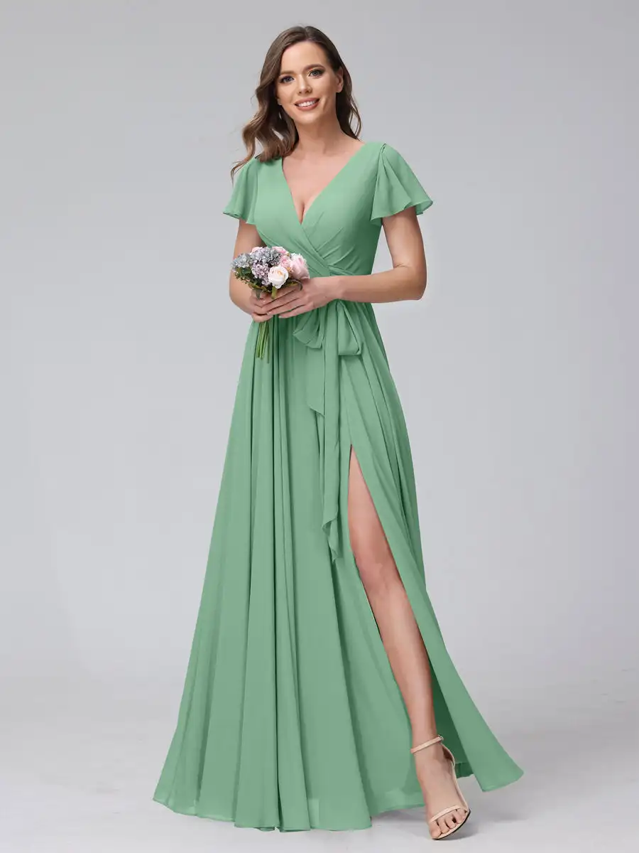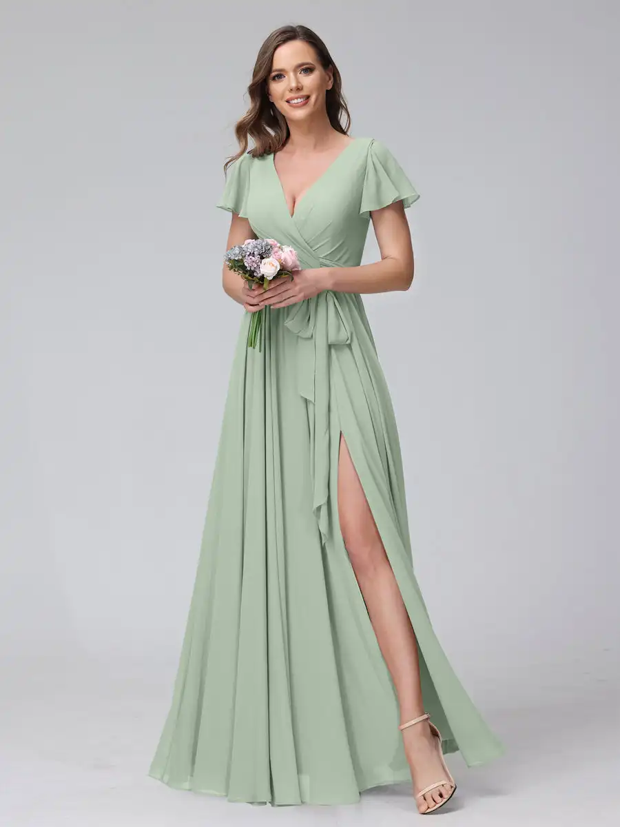 QueenLine Elegant Chiffon A-line Short Sleeve Bridesmaid With Belt Simple Pleat Side Slit Lace Up Long Evening Dress