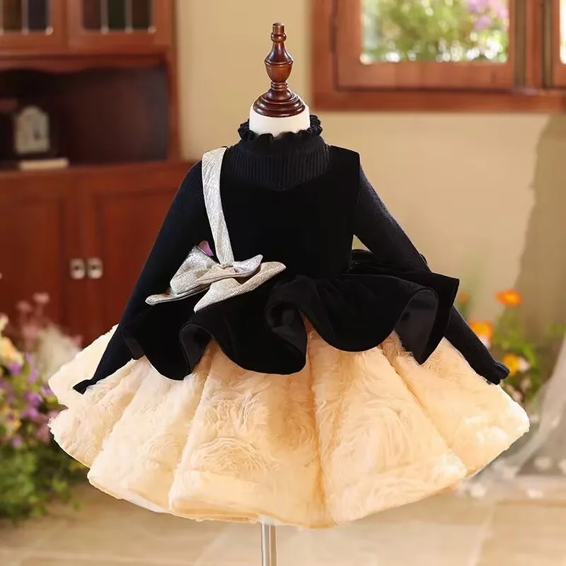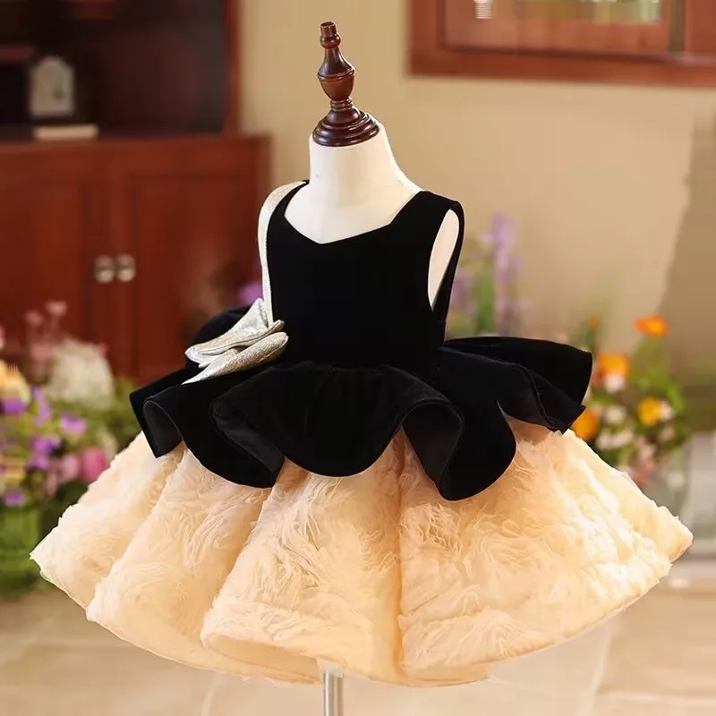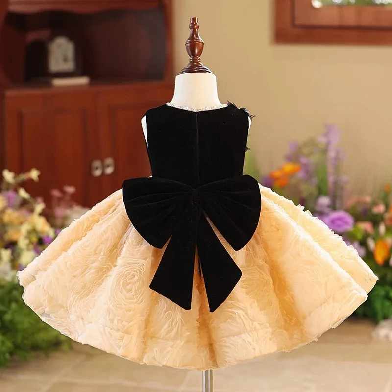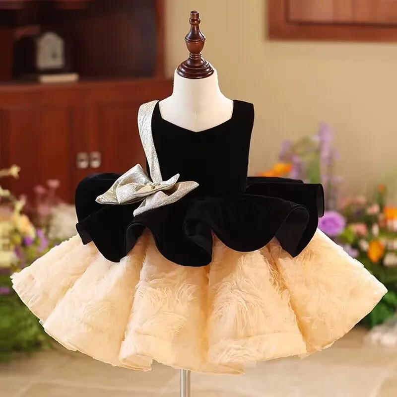 QueenLine Dreamy Vow Elegant Girl Black Velvet Top with Beige Fluffy Skirt Gold Bowed Dress