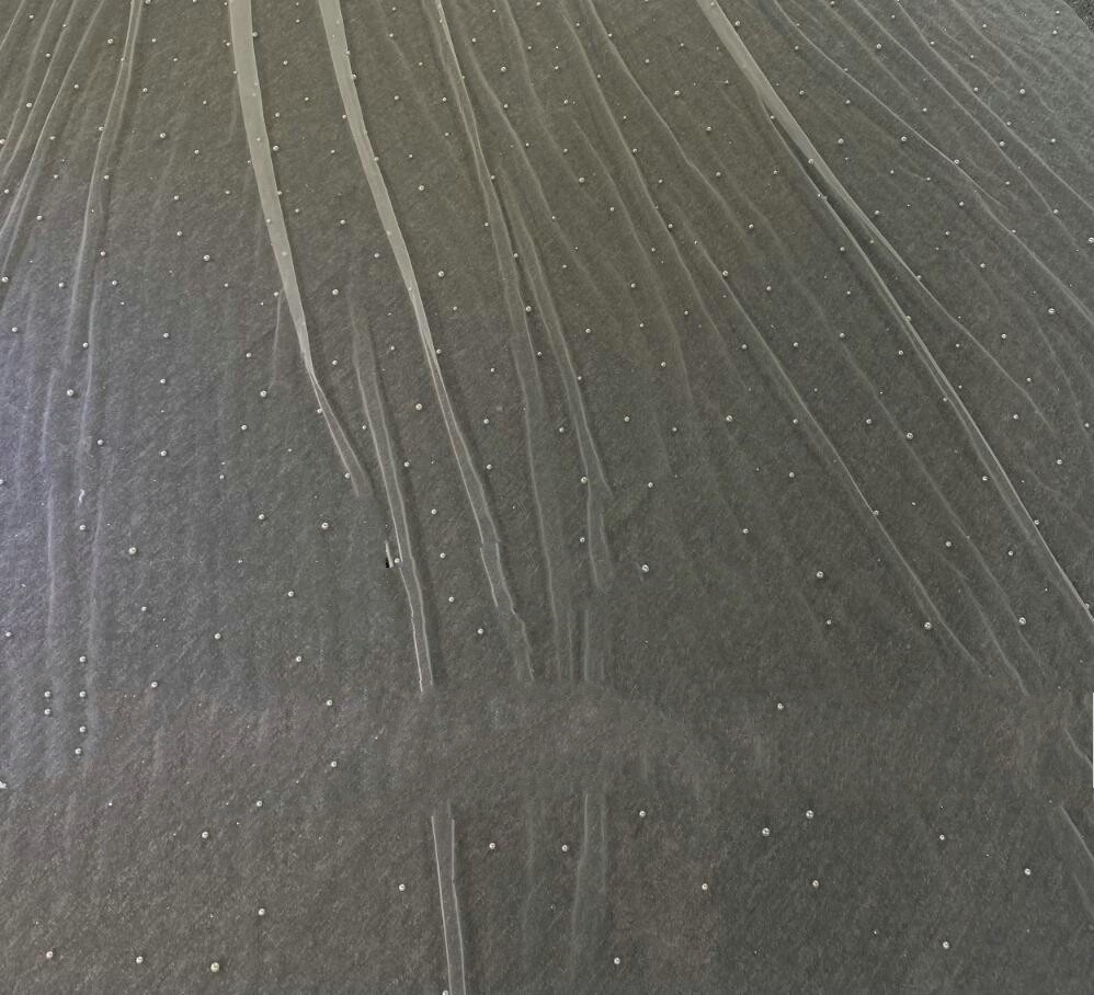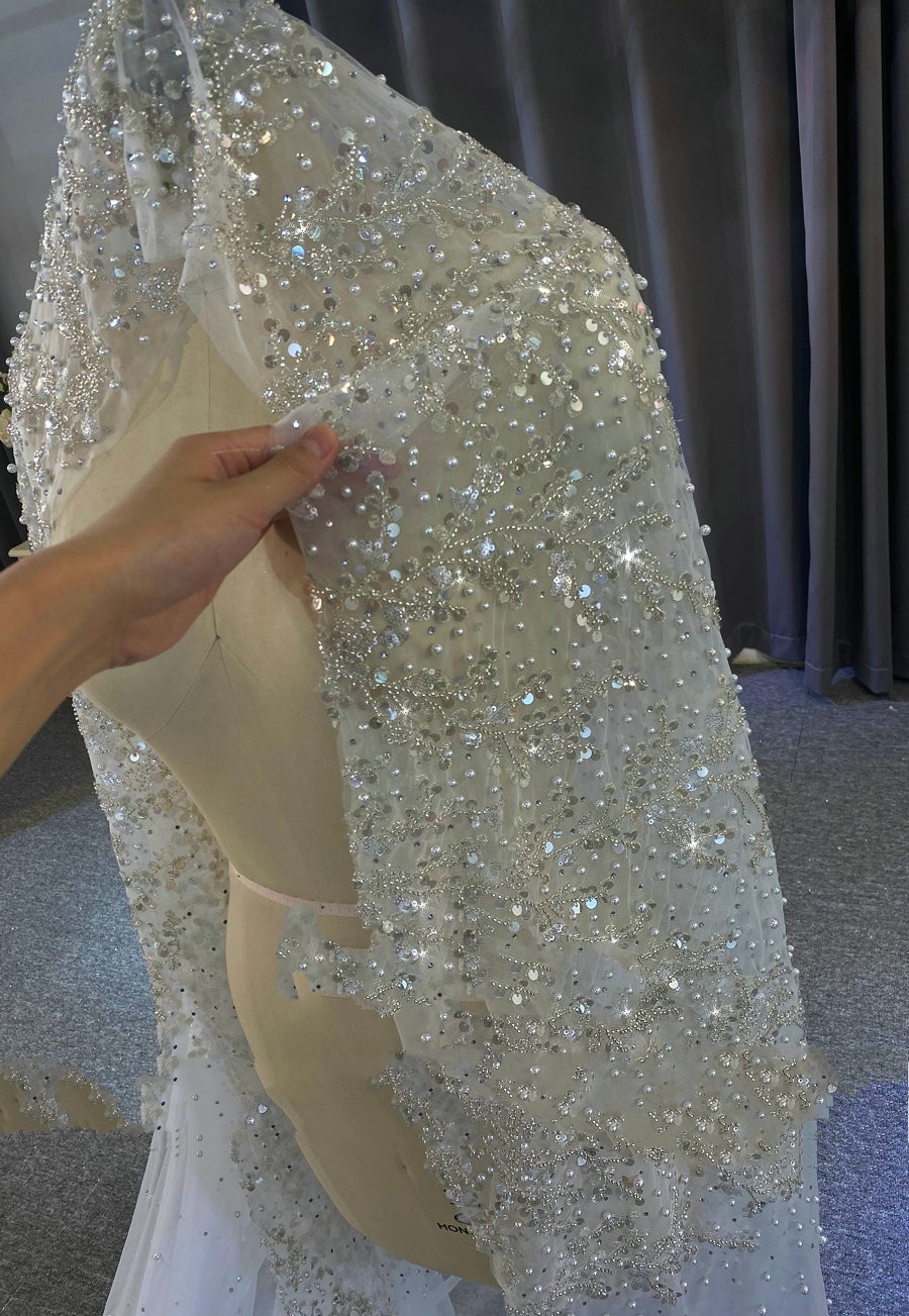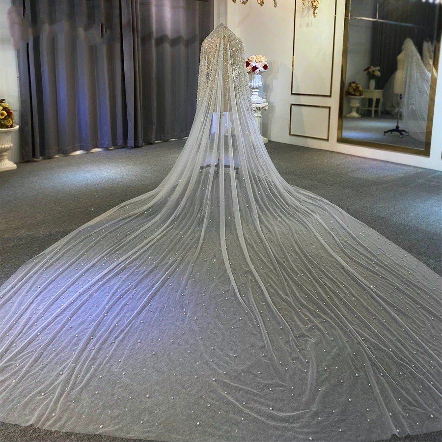 the veil top is around 150cm long full lace part. then have beading and many full pearls, so veils a little heavy, because of full beading, this is normal.