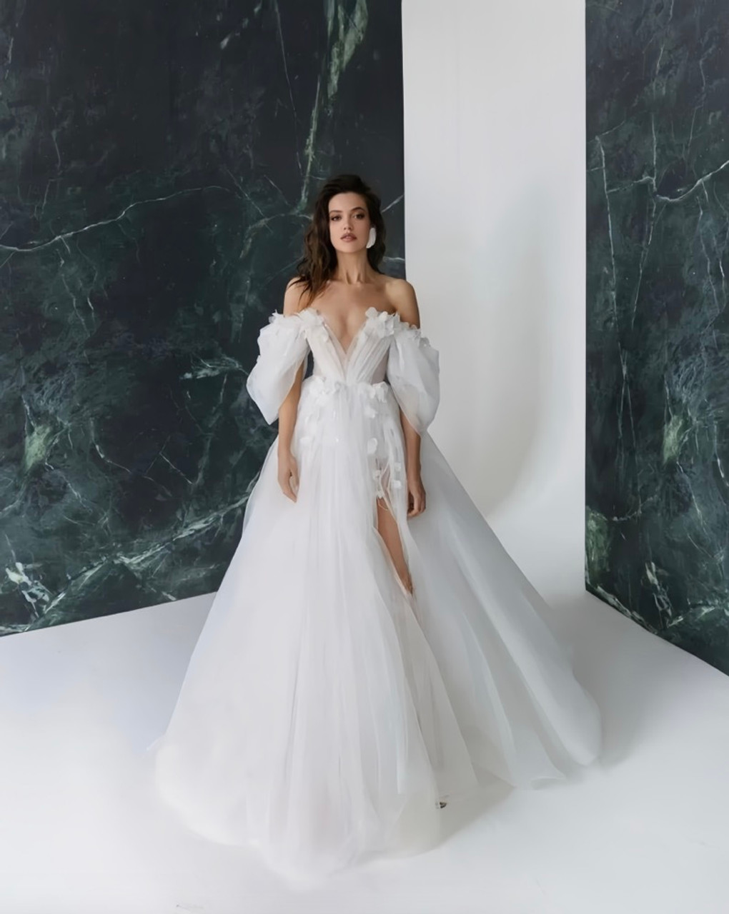 QueenLine Graceful 3D Flower Sleeves Sweetheart Open Back Appliqued Wedding Gowns with Detachable