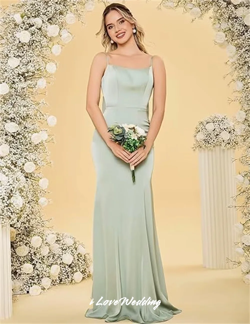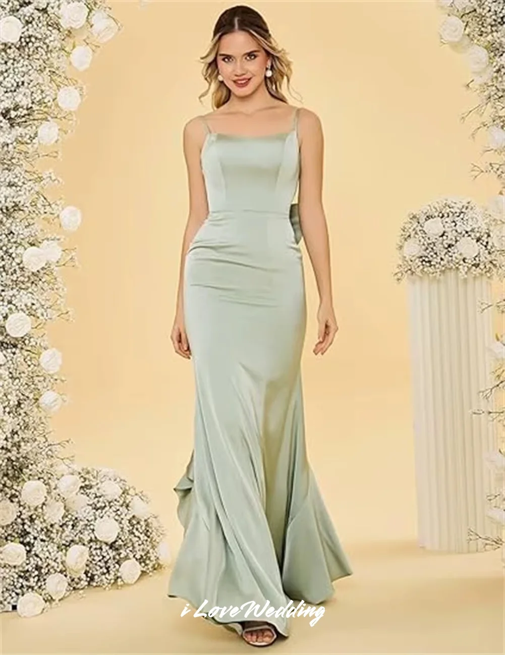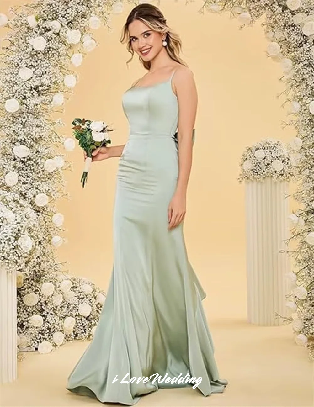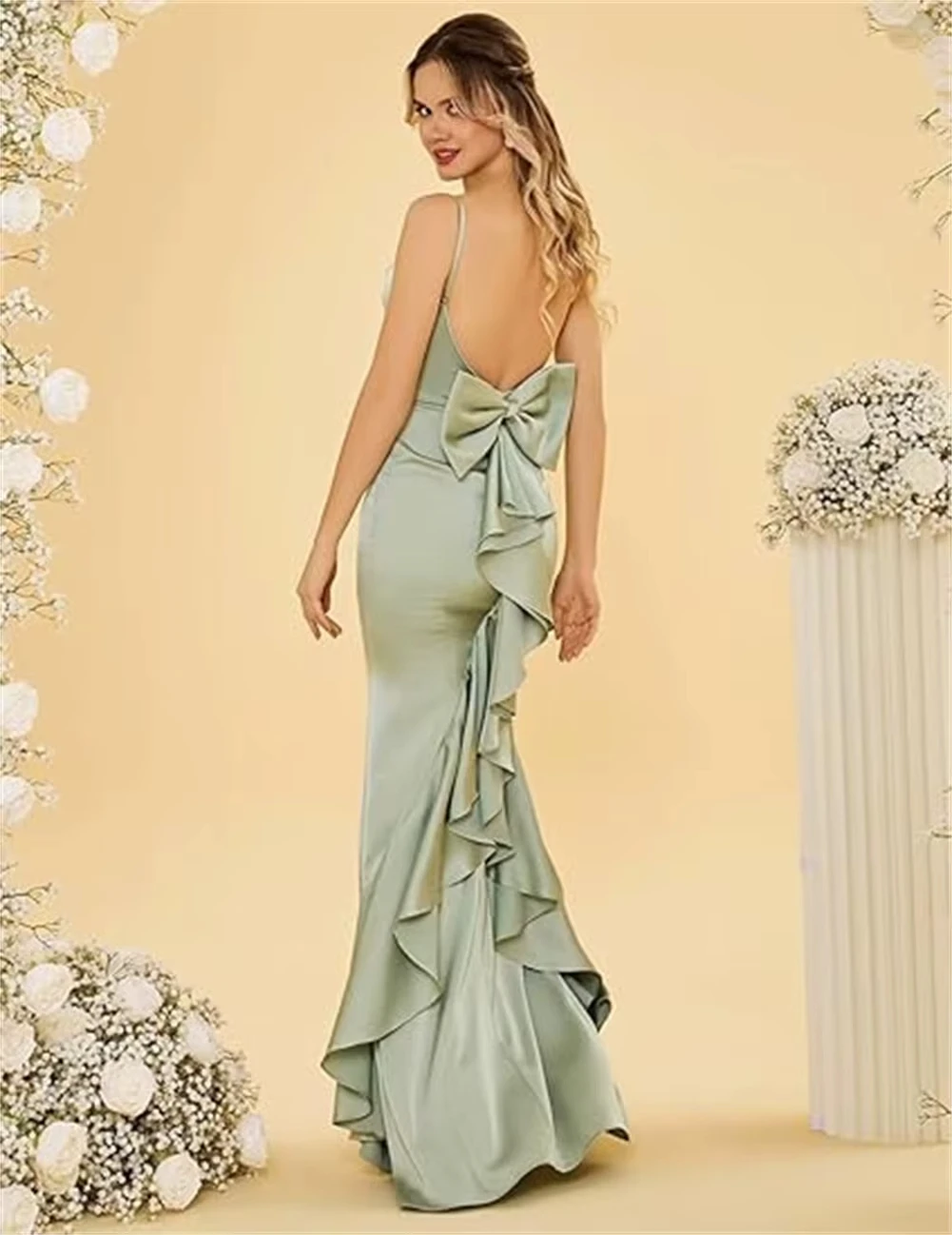 QueenLine Green Spaghetti-Strap Bridesmaid Sleeveless Backless Bow Ruffles Mermaid Floor-Length Wedding Guest Dress Customized