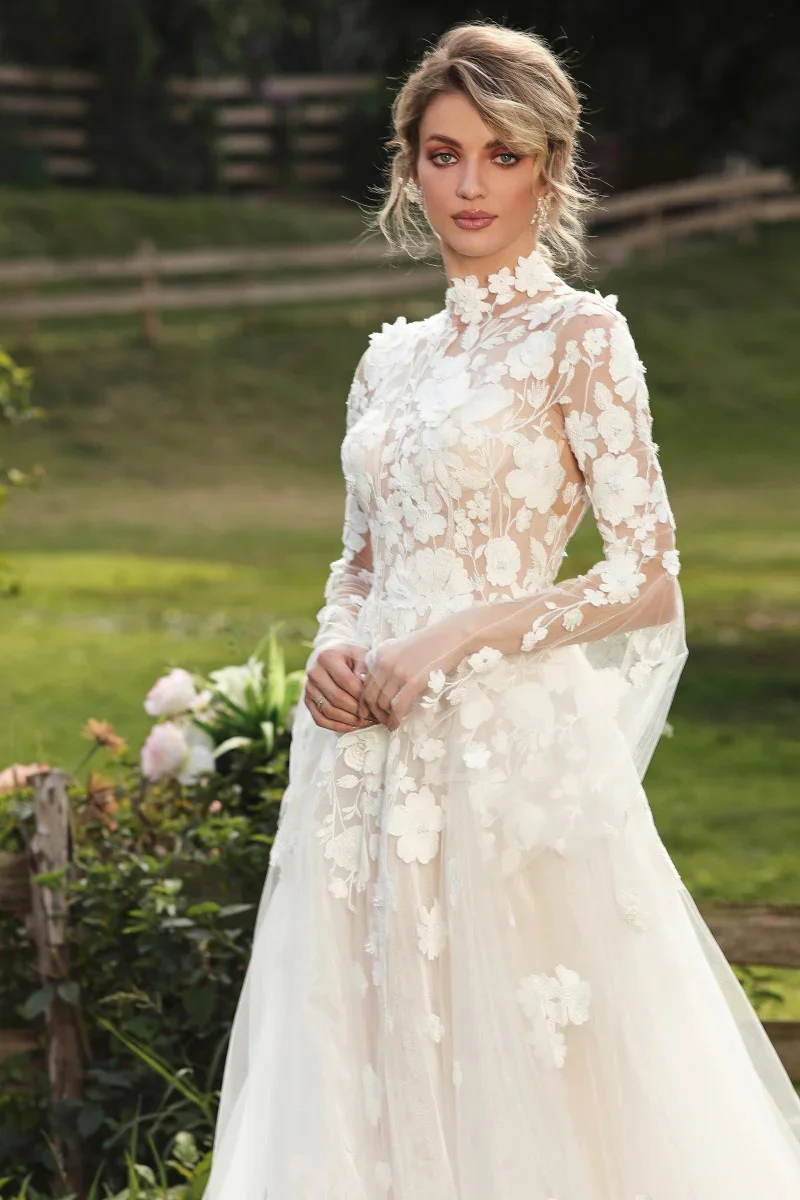 QueenLine High Neck Vintage Full Sleeves 3d Lace Applique Tulle A Line Cut Back Sweep Train Custom Made Wedding Dress