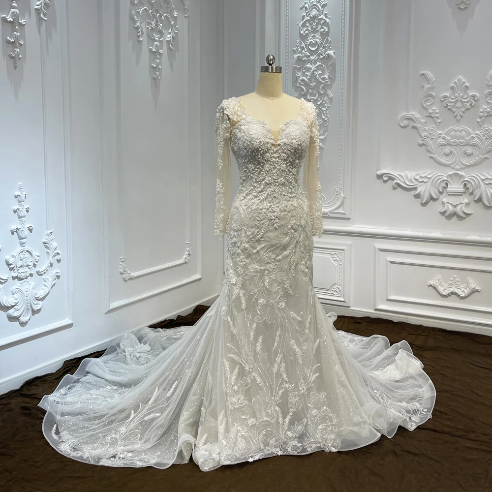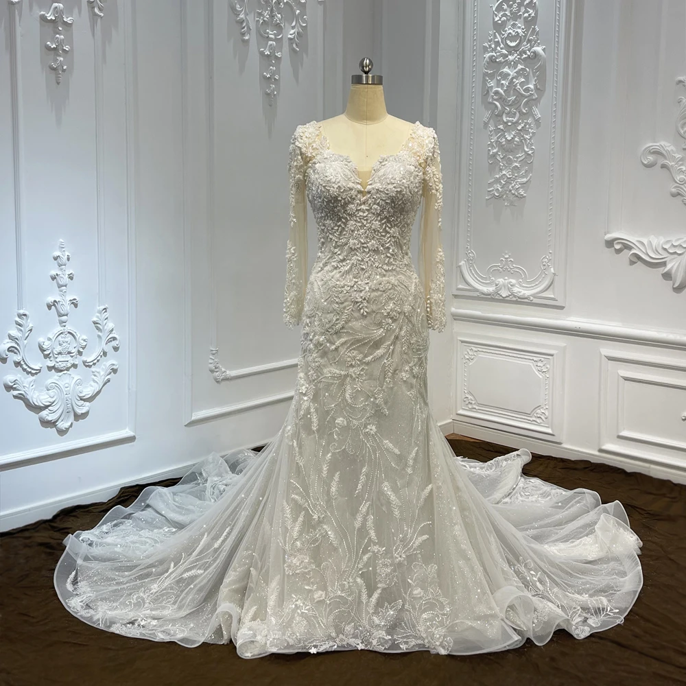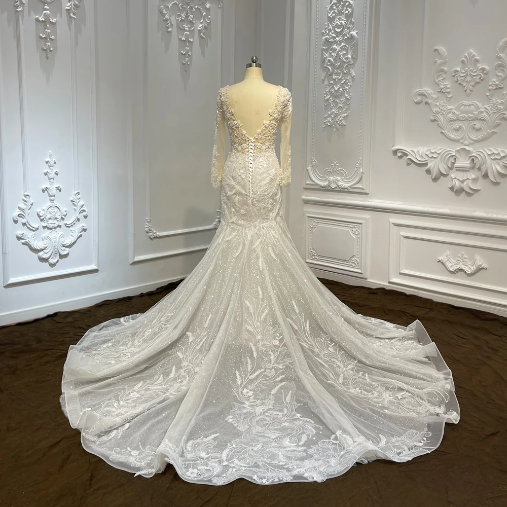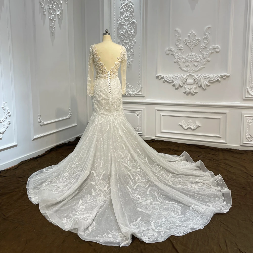 Jancember International Perfect Wedding Dresses A-line V-neck Full Sleeves Organza Court Train Embroidery Backless Suknia ślubna