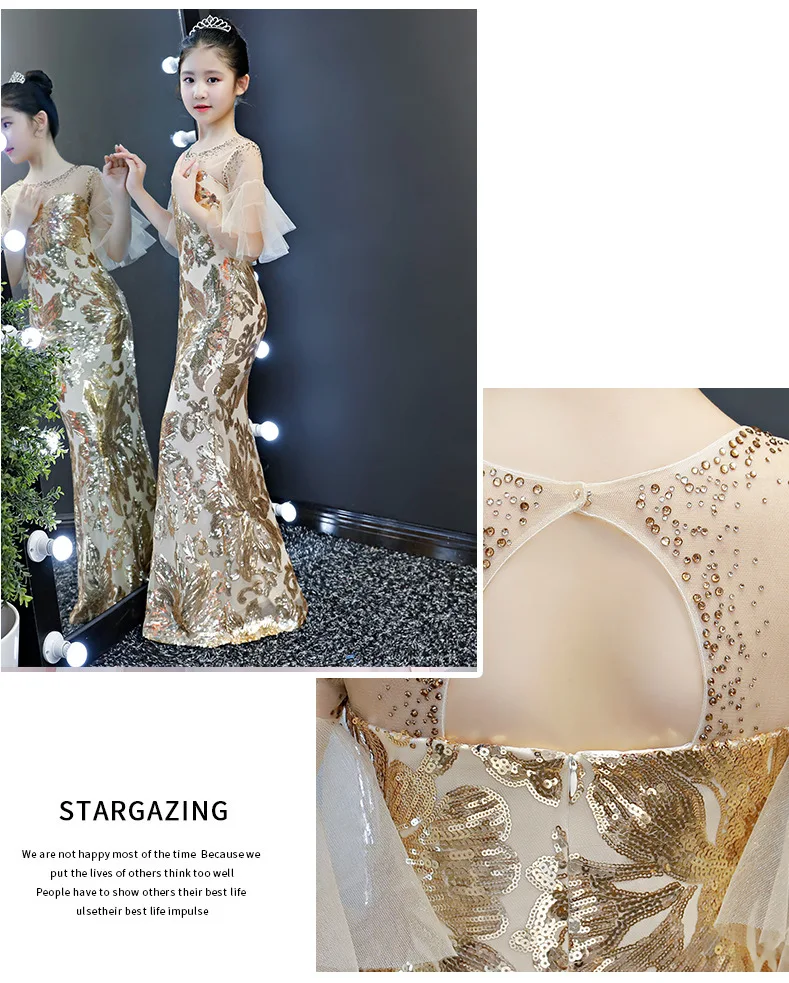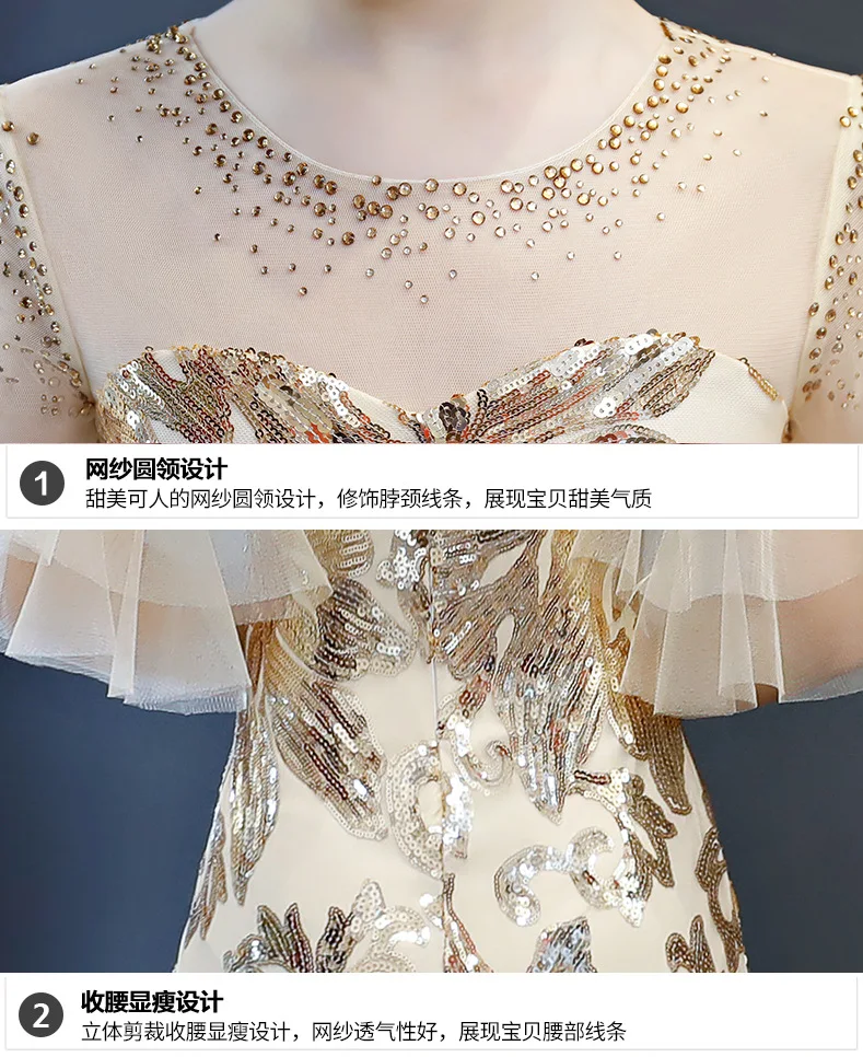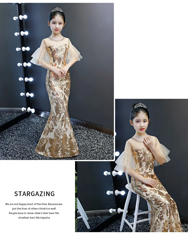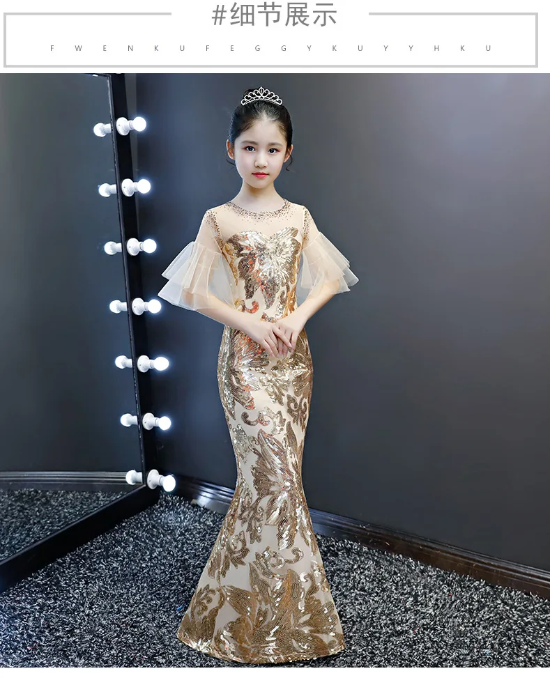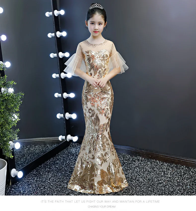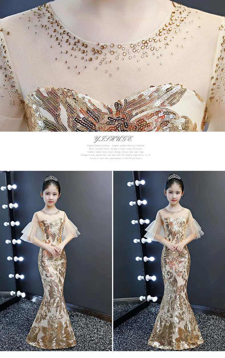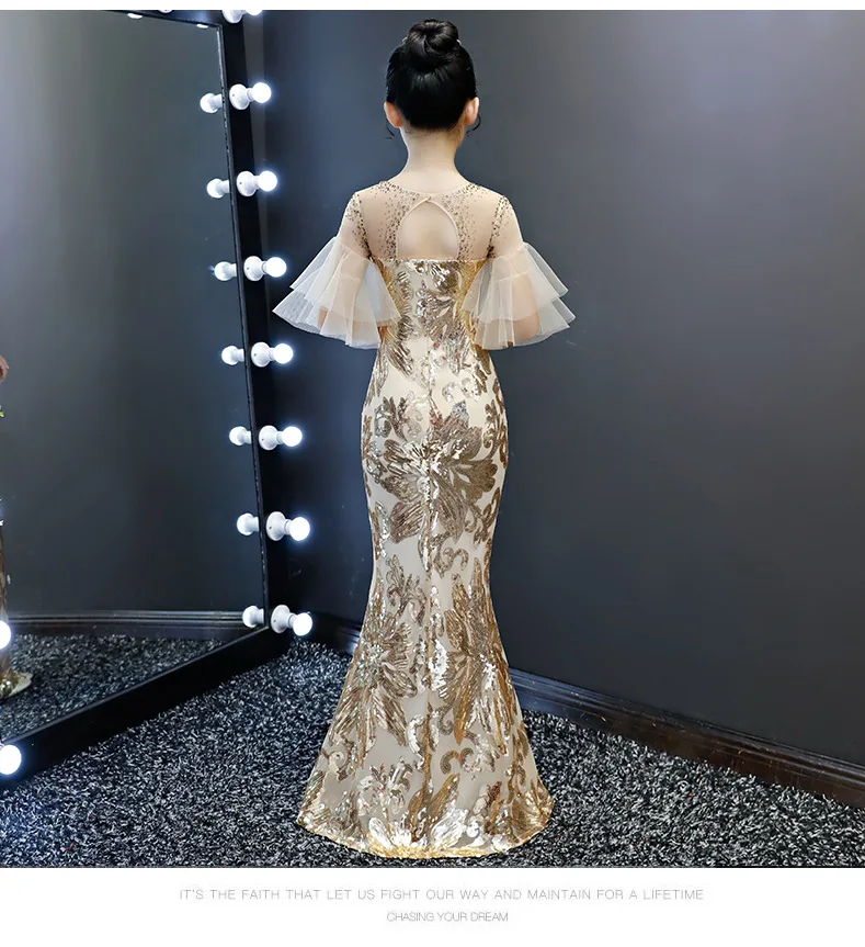 QueenLine Kid luxury sequined evening dress children girl gold bodycon trumpet elegant mermaid wedding party Cocktail chinese style dress