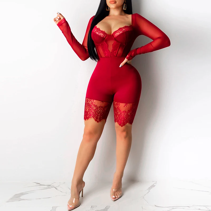 - Party Bodysuit: See Through Short Lace Sexy Bodycon Jumpsuit Women Playsuit