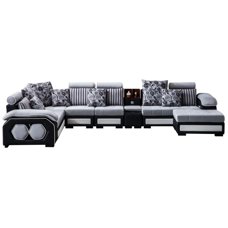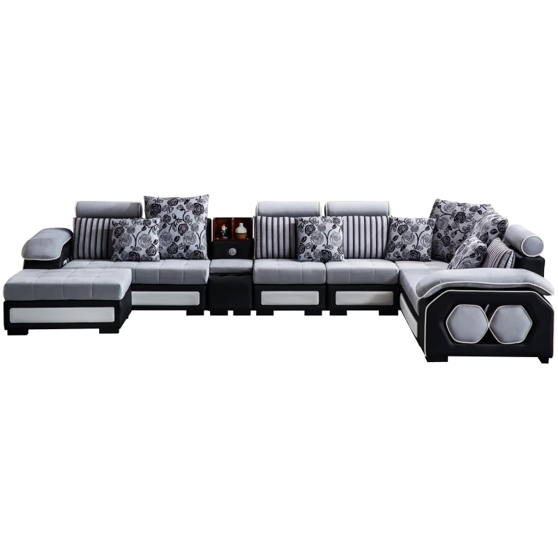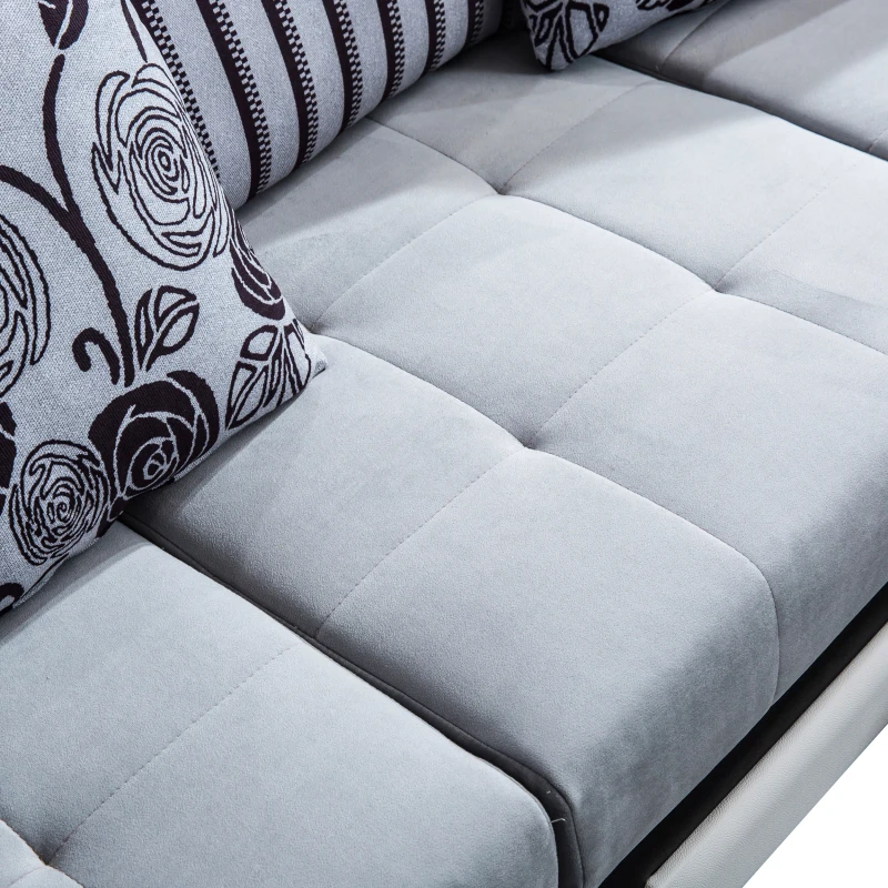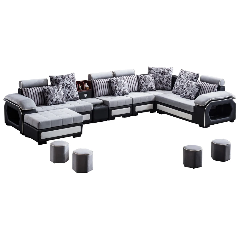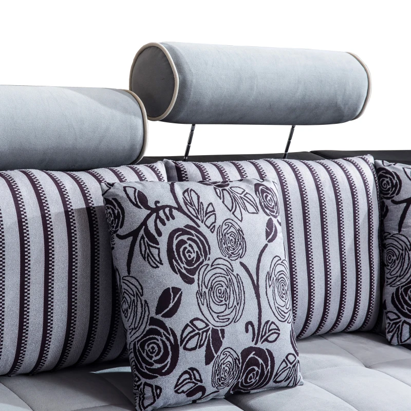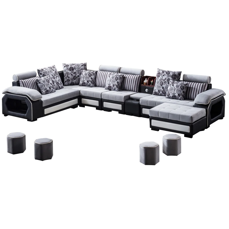 The cylindrical headrests are adjustable, ensuring you find the perfect viewing angle during movie nights. Integrated storage shelves on either end of the sofa hold extra four-piece octagonal cushion stools. This sofa also comes with a matching ottoman for additional storage and eleven toss pillows in two different styles and three sizes, so you don’t have to splash out on extra accessories.