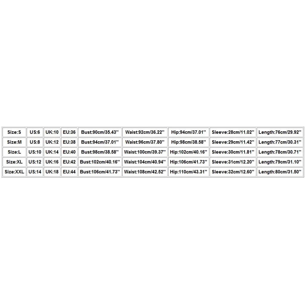| Size | US | UK | EU | Bust | Waist | Hip | Sleeve | Length |