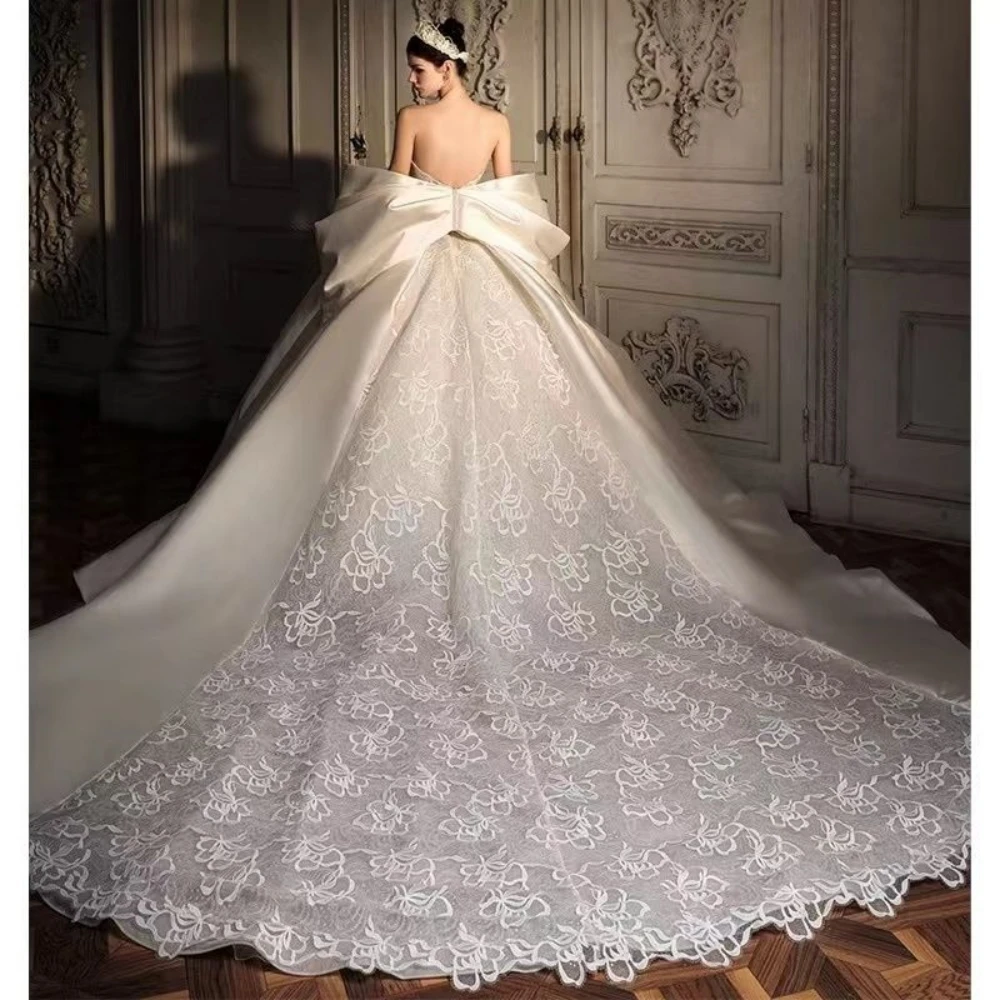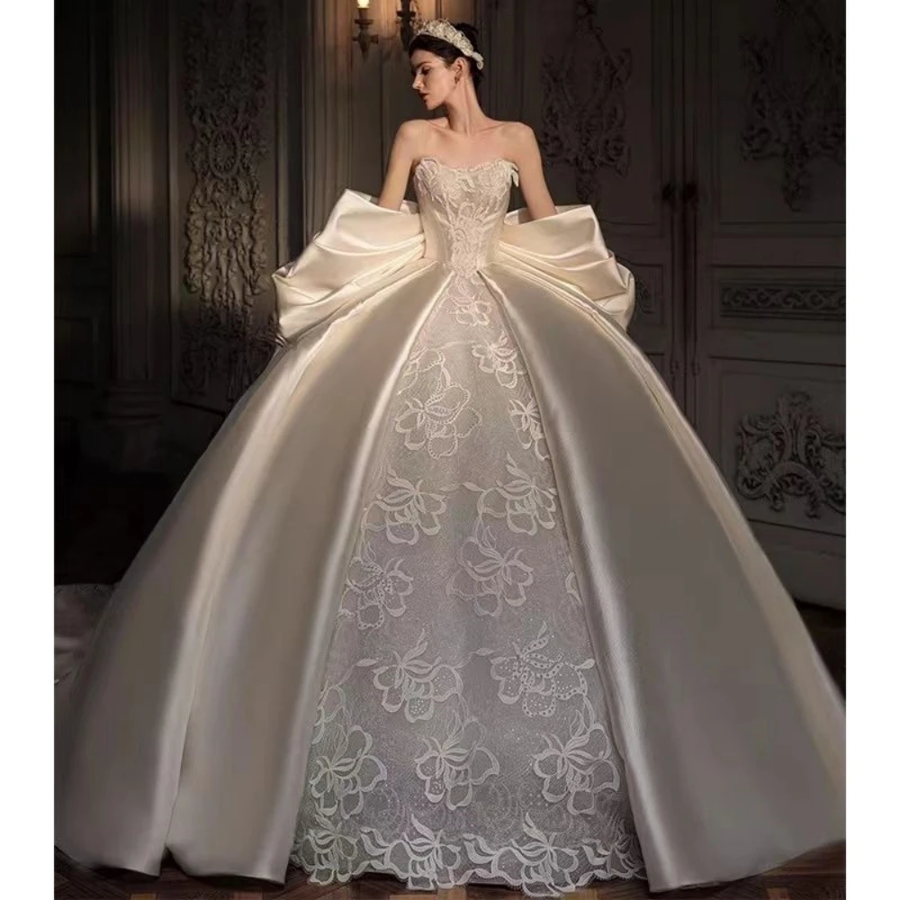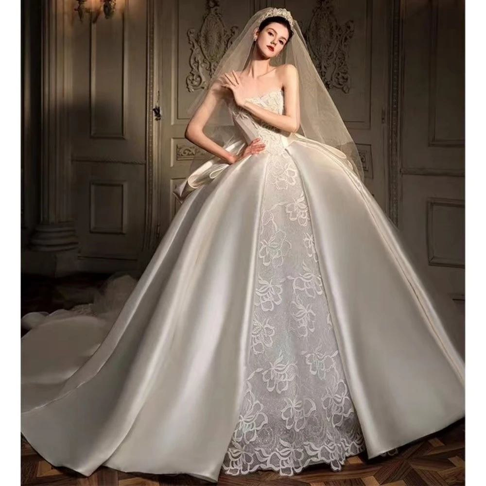 QueenLine Luxurious Tube Top French Mid-waist Tube Satin Classical Lace Printed Wedding Dress