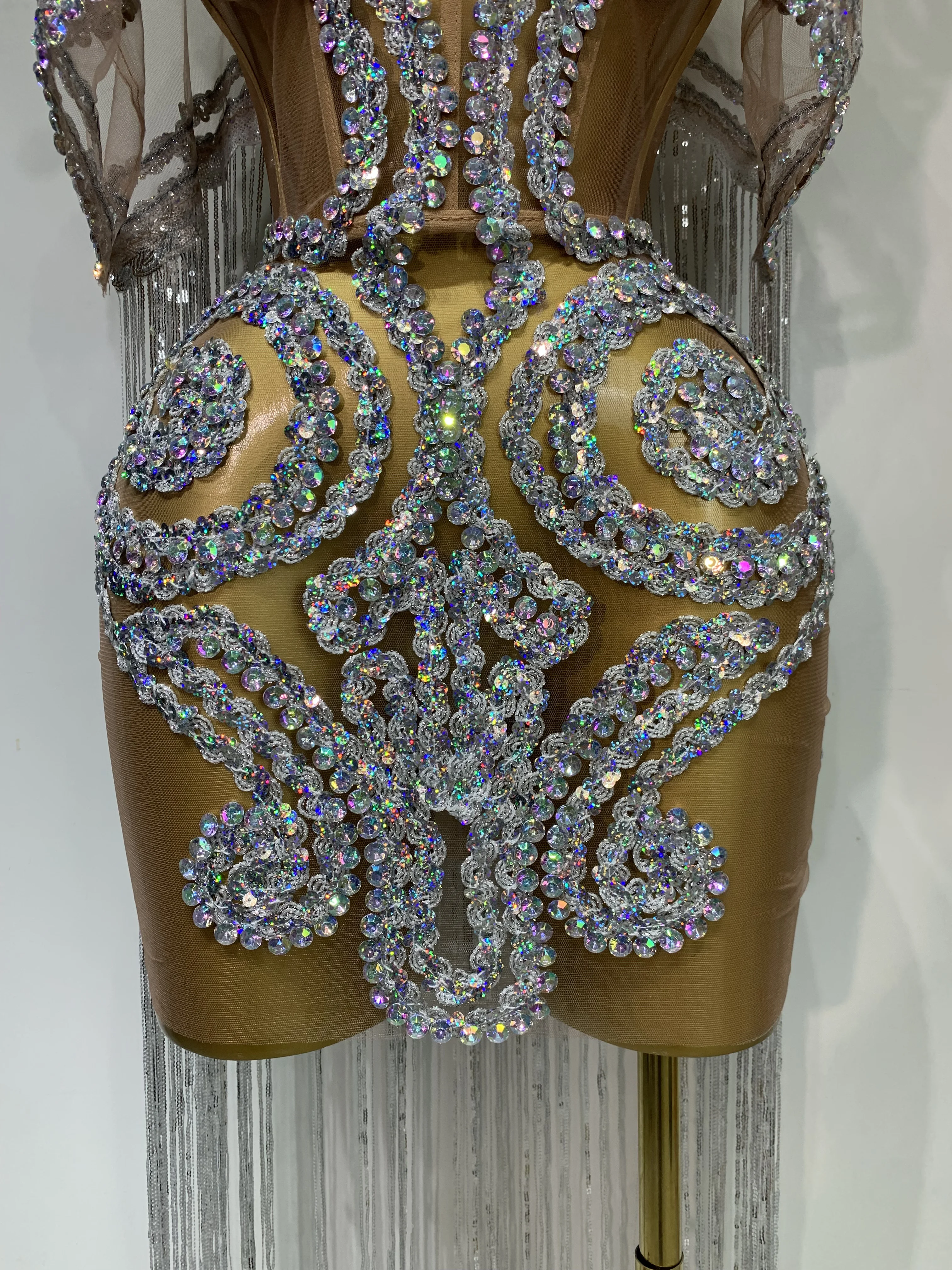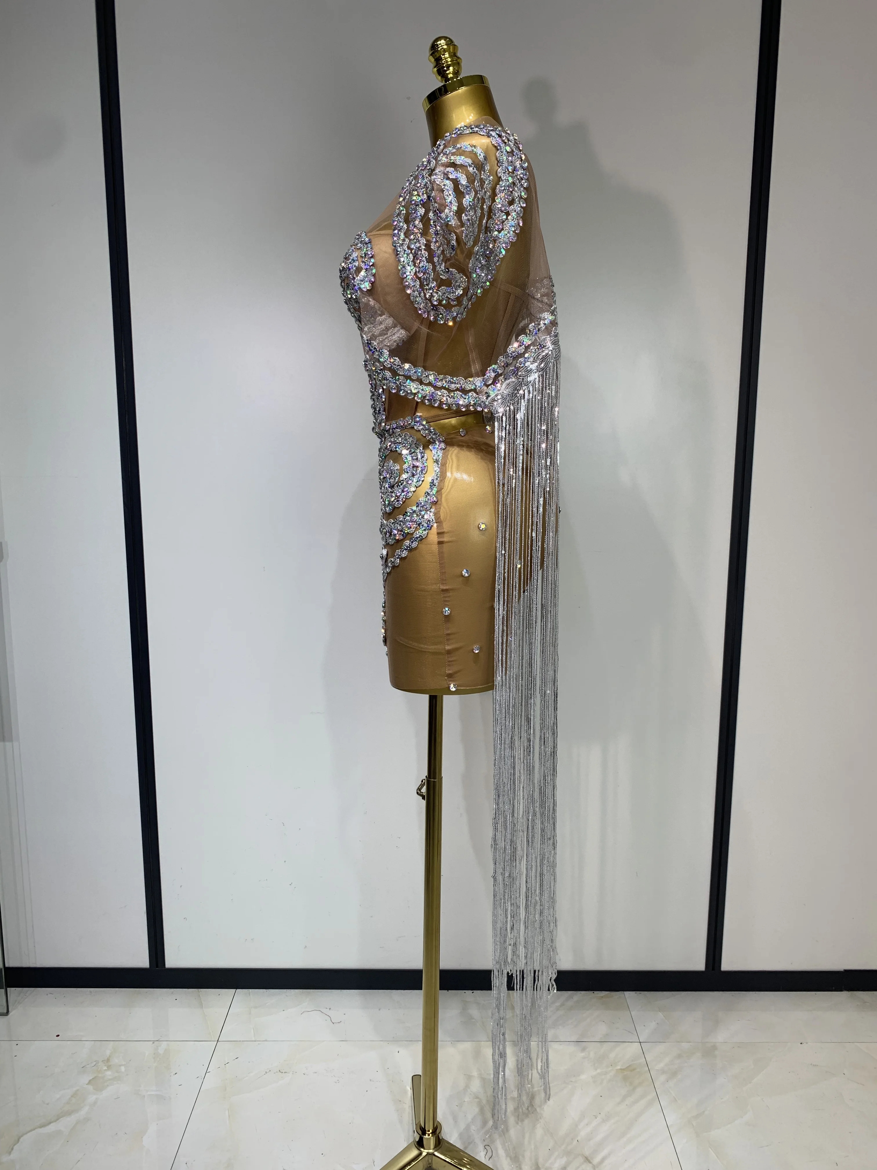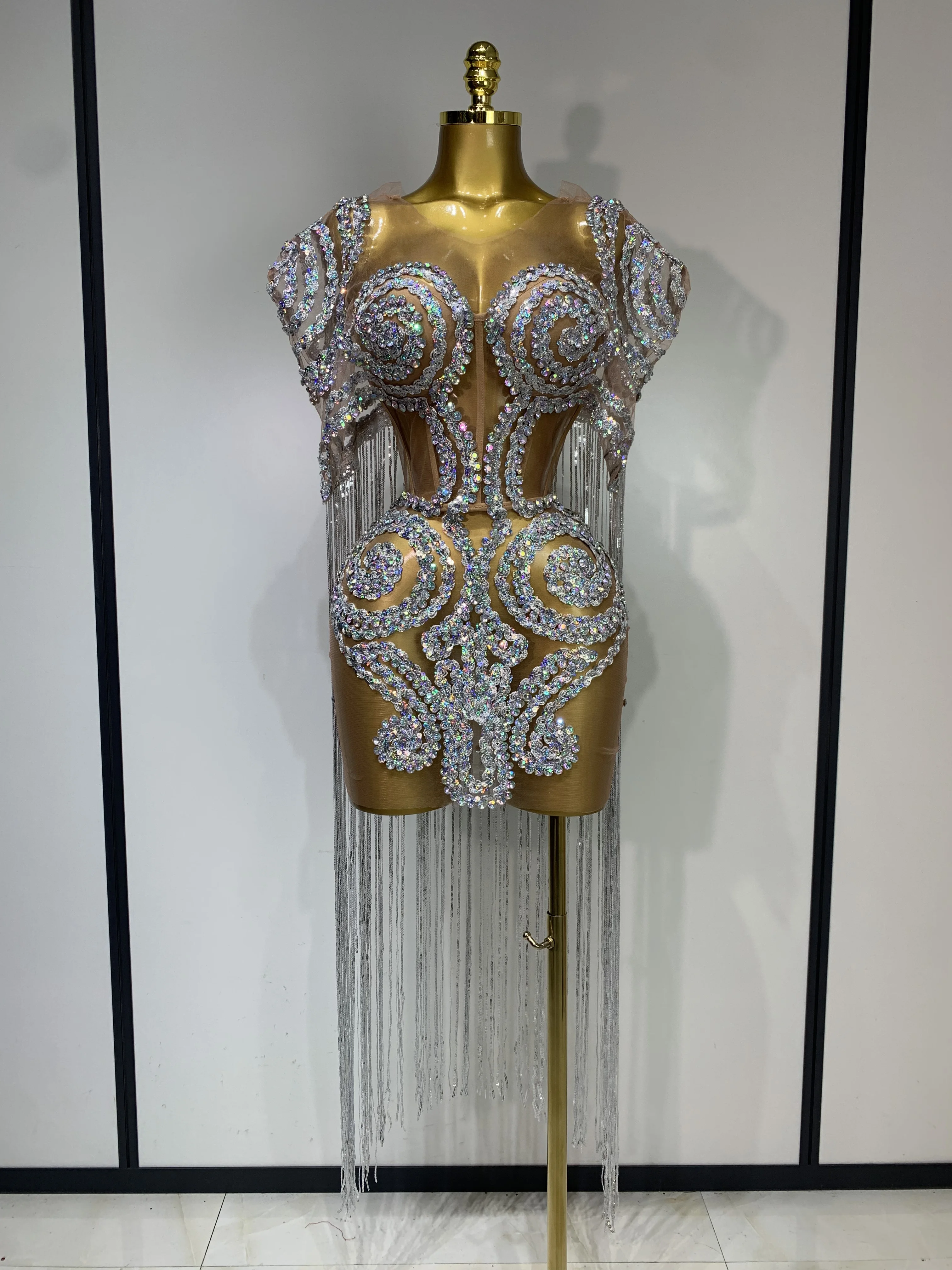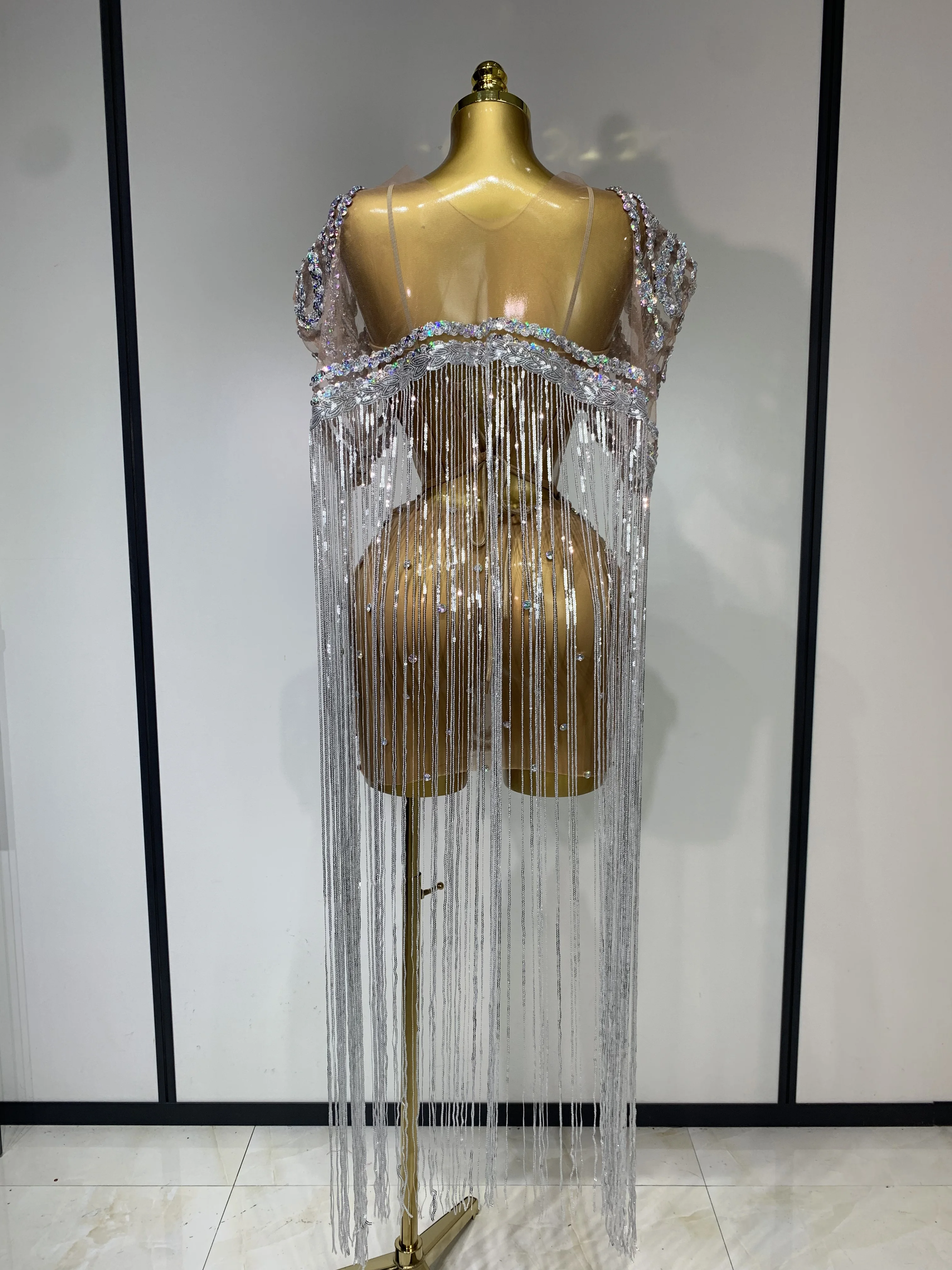 QueenLine Luxury Celebrity Sparkly Rhinestones Tassel Sexy Mesh Transparent Short Evening Birthday Dress