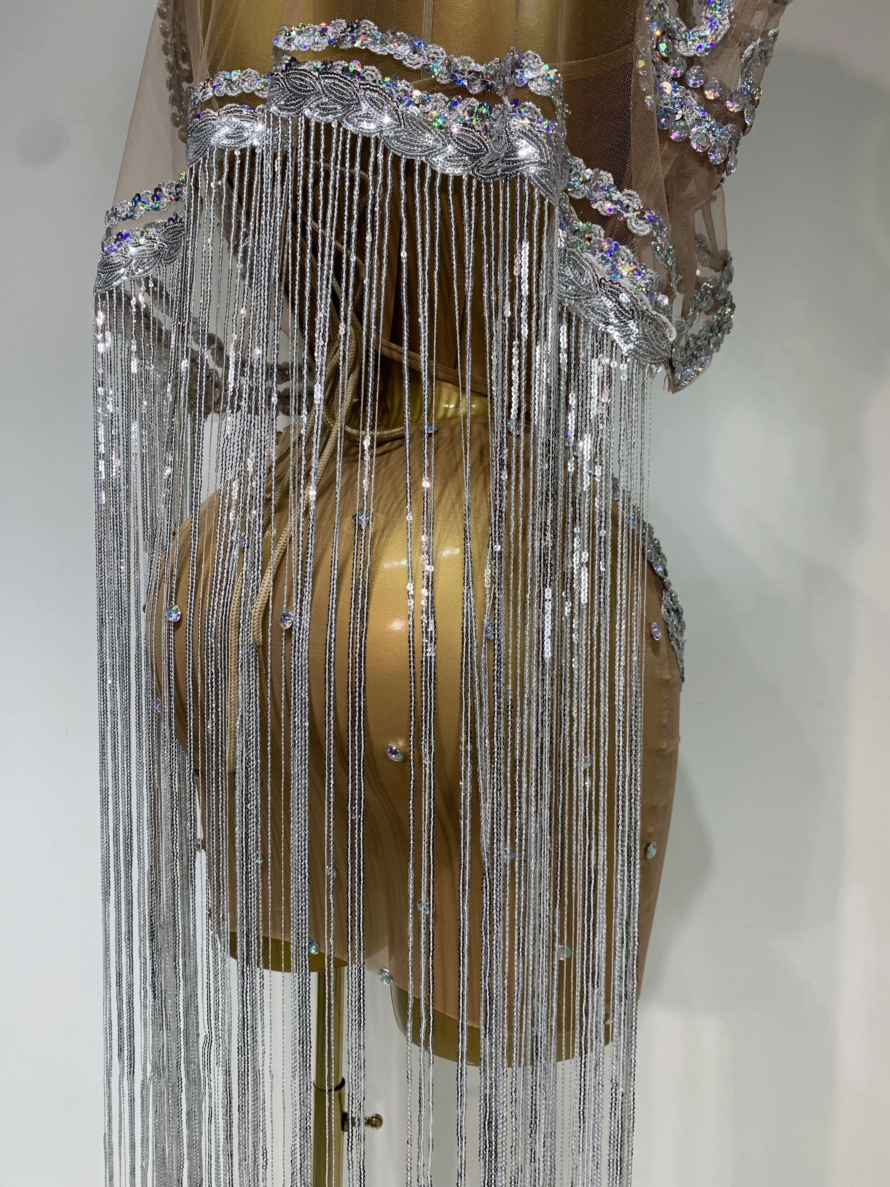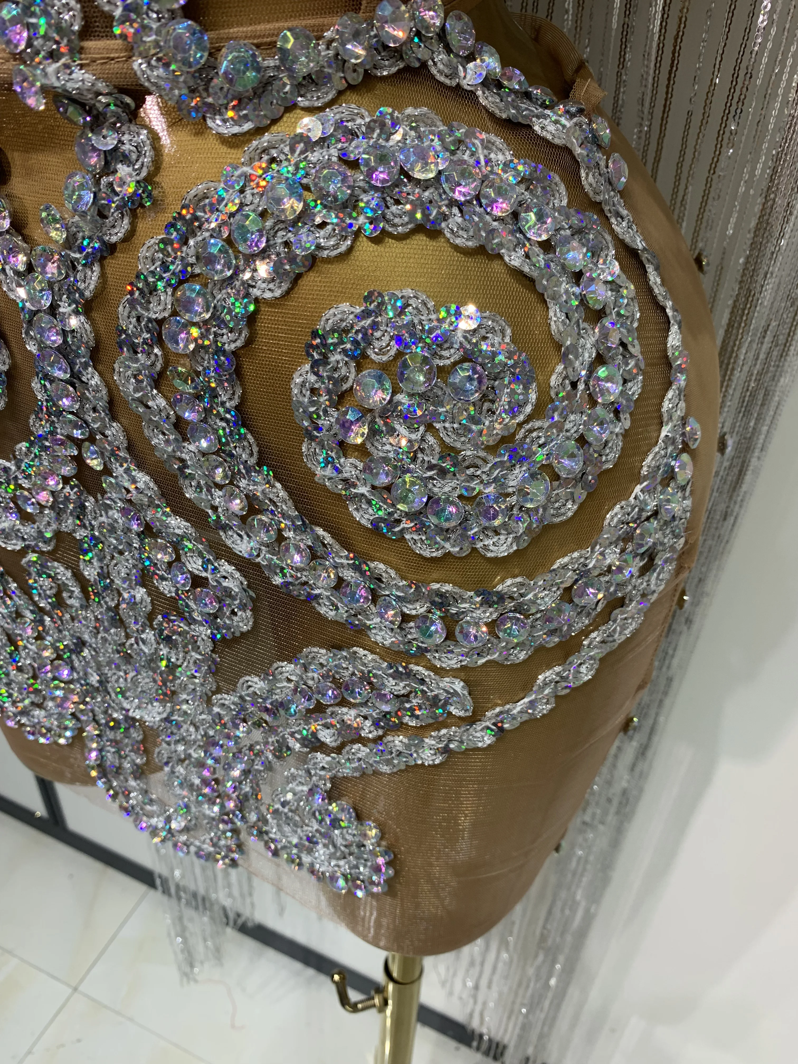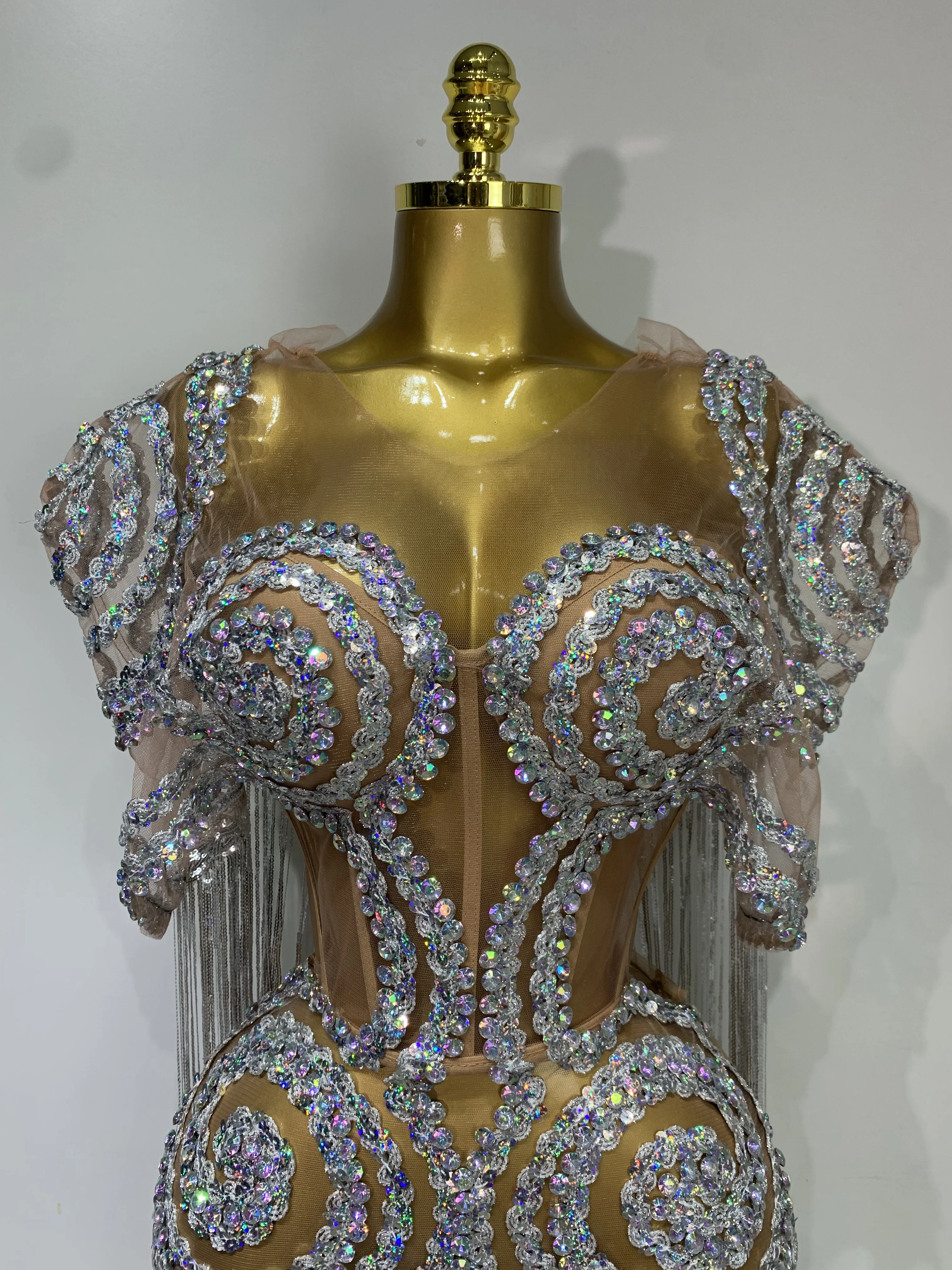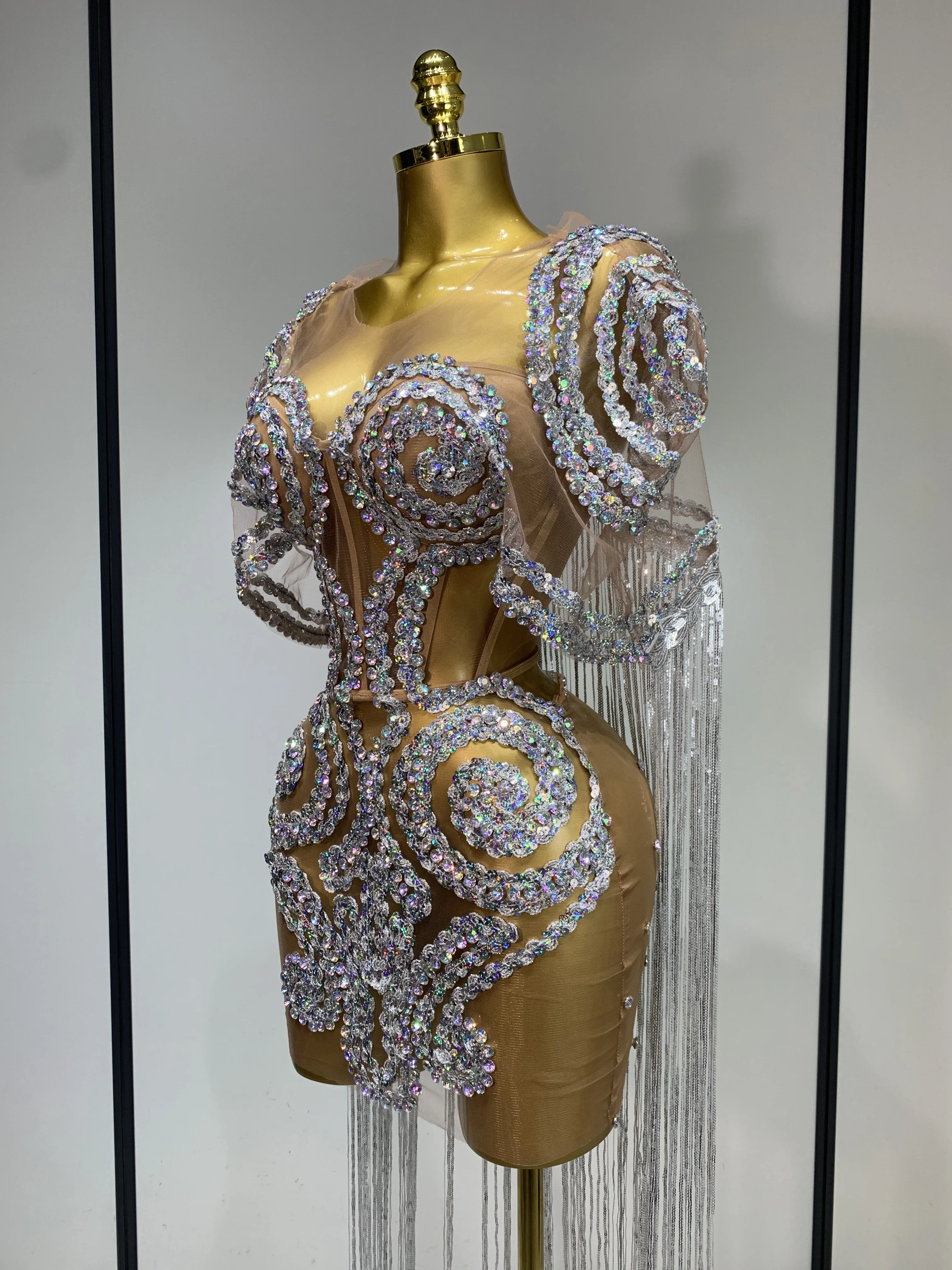 QueenLine Luxury Celebrity Sparkly Rhinestones Tassel Sexy Mesh Transparent Short Evening Birthday Dress