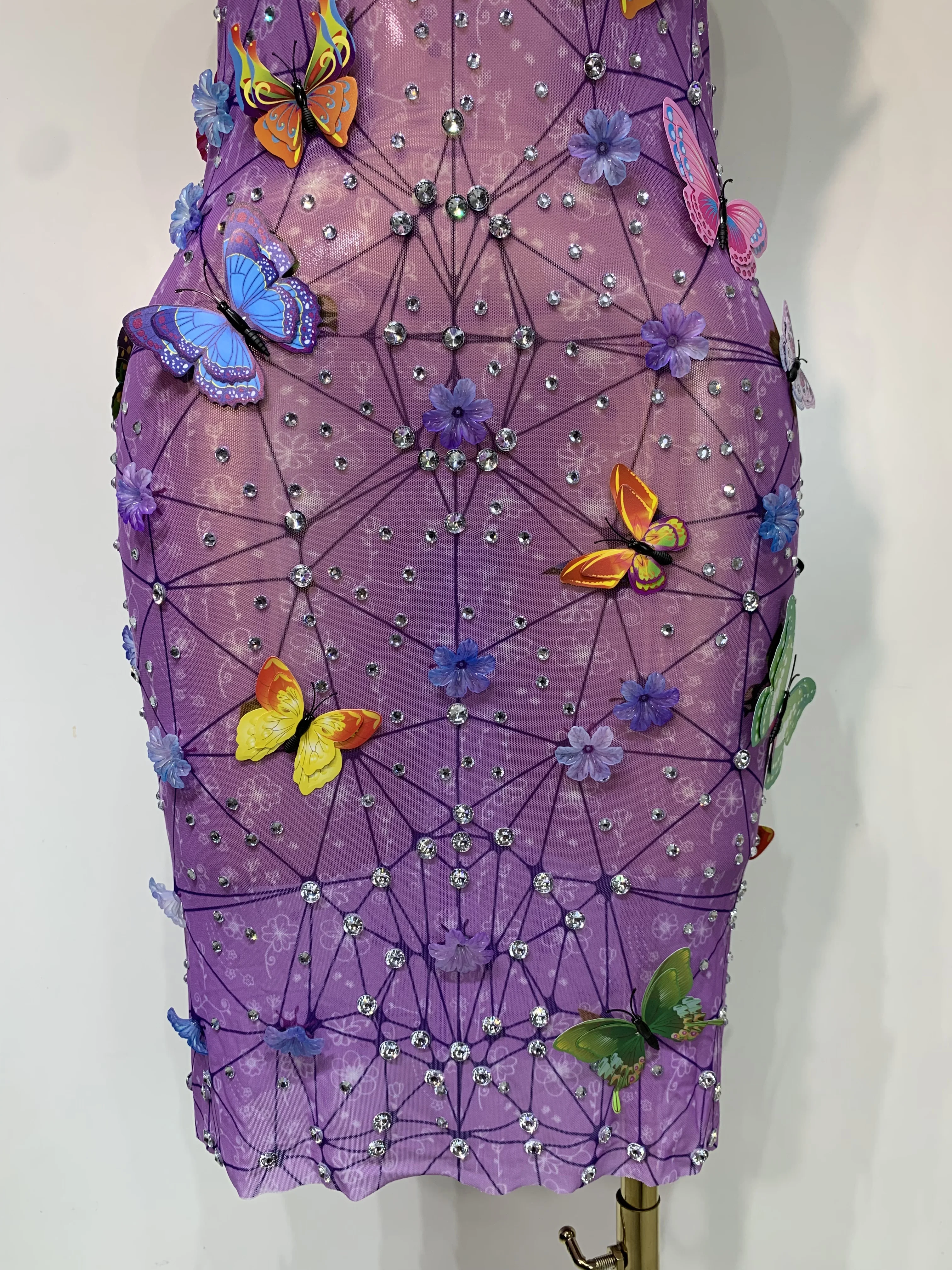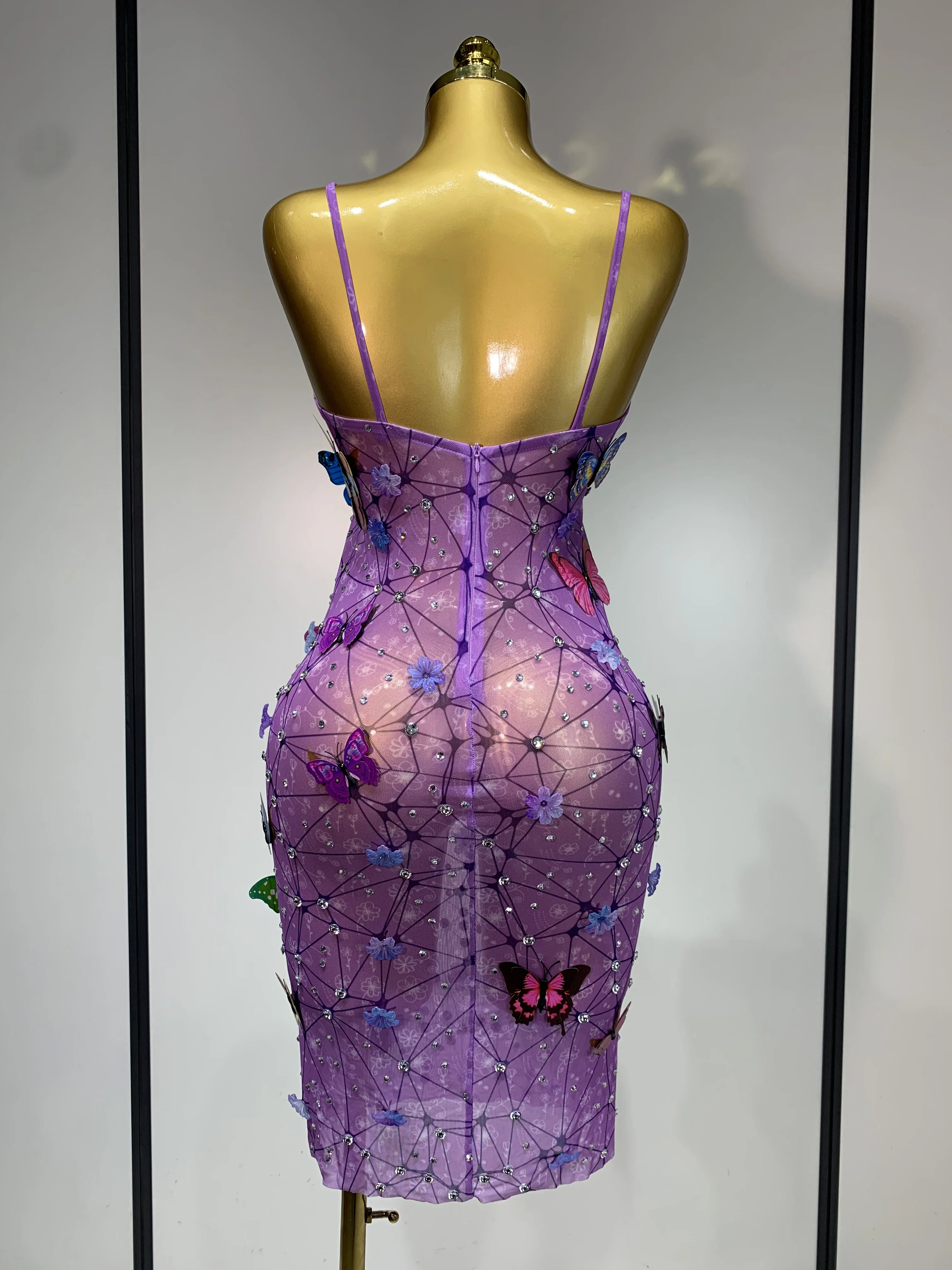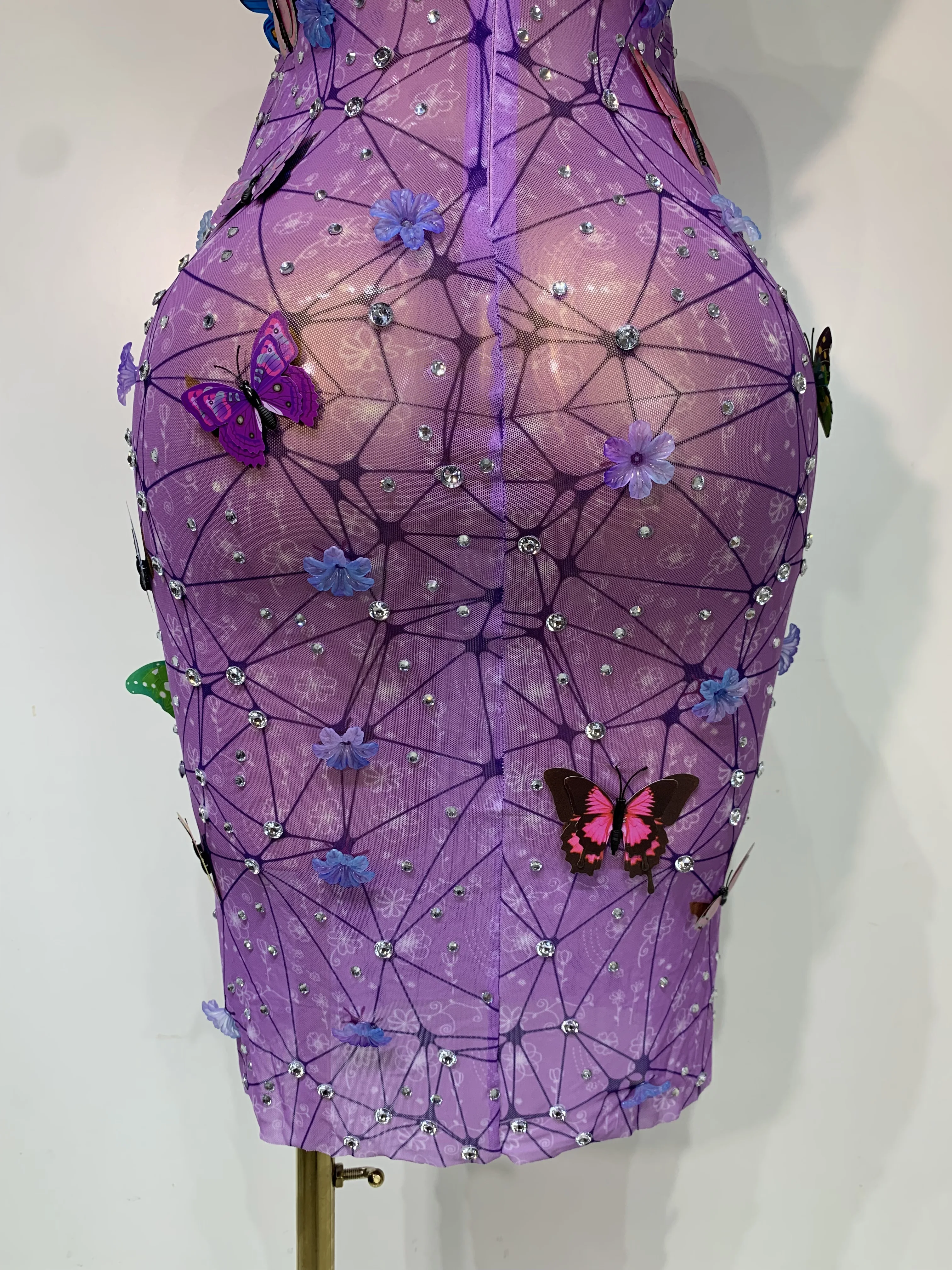 QueenLine Luxury Celebrity Sparkly Women Sexy Mesh See Through Butterfly Purple Birthday Dress