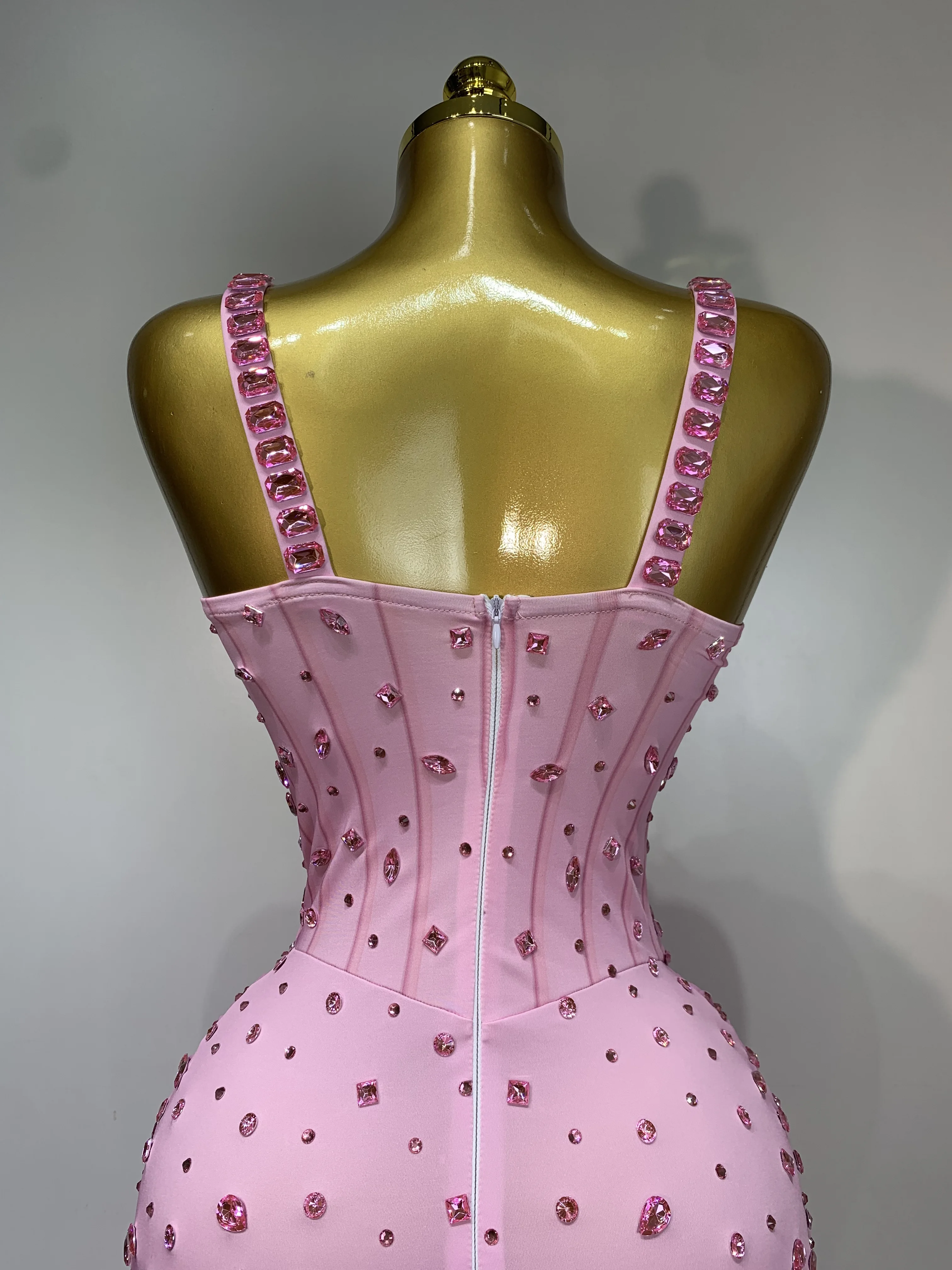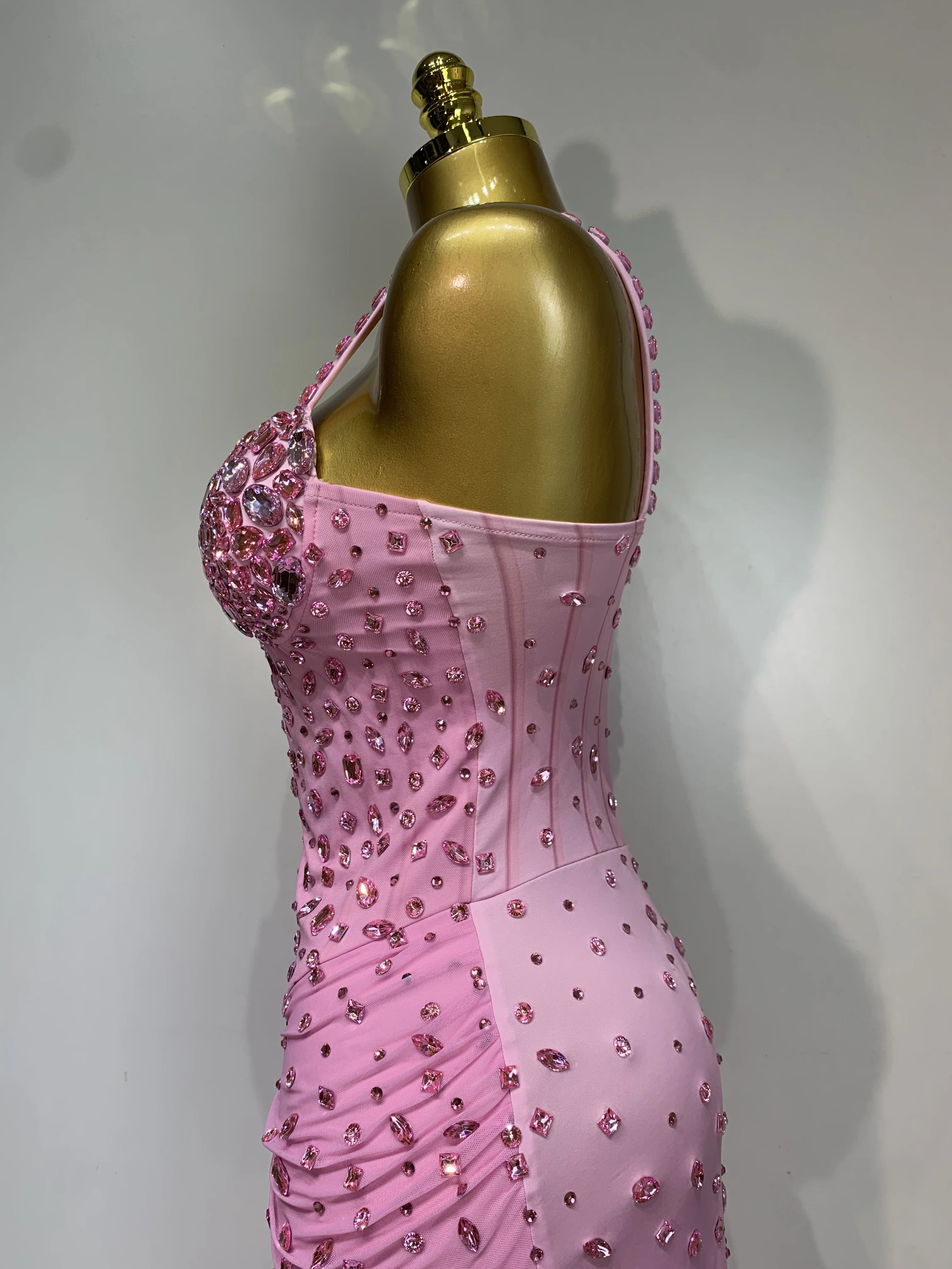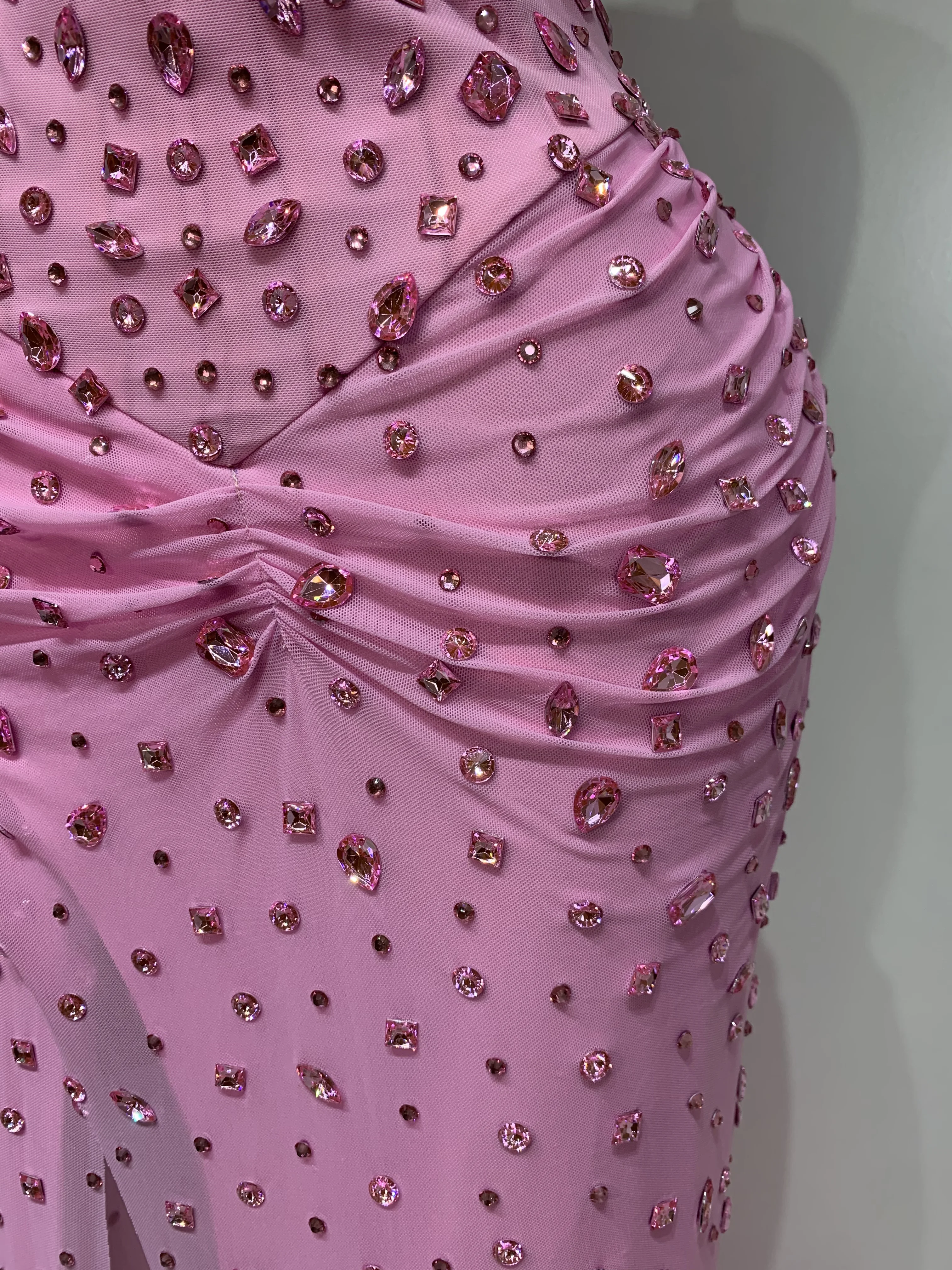 QueenLine Luxury Elegant Celebrity Sparkly Pink Crystal Maxi Long Evening Wedding Guest Dress