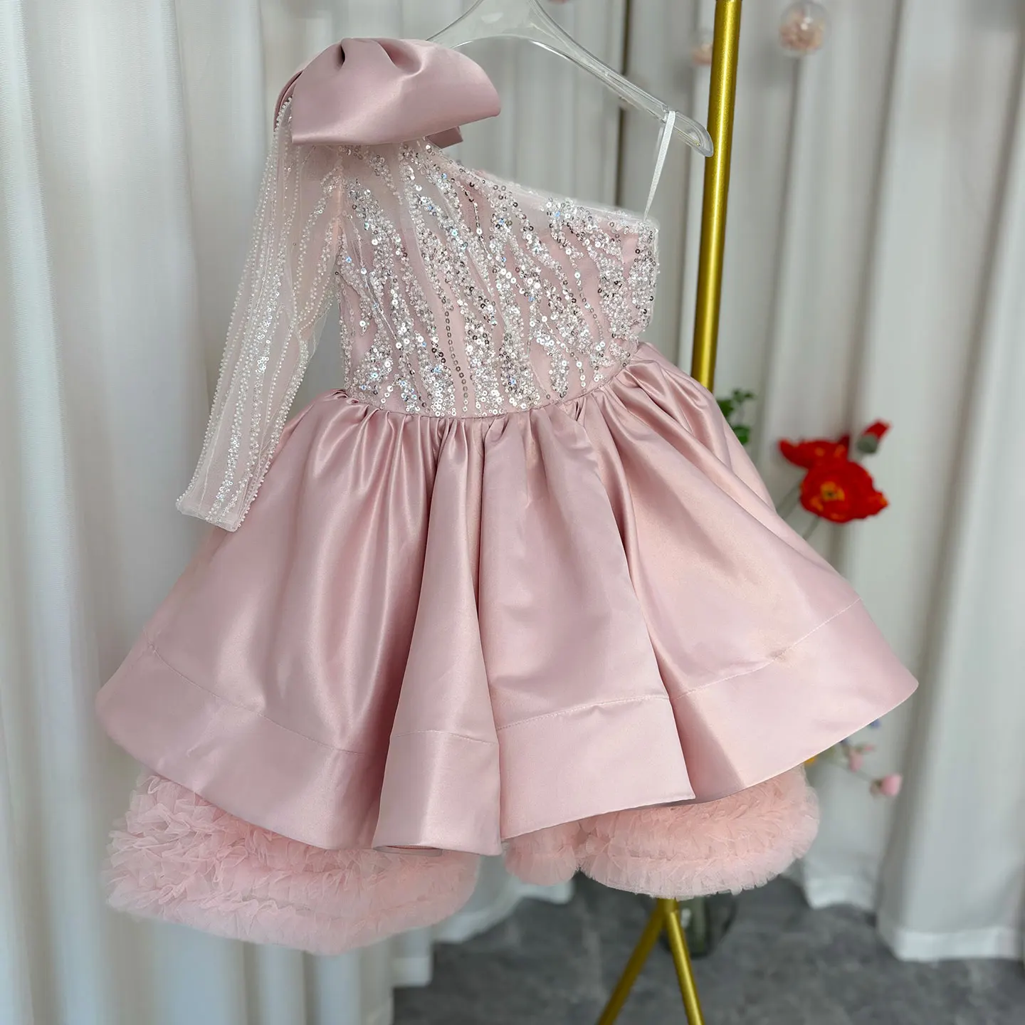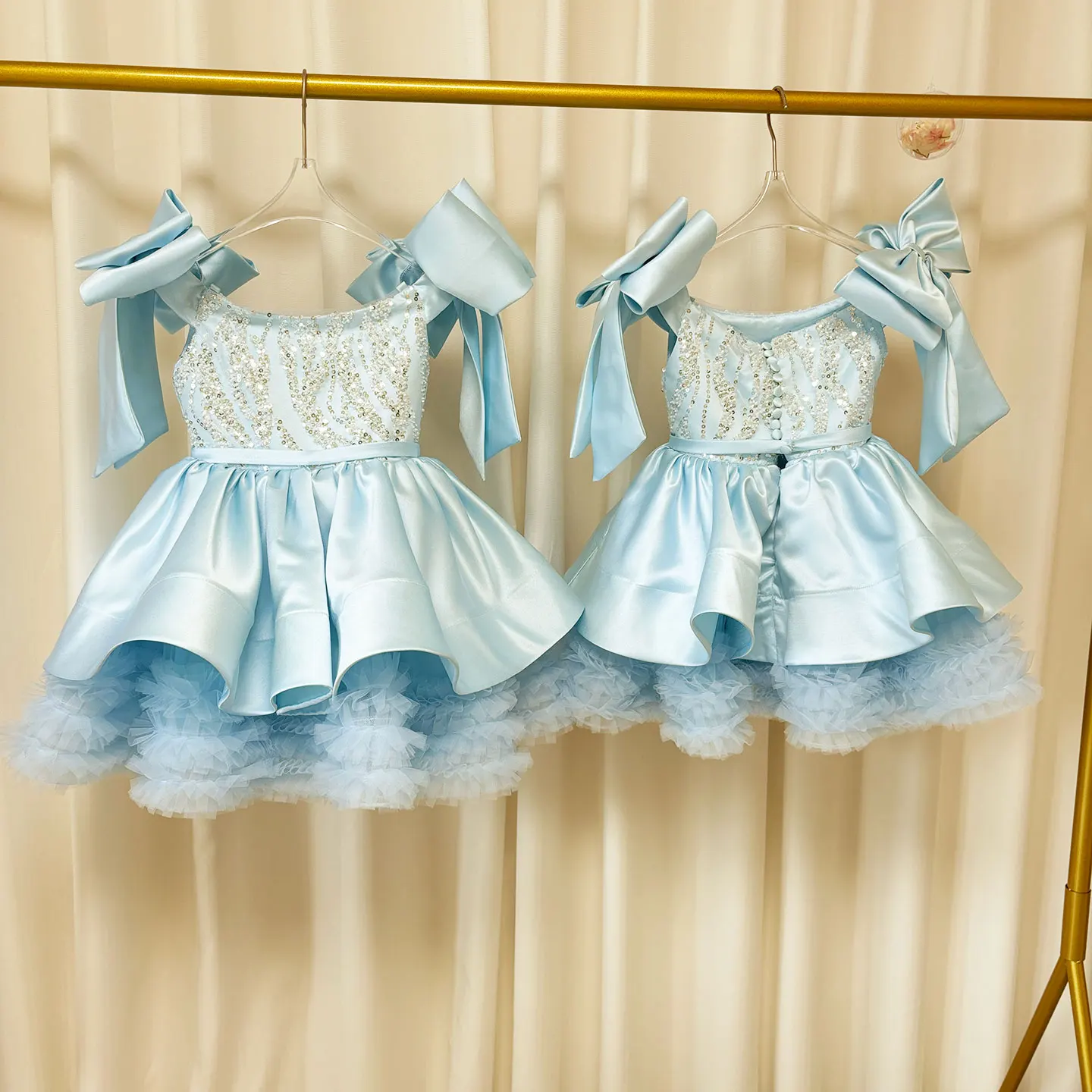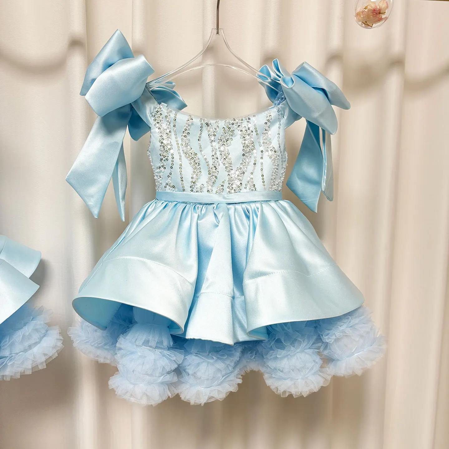 QueenLine Luxury Elegant Pink Flower Girl Bow Sequined Blue Princess Wedding Communion Dress