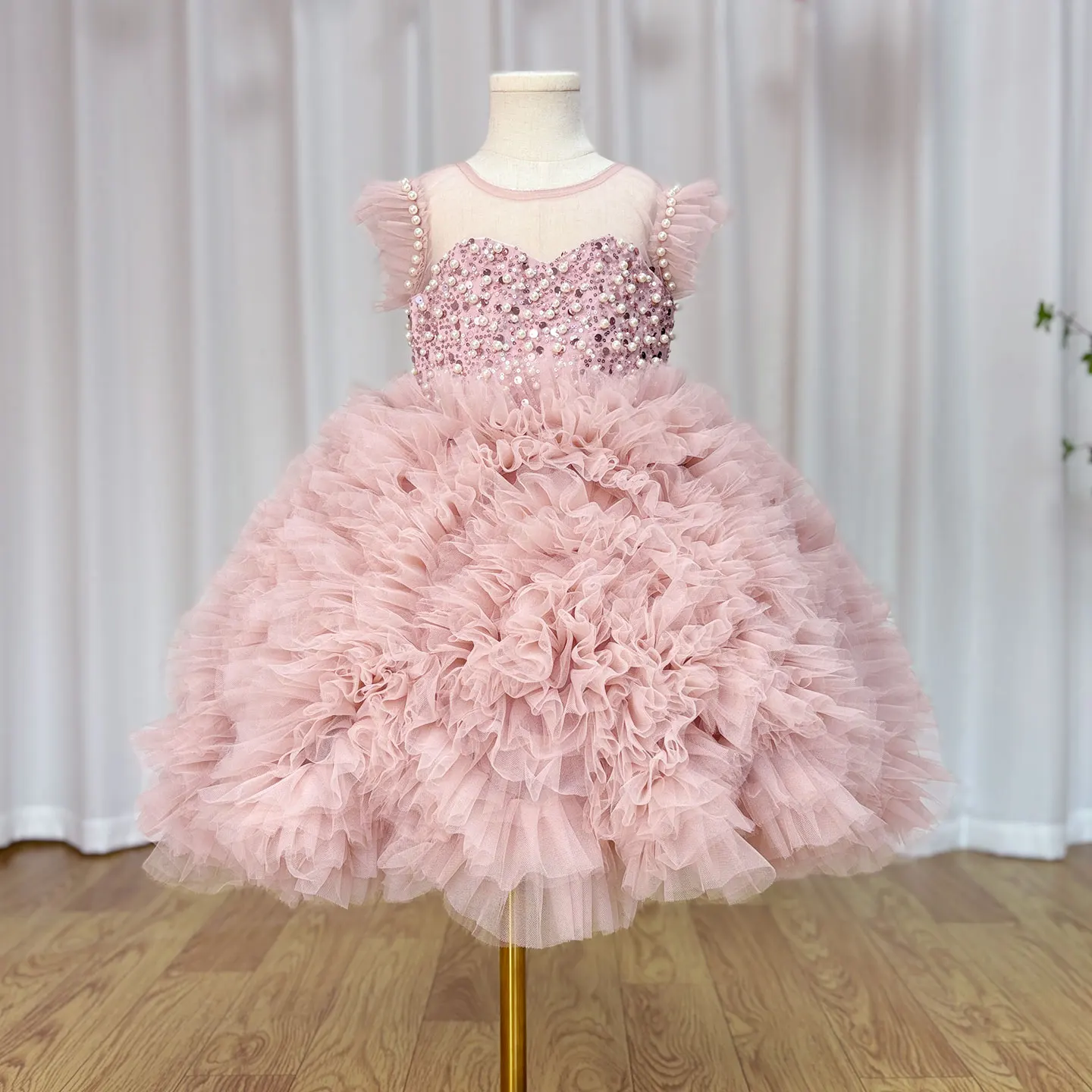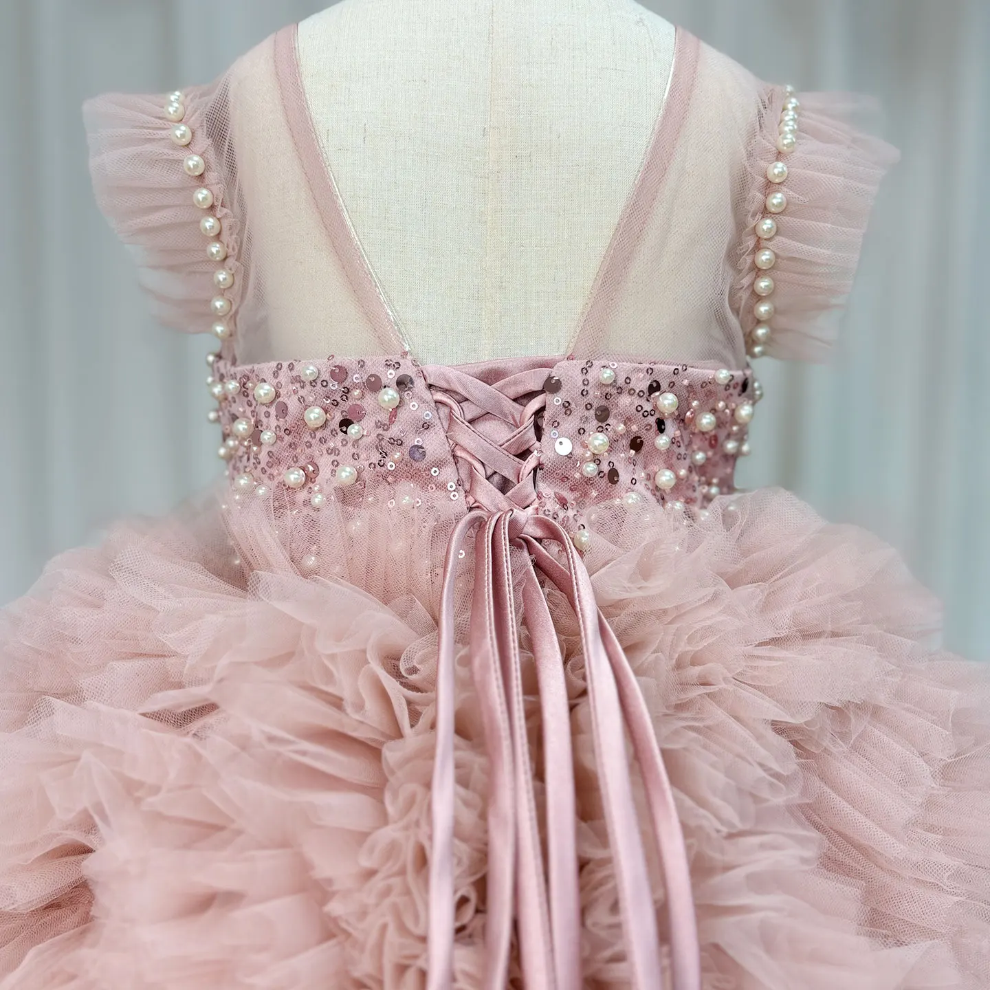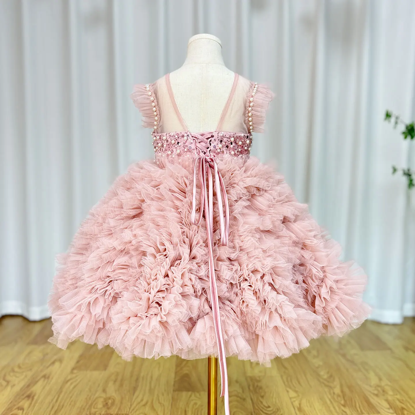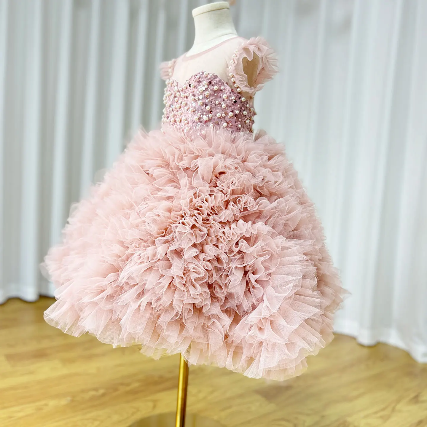 QueenLine Luxury Pink Baby Flower Girl Arabic Pearls Princess Ball Gown Wedding Dress