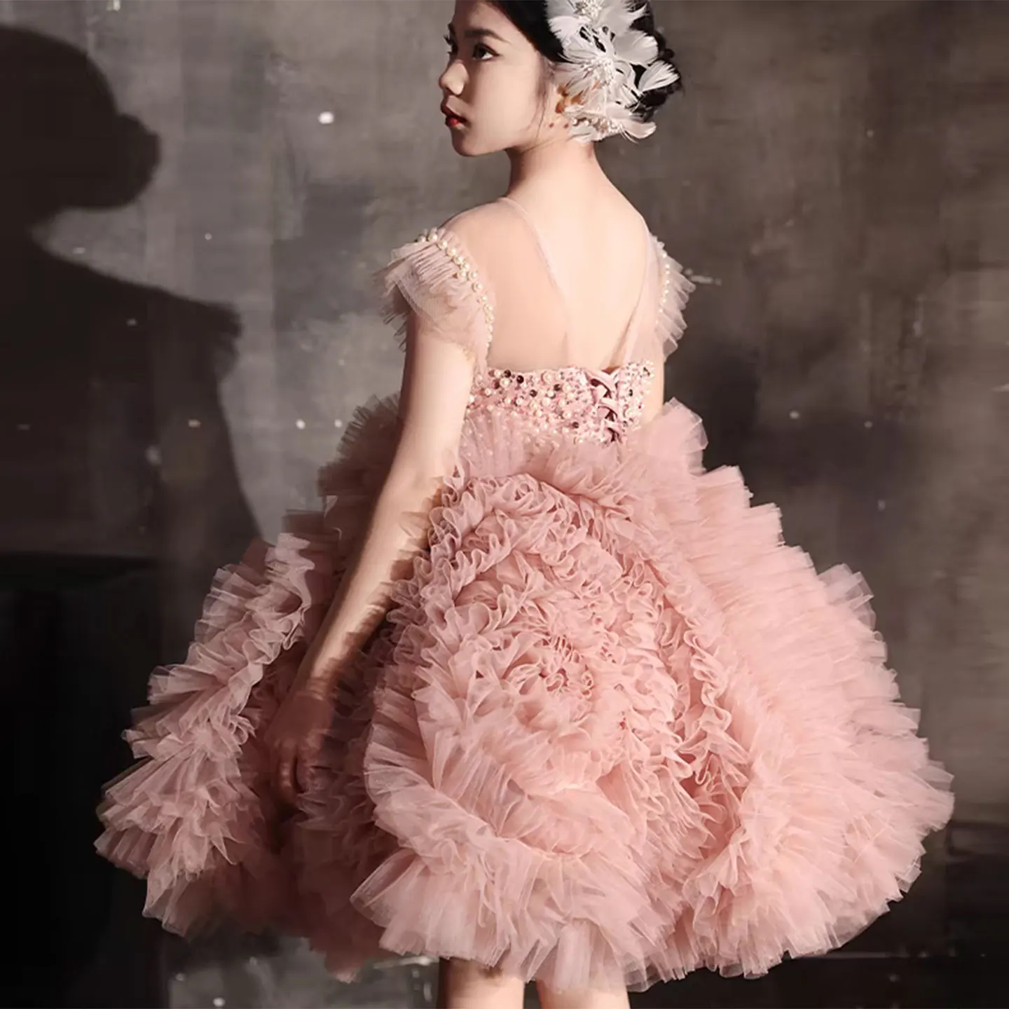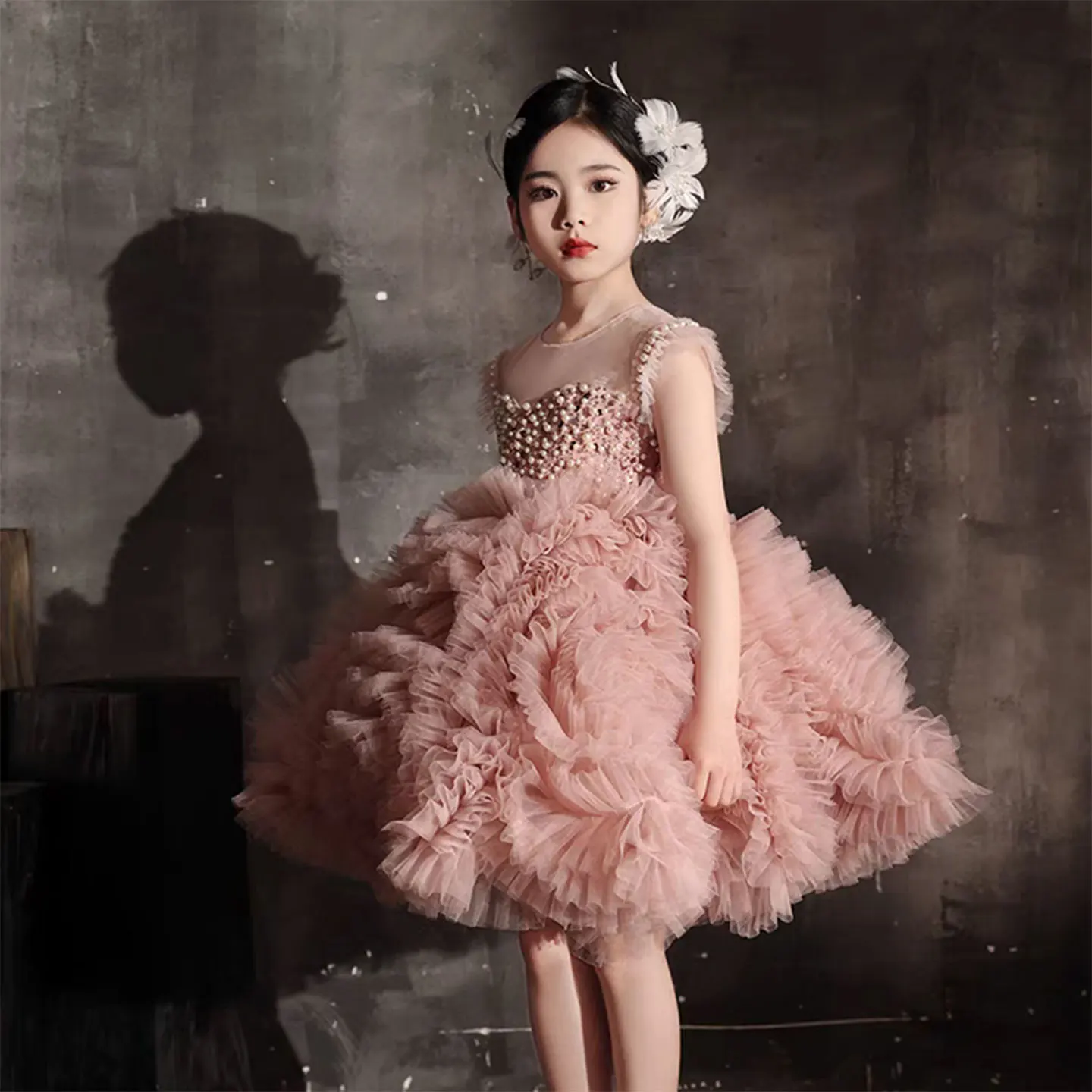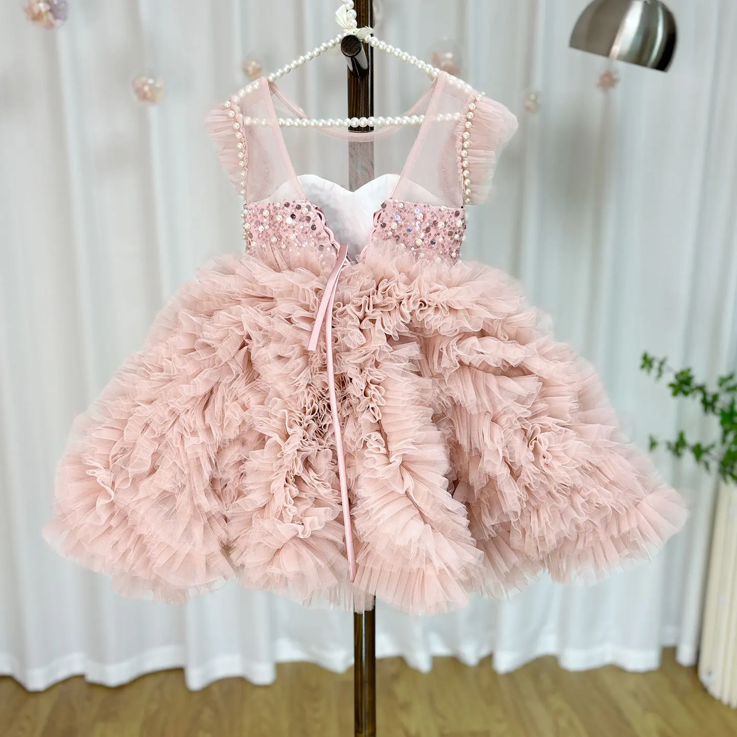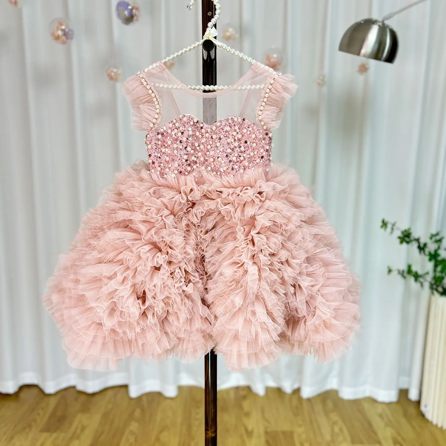 QueenLine Luxury Pink Baby Flower Girl Arabic Pearls Princess Ball Gown Wedding Dress