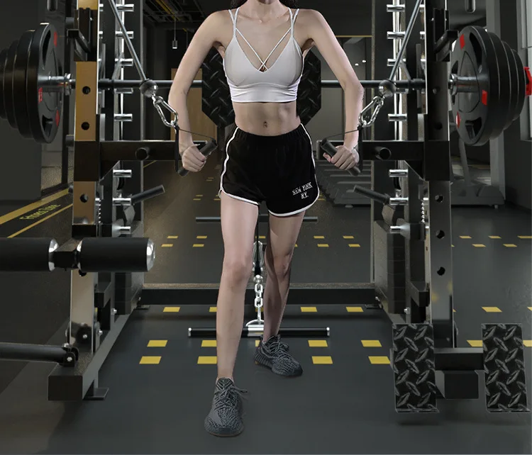 The left and right sides of the Smith machine are equipped with adjustable direction-changing pulleys. The height of the pulleys can be adjusted by pulling out the elastic plug. The height range: 365mm- -1765mm, 11-position height adjustable, professional configuration, smooth and smooth movement.