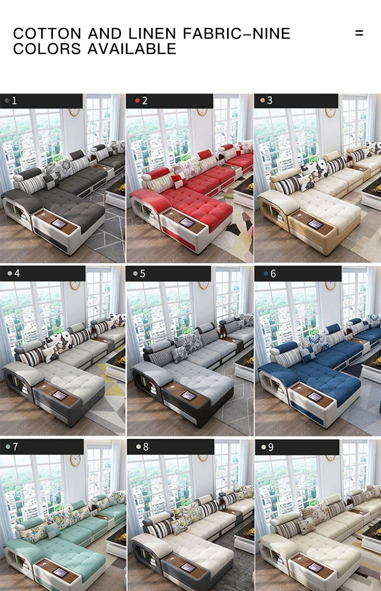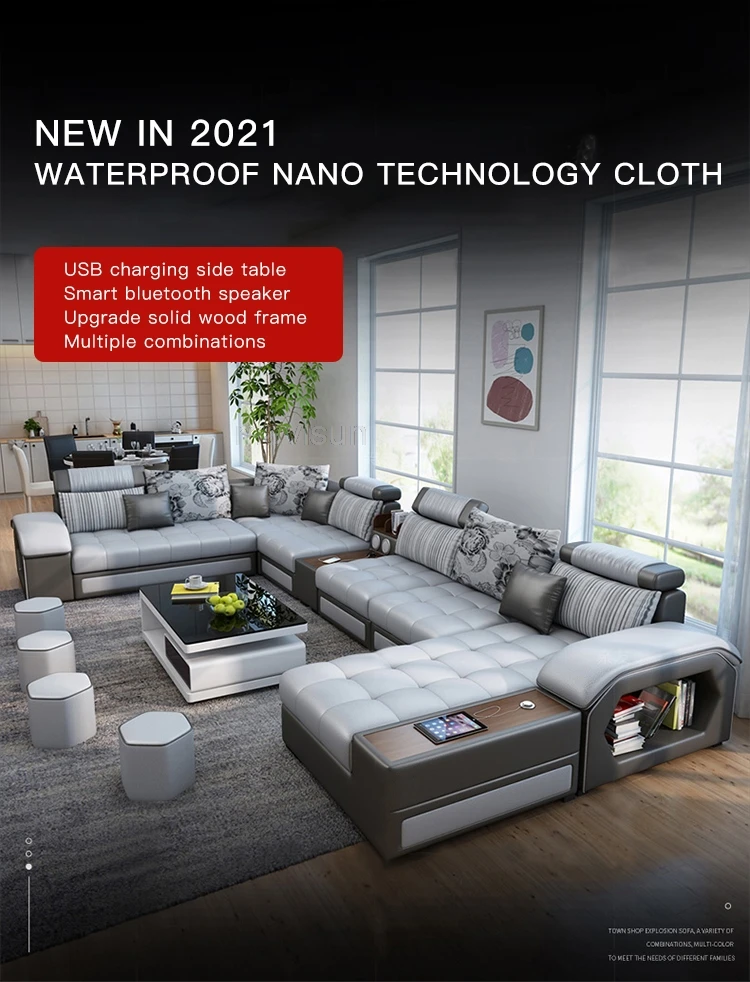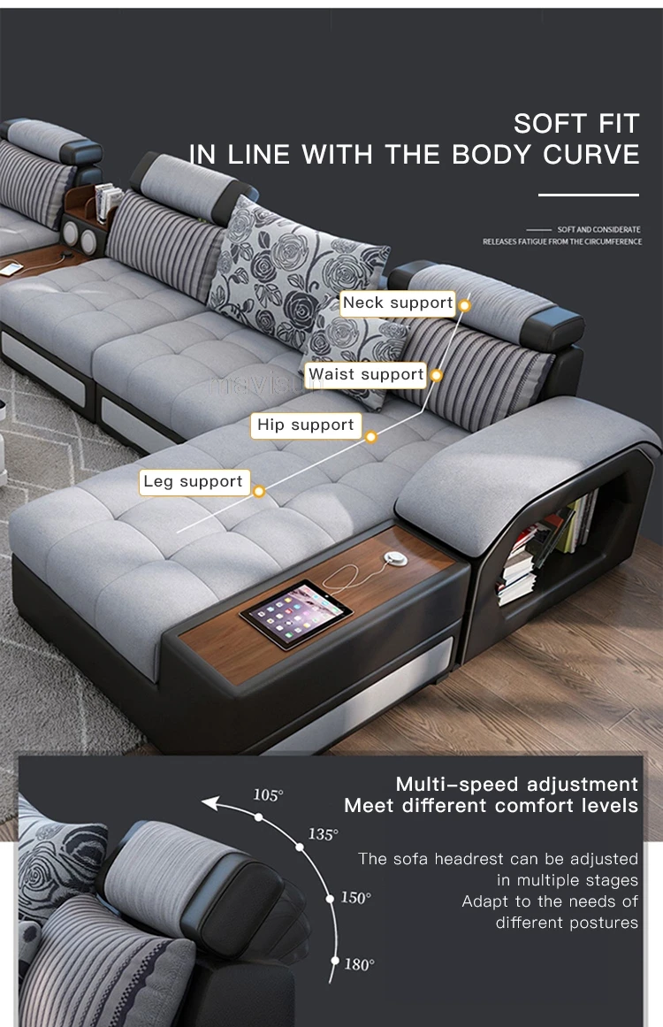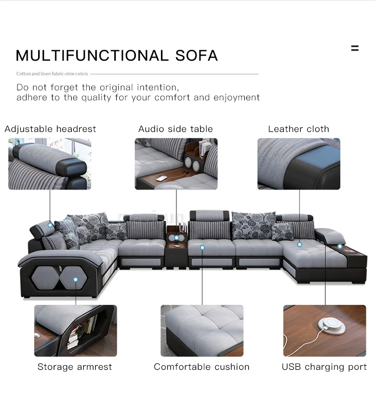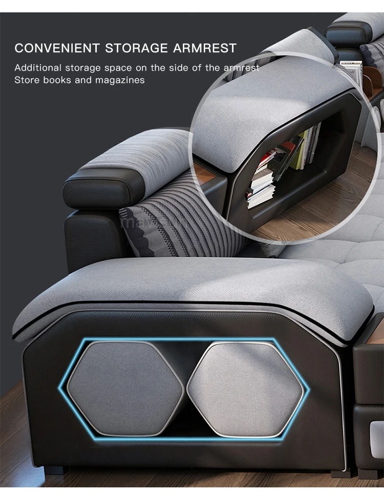 A. The sofa is equipped with a multifunctional side table with smart bluetooth speakers, a hidden locker and a usb charging port, bringing you a smart and convenient life.