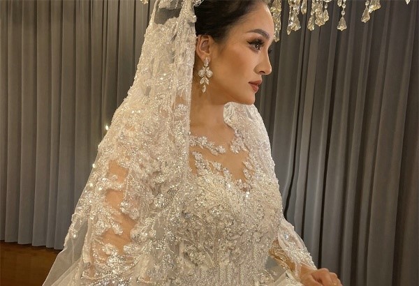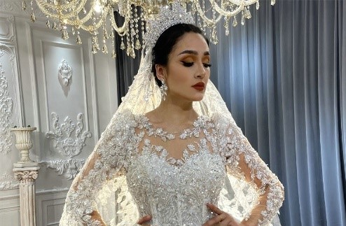 this is our designer try on the dress by herself, real dress much more beautiful !!
