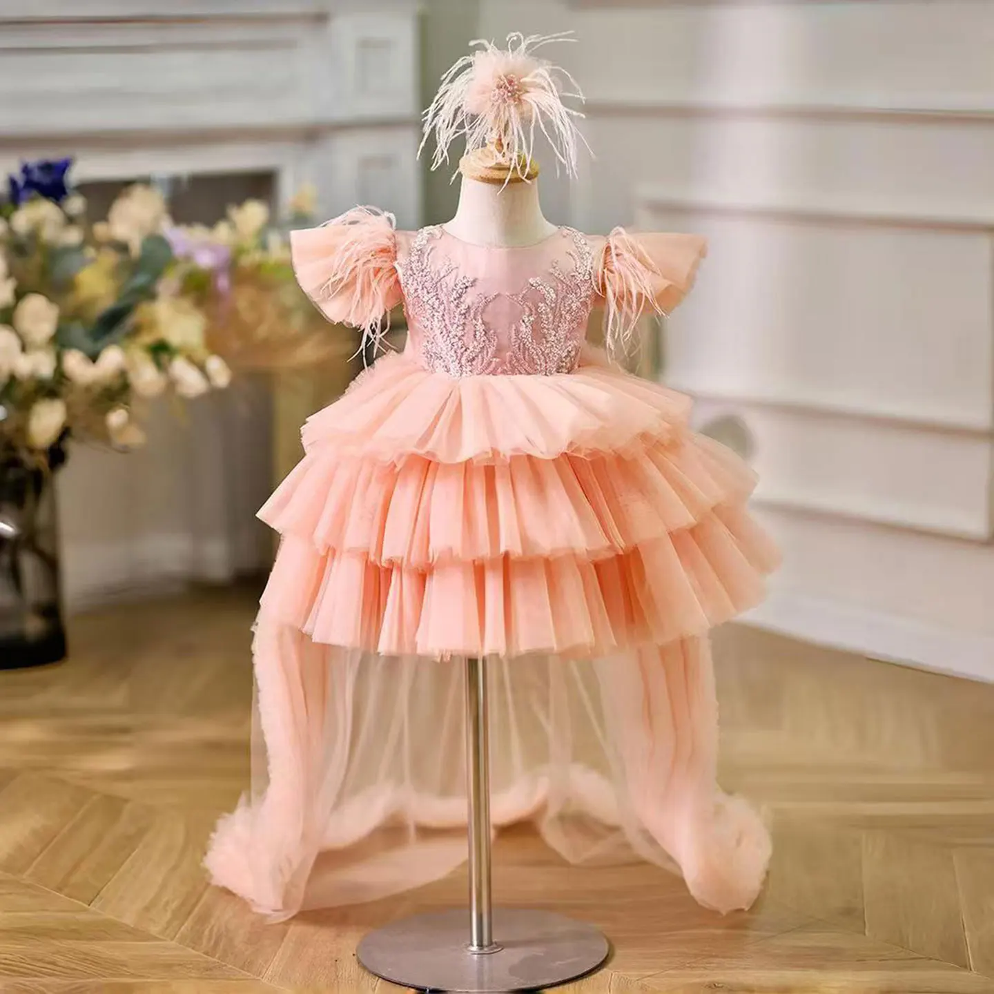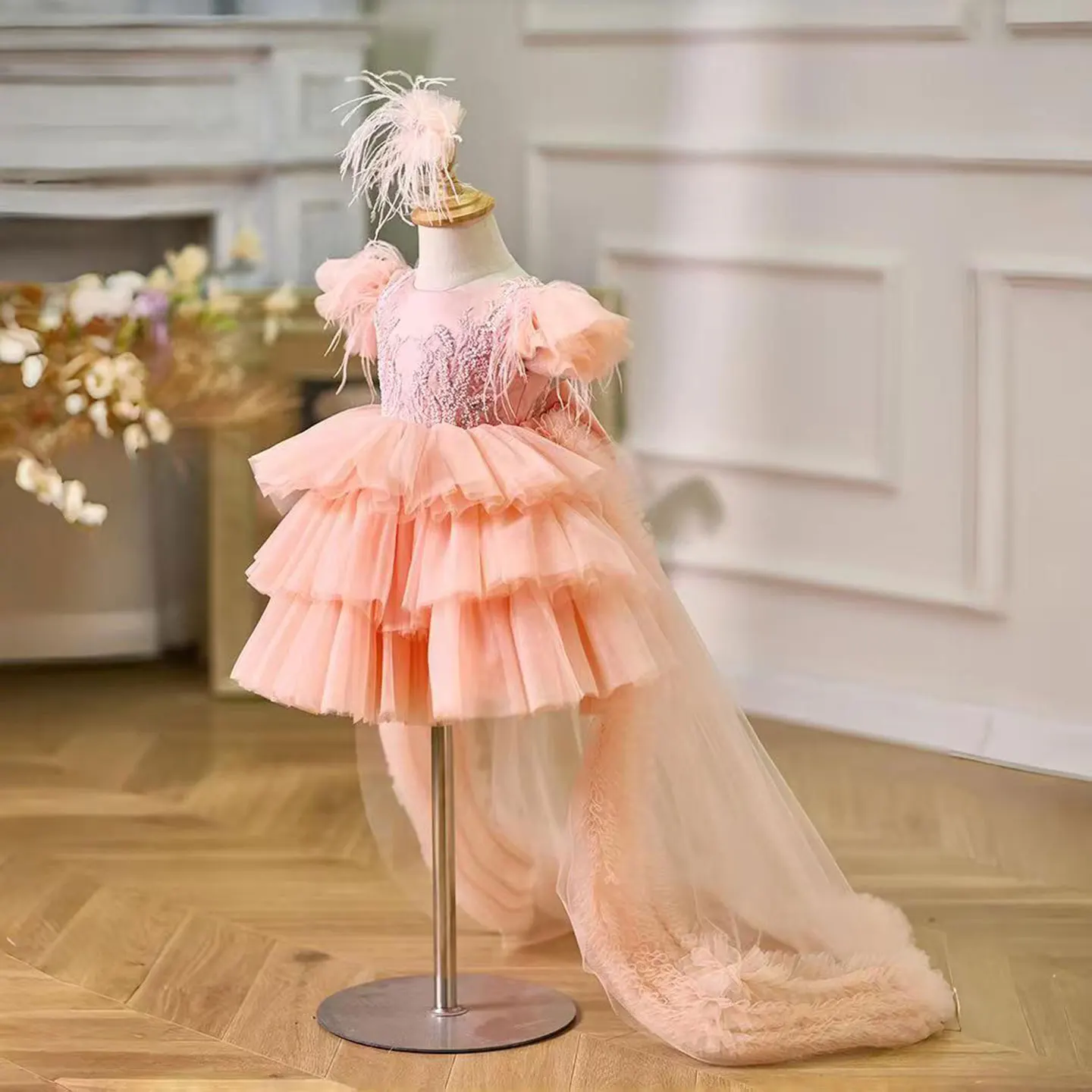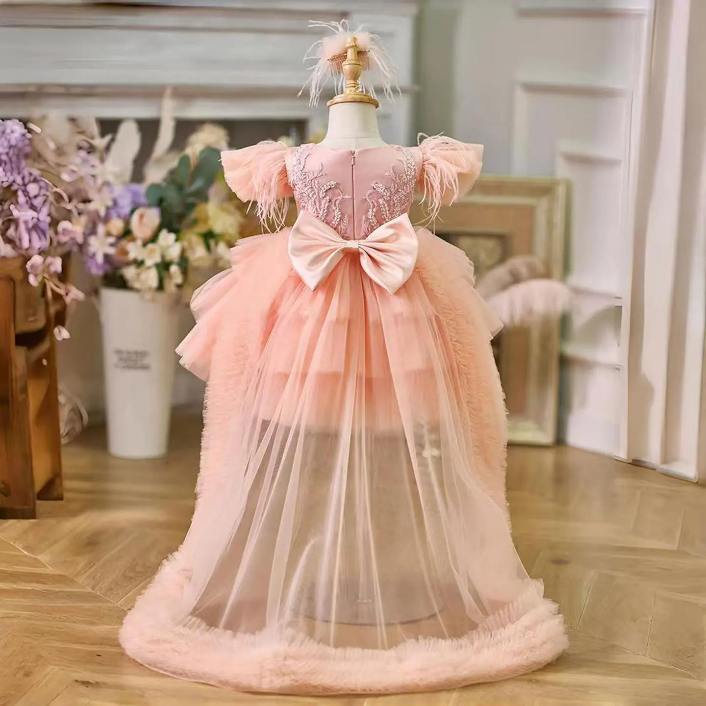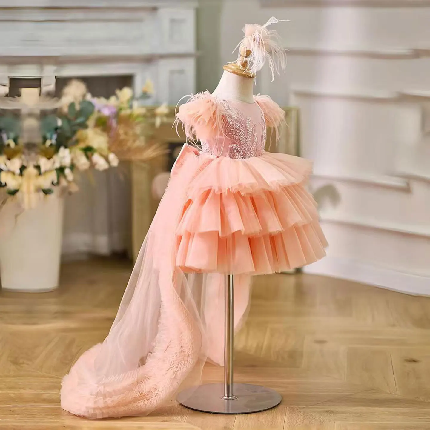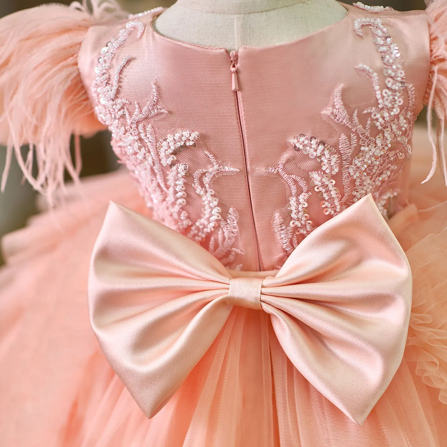 QueenLine Peach Baby Puffy Sleeve Beading Adorable Girl with Bow Knee Length Princess Wedding Birthday Dress