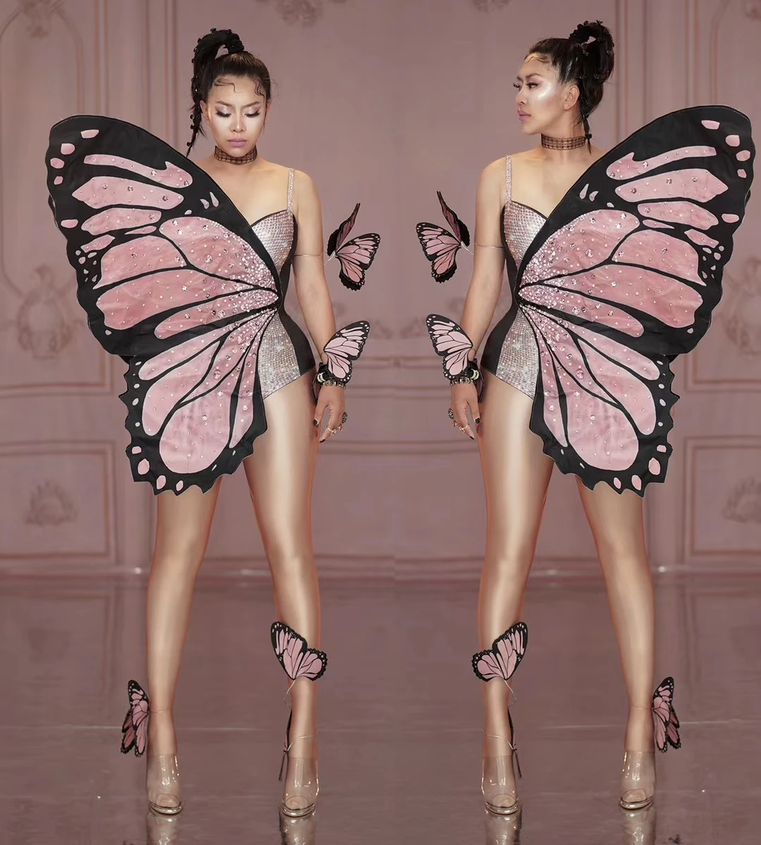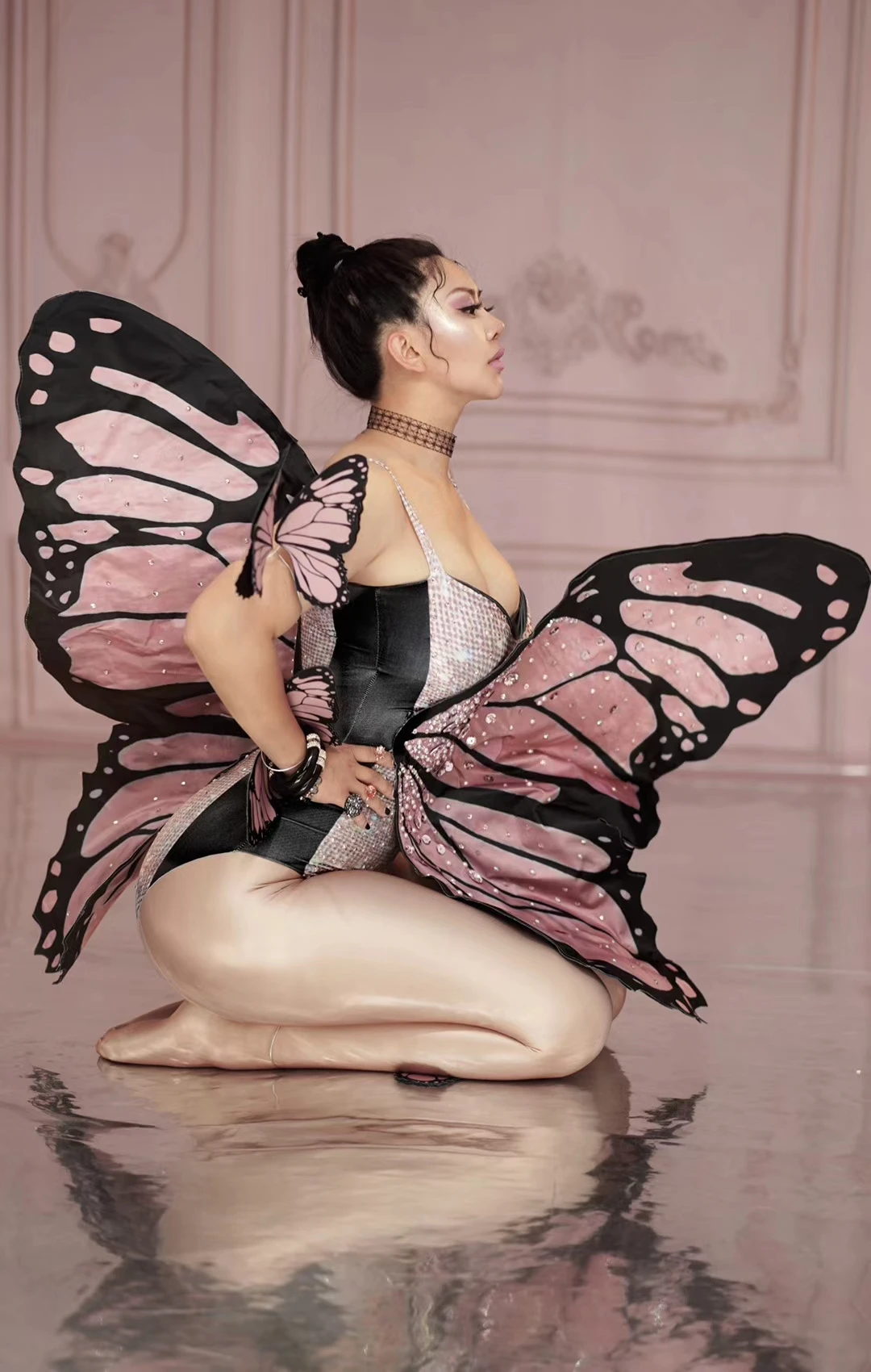 QueenLine Personality Butterfly Wing Stage Performance Costumes Women Elastic Sexy Rhinestone Bodysuit Nightclub DJ Singer Dancer Leotard