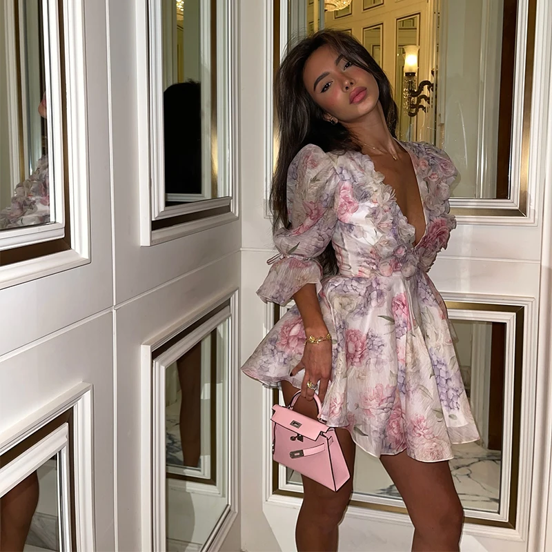 QueenLine Printed Lace Up 3d Flower Lady Sweet Sexy Backless Irregular Layered Pleated Fluffy Robes Mini Dress